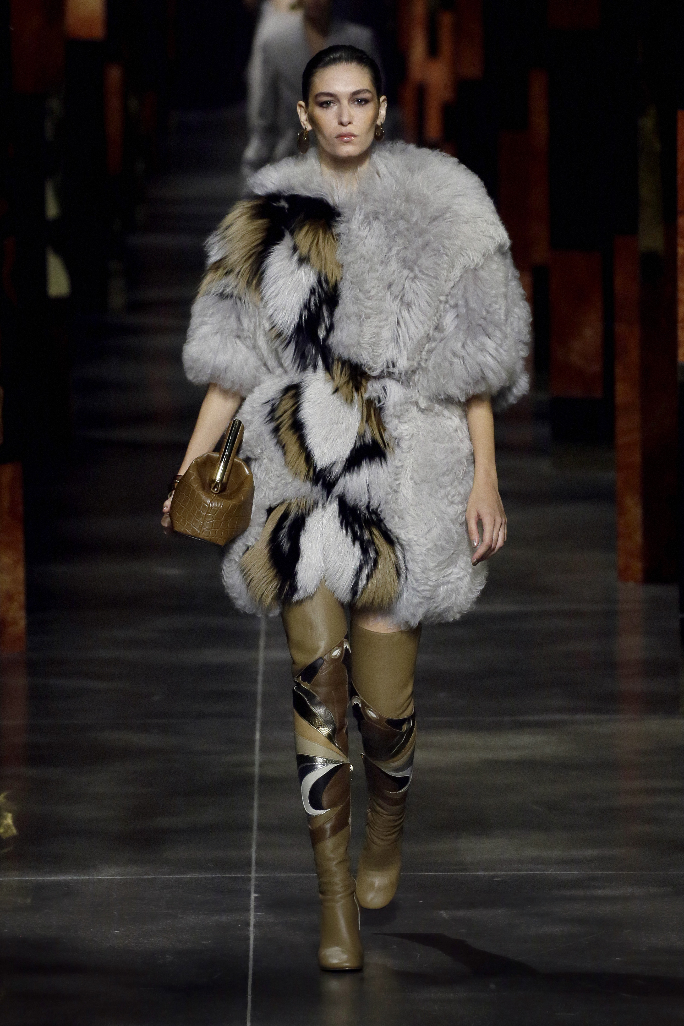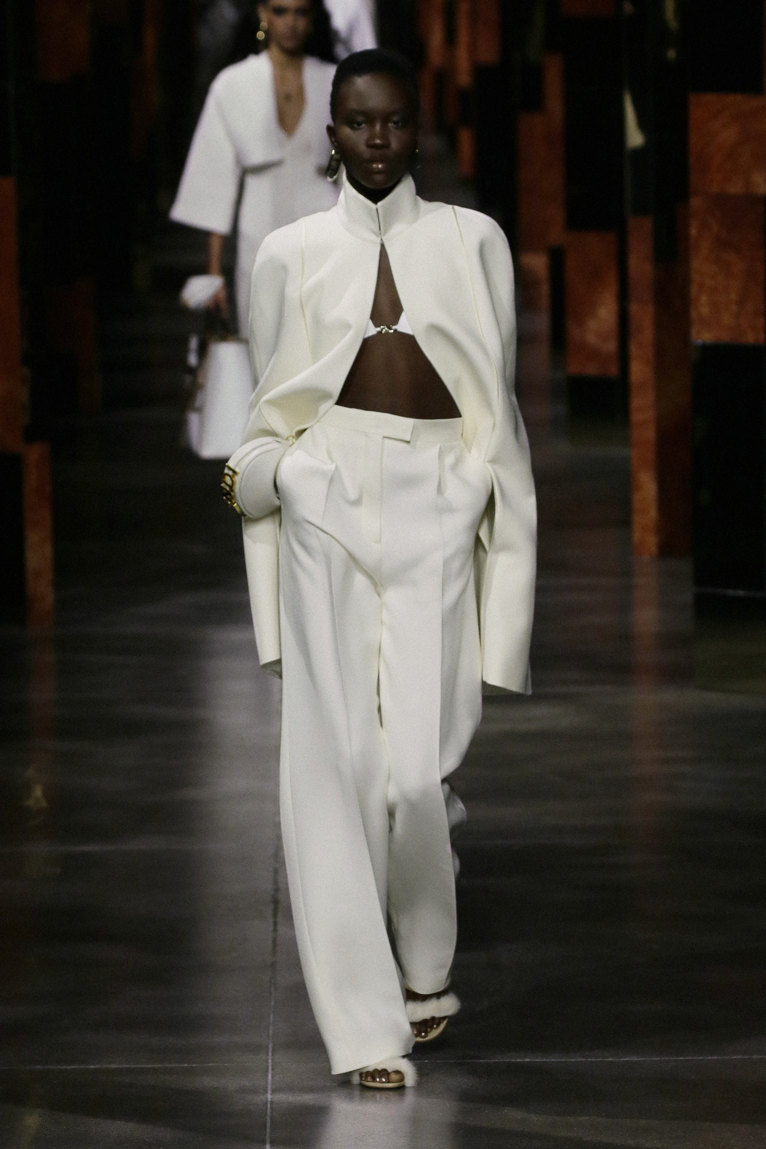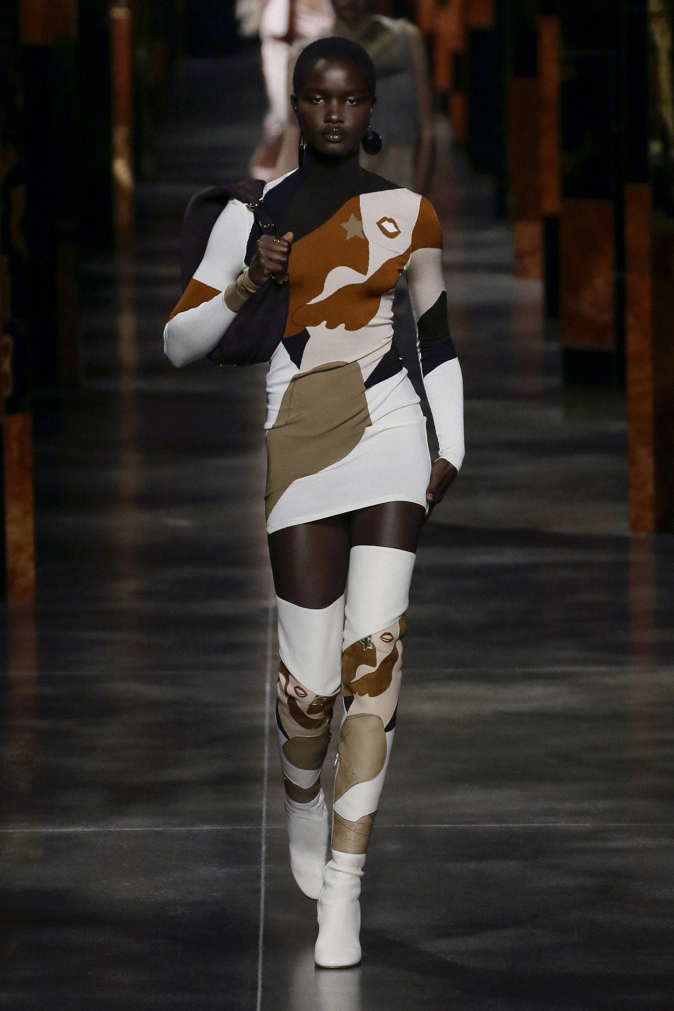 Mr. Kim Jones for Fendi revisits the joyful irreverence that has characterized the Maison since the beginning. He winks at the lines and style of the 90s disco by combining very short rectangle sheath dresses with over-the-knee boots. Fendi’s femininity for summer 2022 is different, it is powerful, it captures the beauty of the past and reincarnates it in a future with a thousand perspectives. The drawings of the illustrator Antonio Lopez dig into the archives of the Roman brand and become the starting point for prints that seem to be an ode to Studio 54 and to his loyal artists Andy Warhol, Steven Meisel, David Hockney. The designs become the favorite pattern of pastel-colored caftans, silk shirts, inlaid leathers, lace, and shimmering jacquards. Together with them, proud one-color suits with cropped blazers and waistcoats with unusual volumes and wide-leg trousers with a very high waist parade. The Maison’s iconic bags adorn the looks by rediscovering themselves in rainbow-hued Baguette, Peekaboo transformed into graphic works of art and a bold FENDI First becomes the symbol of rebirth.