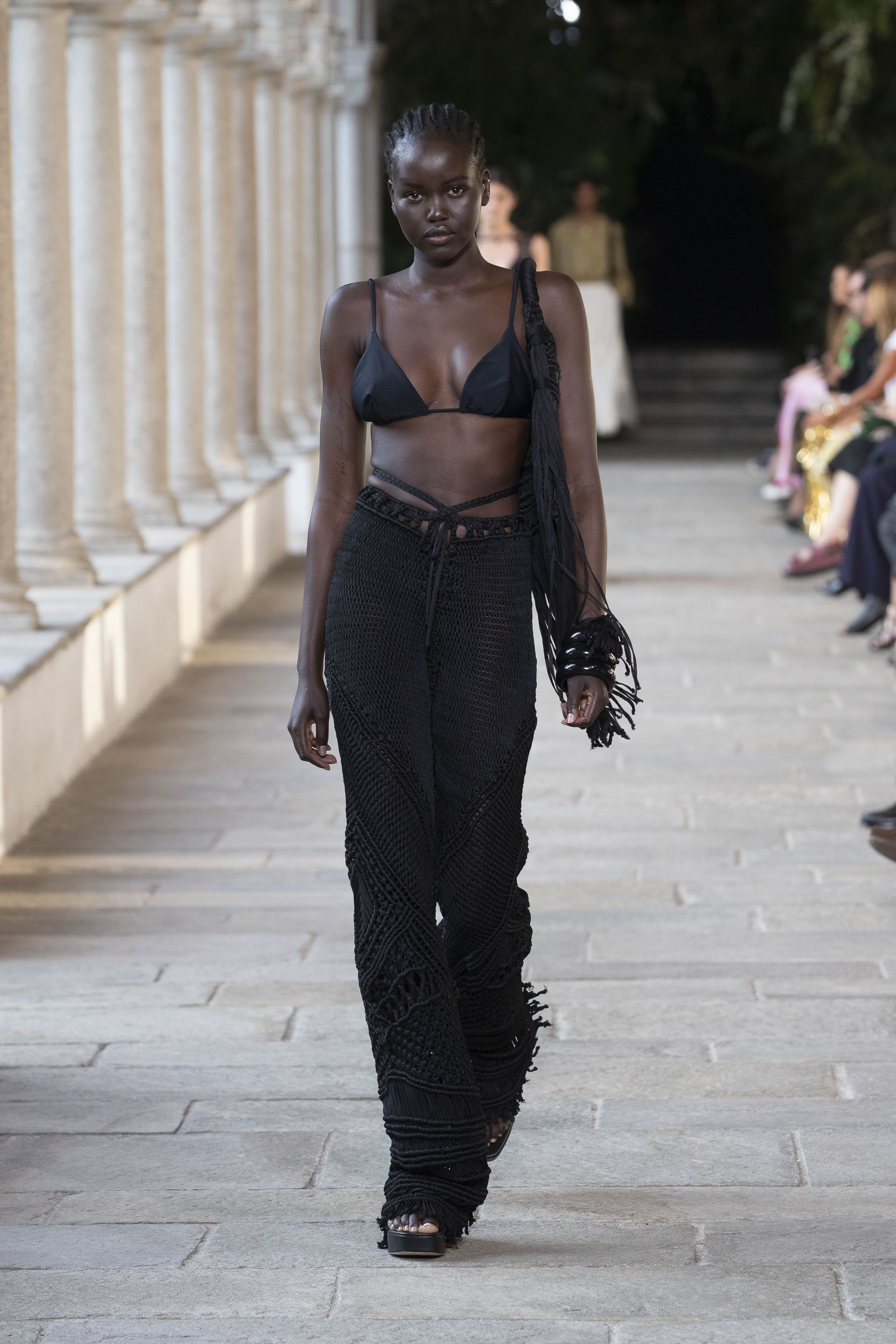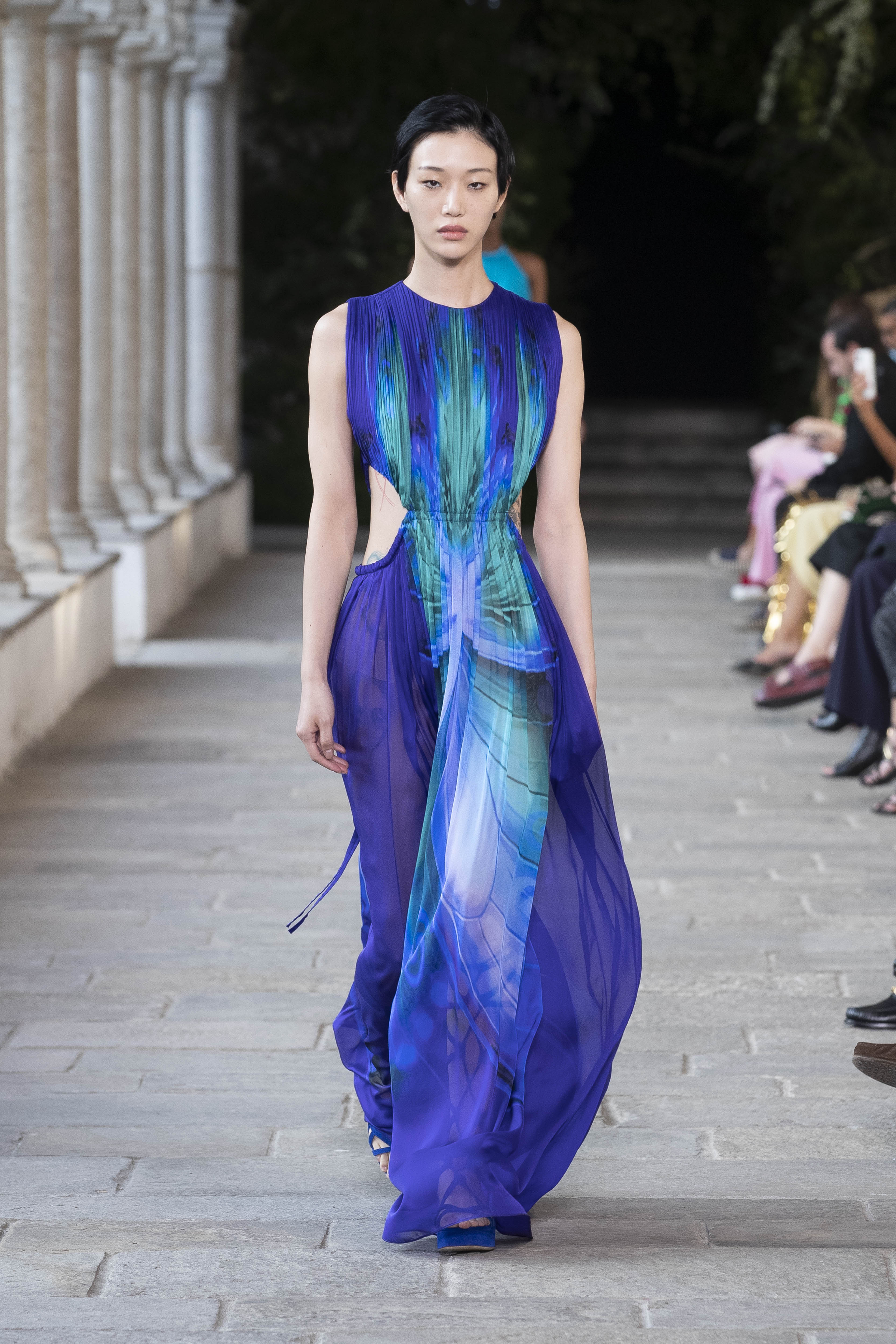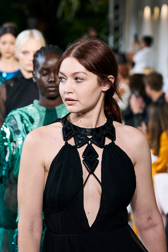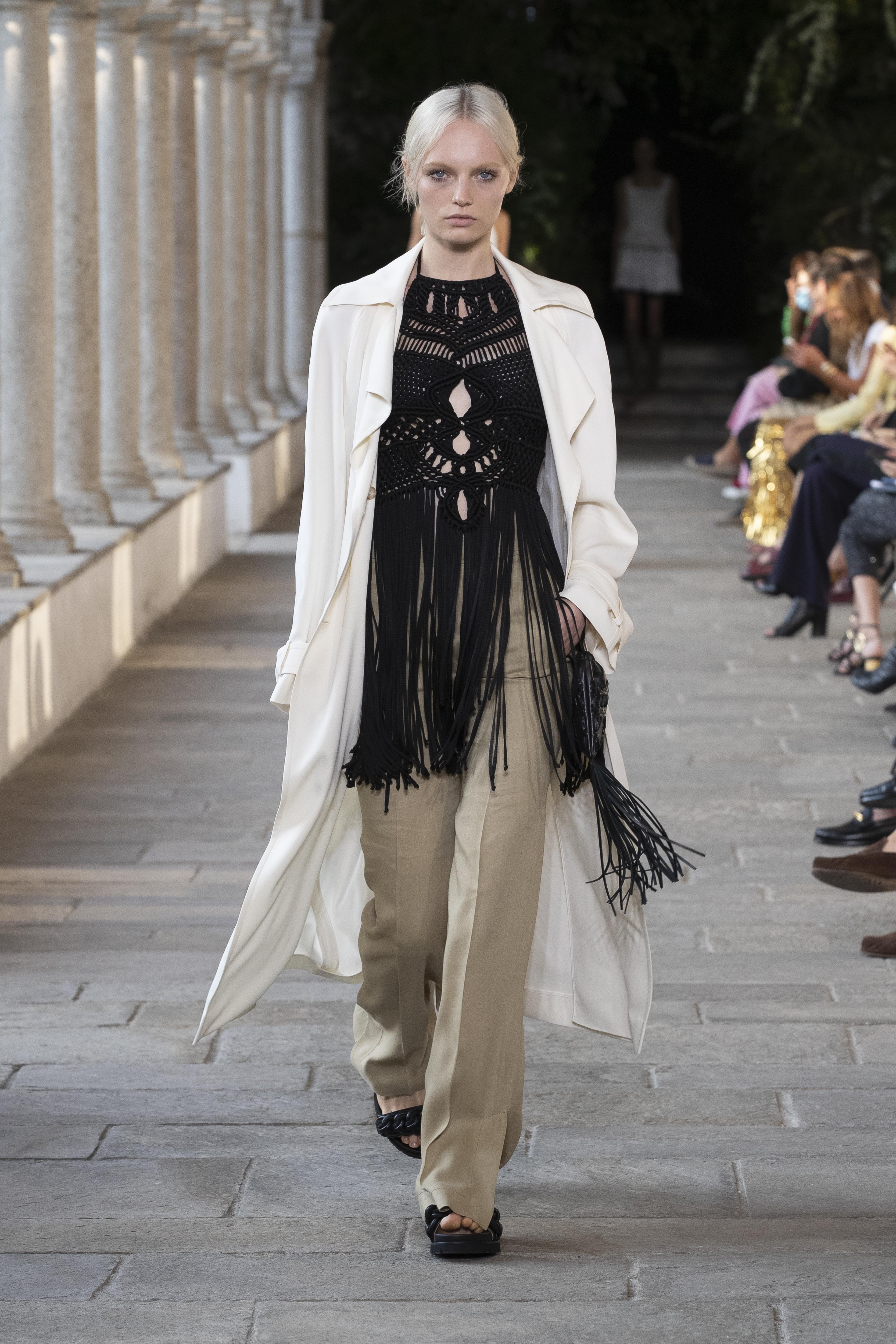 Light and material, the SS 22 collection by Alberta Ferretti takes up the unmistakable signs of a Maison that has always told and celebrated women. Women who are made of opposites, like the collection dedicated to them for next season. The lengths are extreme, now very short and almost cheeky, now extra-long and floating. The volumes are soft, airy or sculpt the figure without hiding it. The garments are stratified in coordinated suits or are declined in garments with cut-out details that leave a side, back or waist in view. Also for Alberta, the colors are soft and recall nature in all its forms, from the earth to the stones with palettes of ruby, turquoise, emerald and amethyst. Black is a great protagonist of crochet tops and dresses, soft silk blouses, kaftans and cargo pants. Sangallo details mix with safari looks celebrating a rediscovered and dear elegance. Masculine jackets blend with fringes that dance and seduce together with knots, weaves, and drapes to characterize tops, dresses and trousers with deep pleats. Small bags and gladiators’ flat sandals complete the looks.