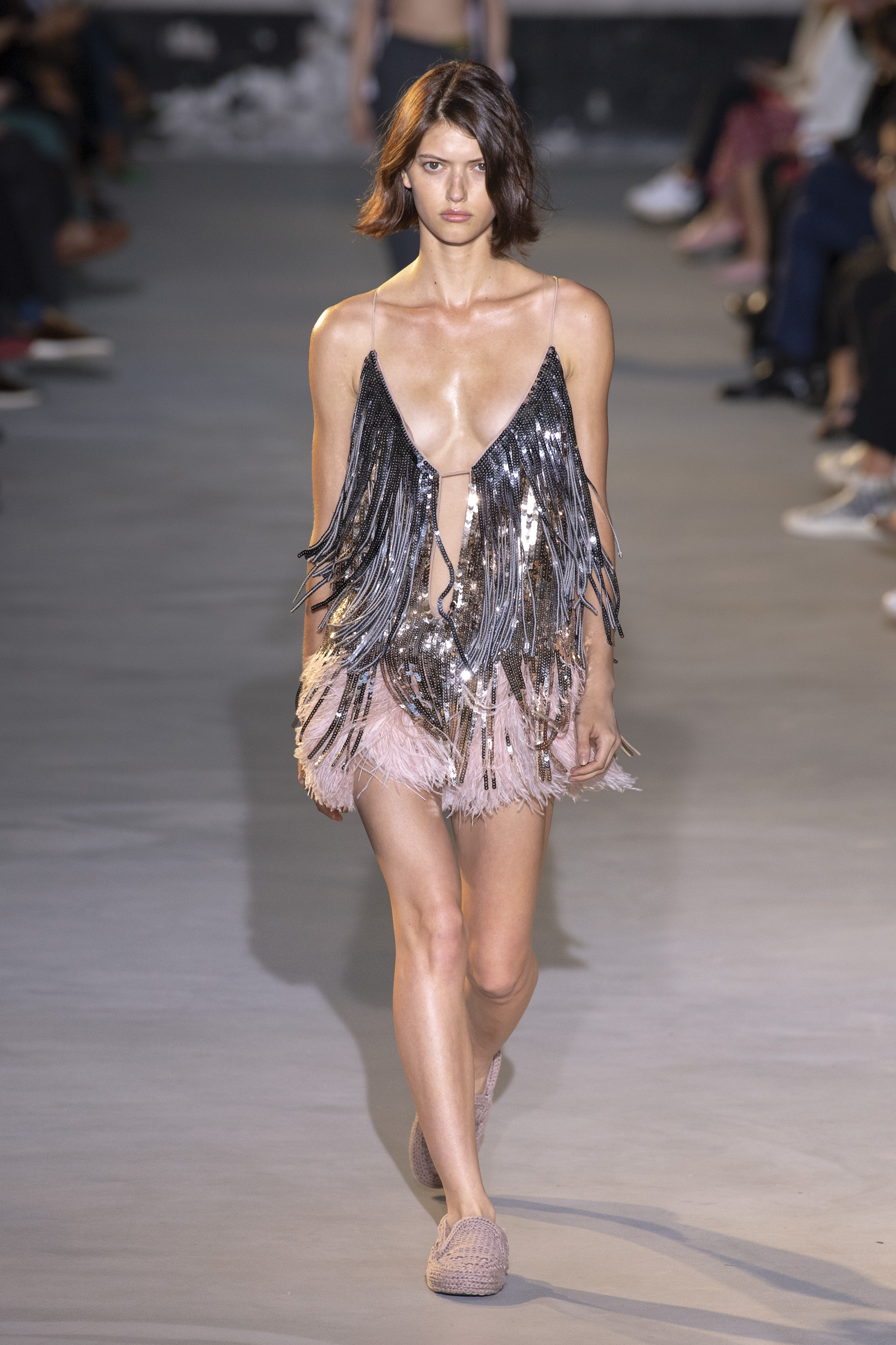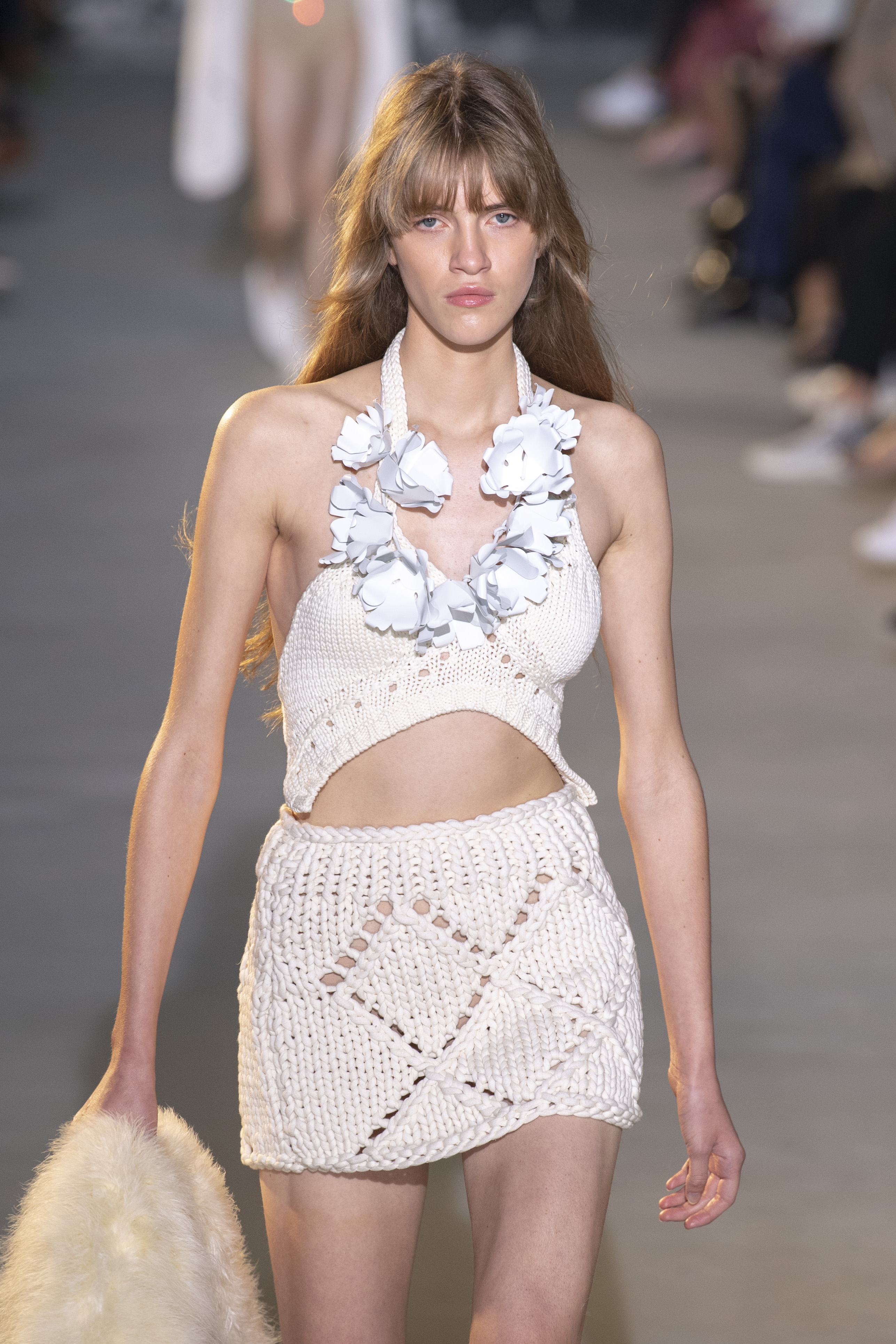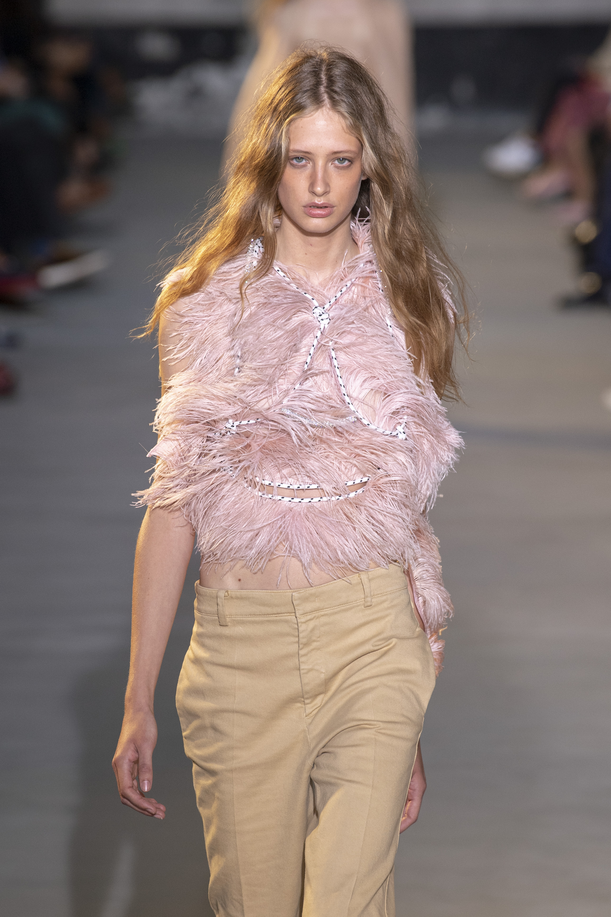 Knit is the protagonist of the SS22 collection created by Alessandro Dell’Acqua. A unisex wardrobe that plays with the soft textures of cotton and suede, declining them now in full-length trousers, now in coordinated suits with Western charm. Also for Numero Ventuno the color palette is soft and candid, it plays with transparencies and even the most rigorous and formal suits let the skin glimpse now with bra to act as a top now with vertiginous mini skirts.