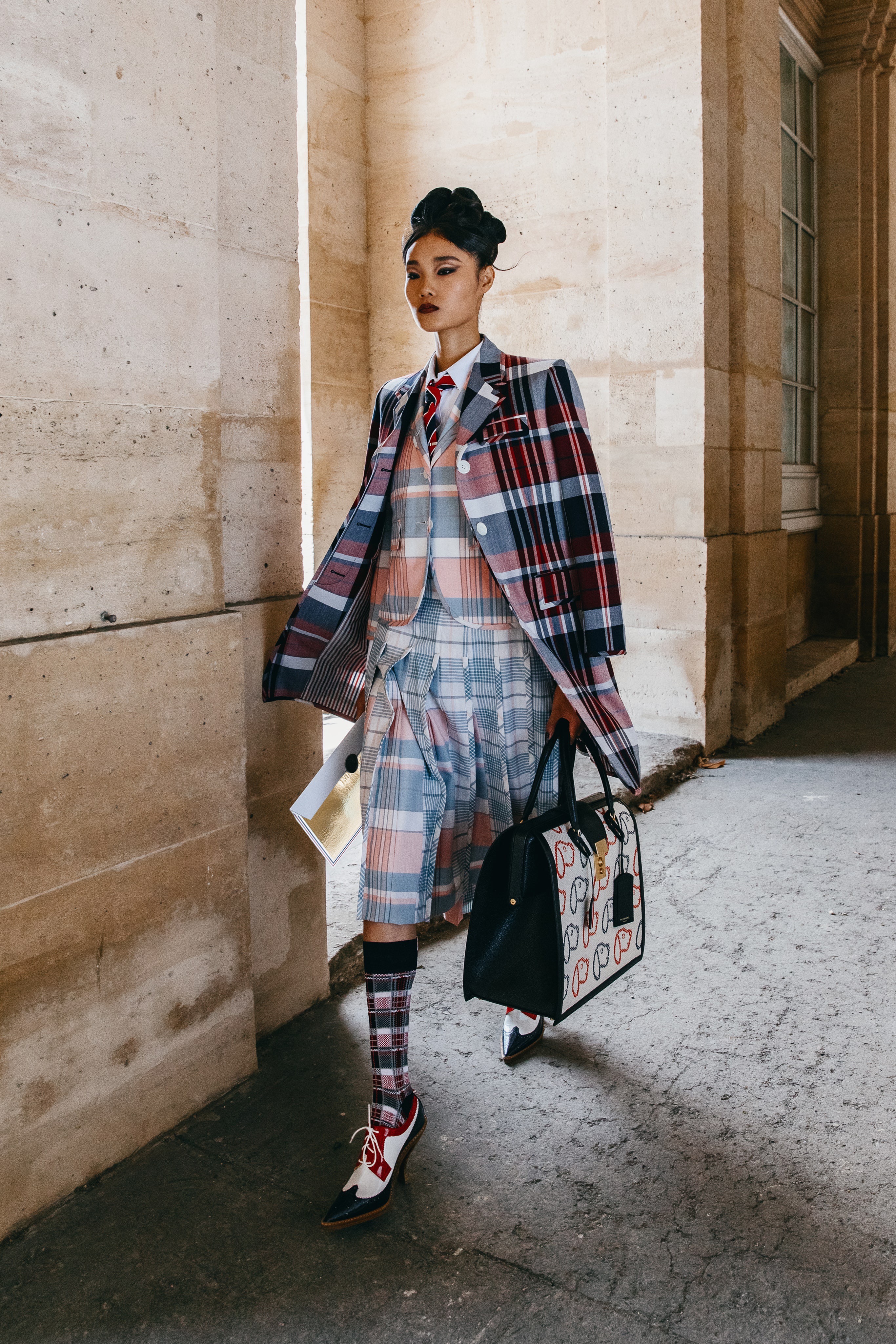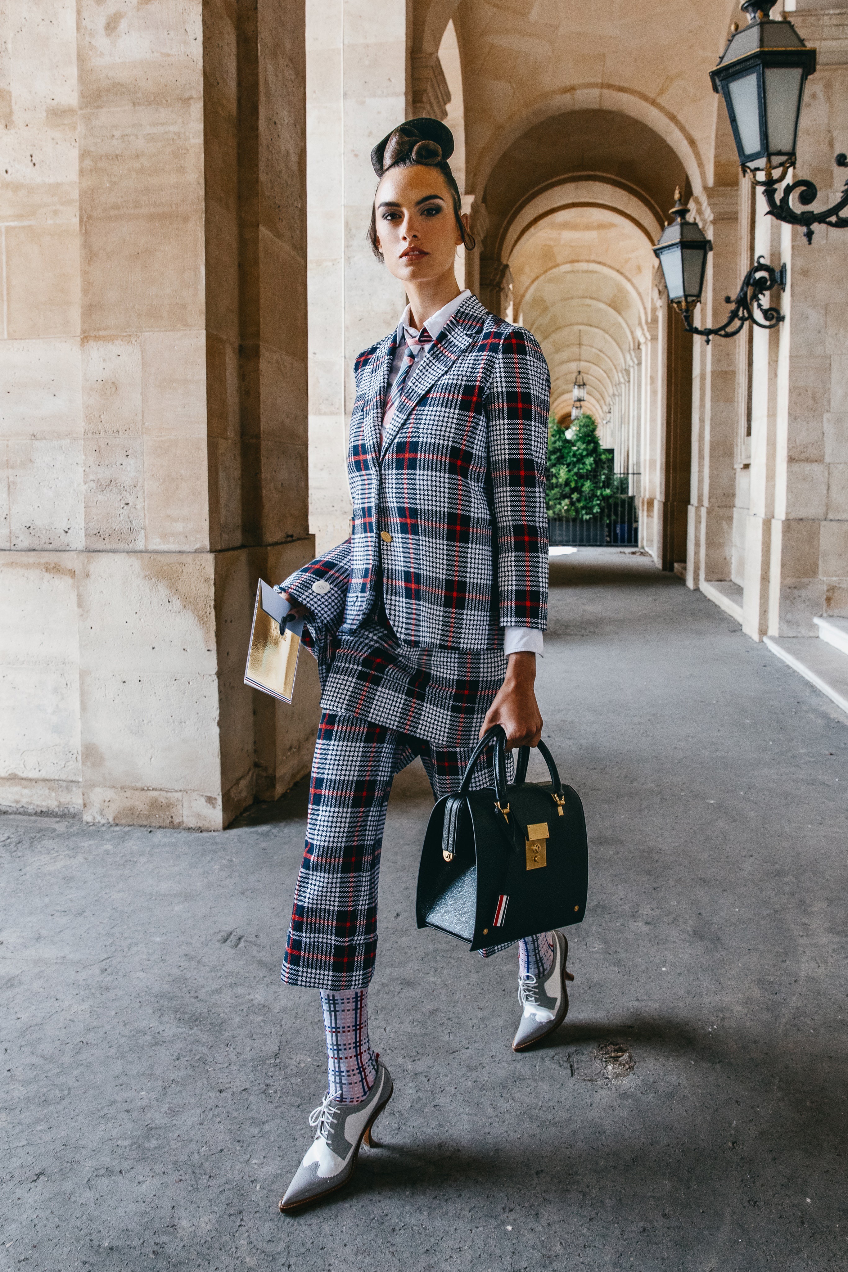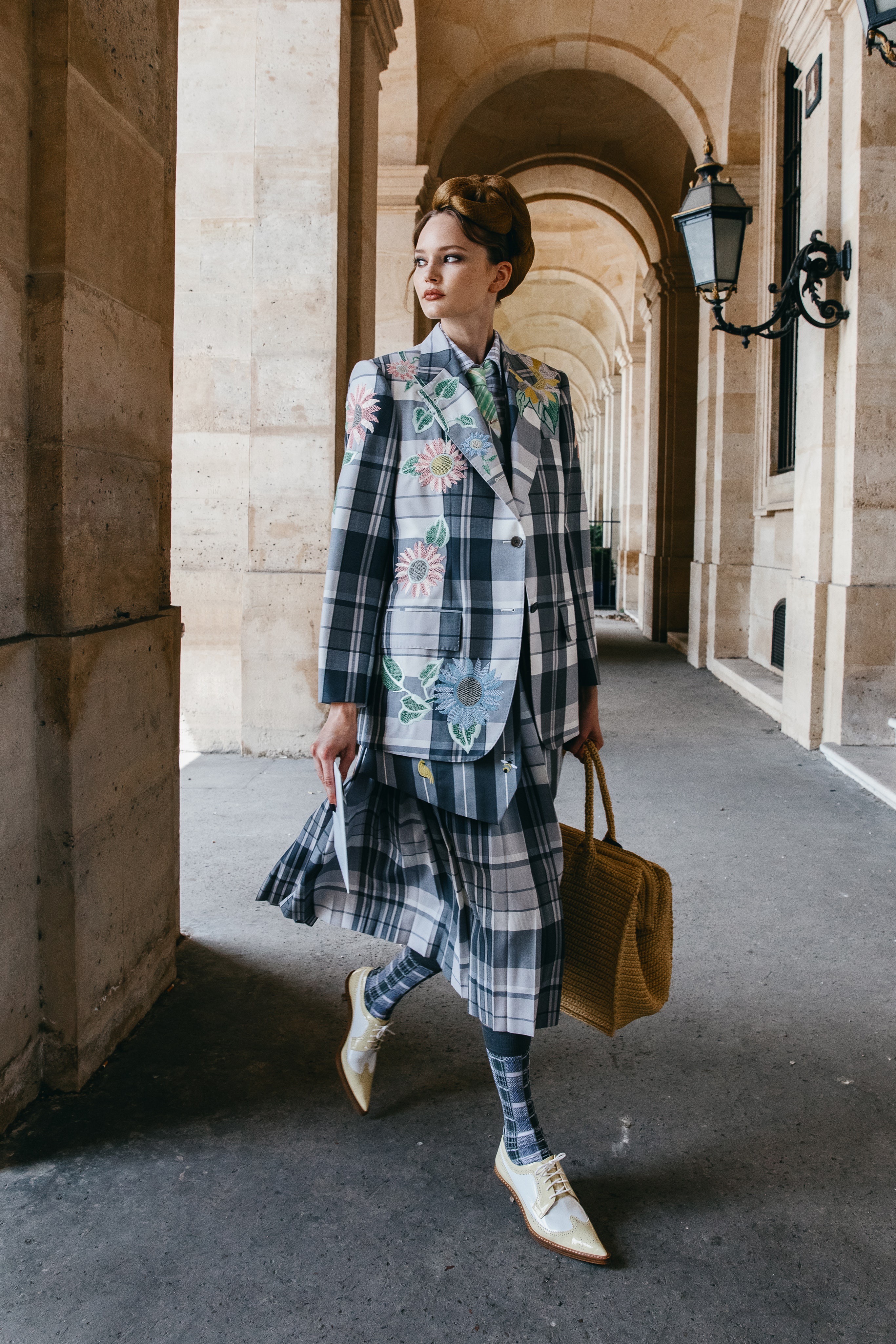 The star of the collection is Thom Browne‘s iconic tweed, blazers and midi skirts. Browne’s aesthetic is very strong, perhaps austere but fancy. One of the coolest details is certainly the return of the French shoes combined with tartan-print Parisian socks, the latter being in fact one of the main leitmotifs of the collection.