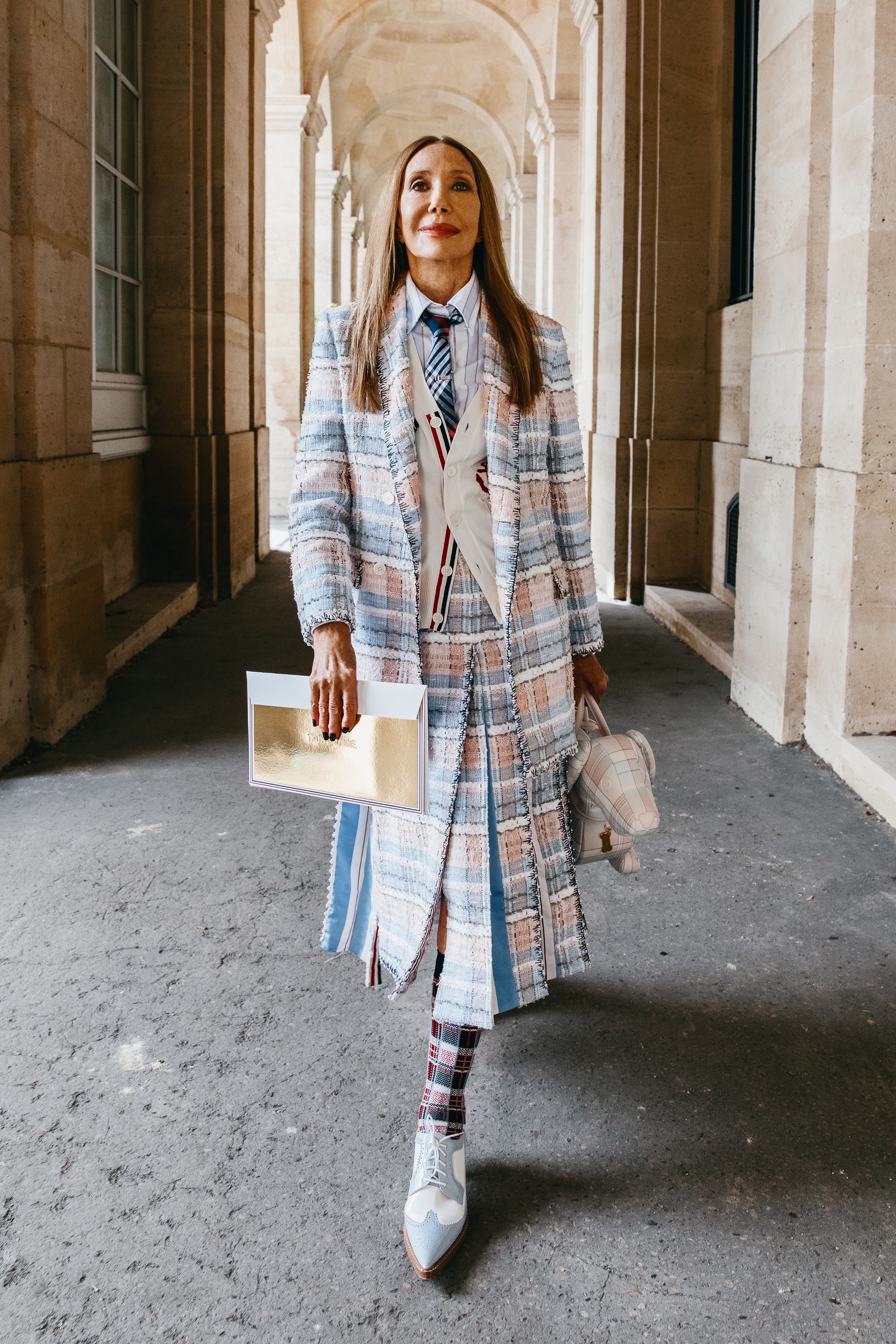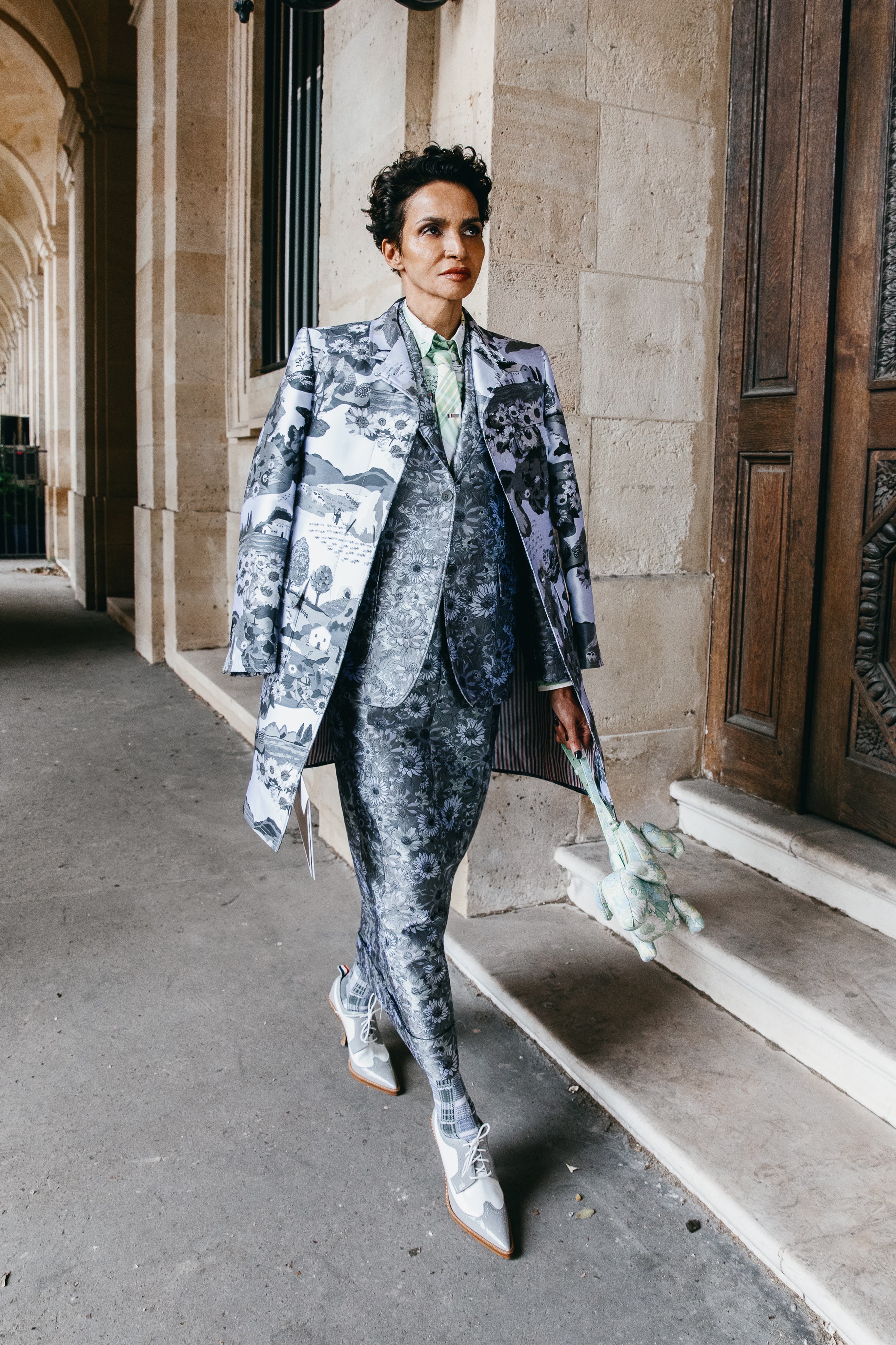 The new Thom Browne Resort 2023 women’s collection sees the light during the men’s show for Spring/Summer 2023. Some well-known faces from Marisa Berenson, Sasha Pivavorova, Cate Underwood, to artist Anh Duong and Farida Khelfa, who simulate being late to the show, take their seats. A real performance.