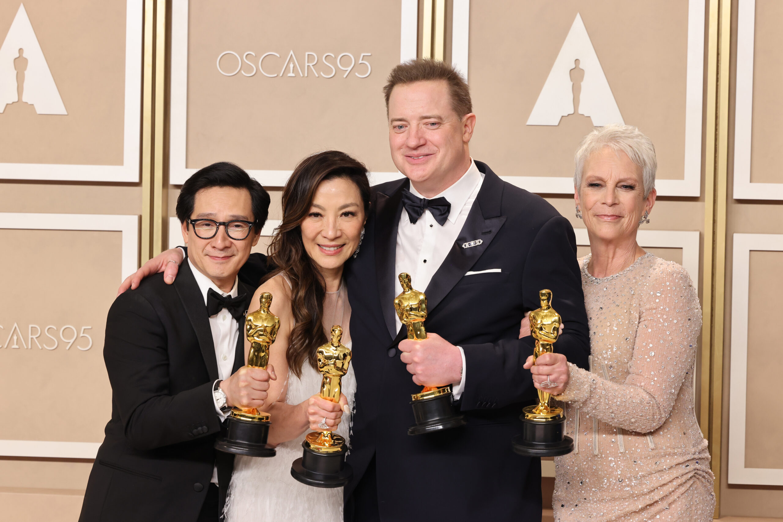 - HOLLYWOOD, CALIFORNIA – MARCH 12: Ke Huy Quan, winner of Best Actor in a Supporting Roll award for ‘Everything Everywhere All at Once’, Michelle Yeoh, winner of the Best Actress in a Leading Role award for ‘Everything Everywhere All at Once’, Brendan Fraser, winner of the Best Actor in a Leading Role award for ’The Whale’, and Jamie Lee Curtis, winner of the Best Actress in a Supporting Role award for ‘Everything Everywhere All at Once’, pose in the press room during the 95th Annual Academy Awards at Ovation Hollywood on March 12, 2023 in Hollywood, California. (Photo by Rodin Eckenroth/Getty Images)