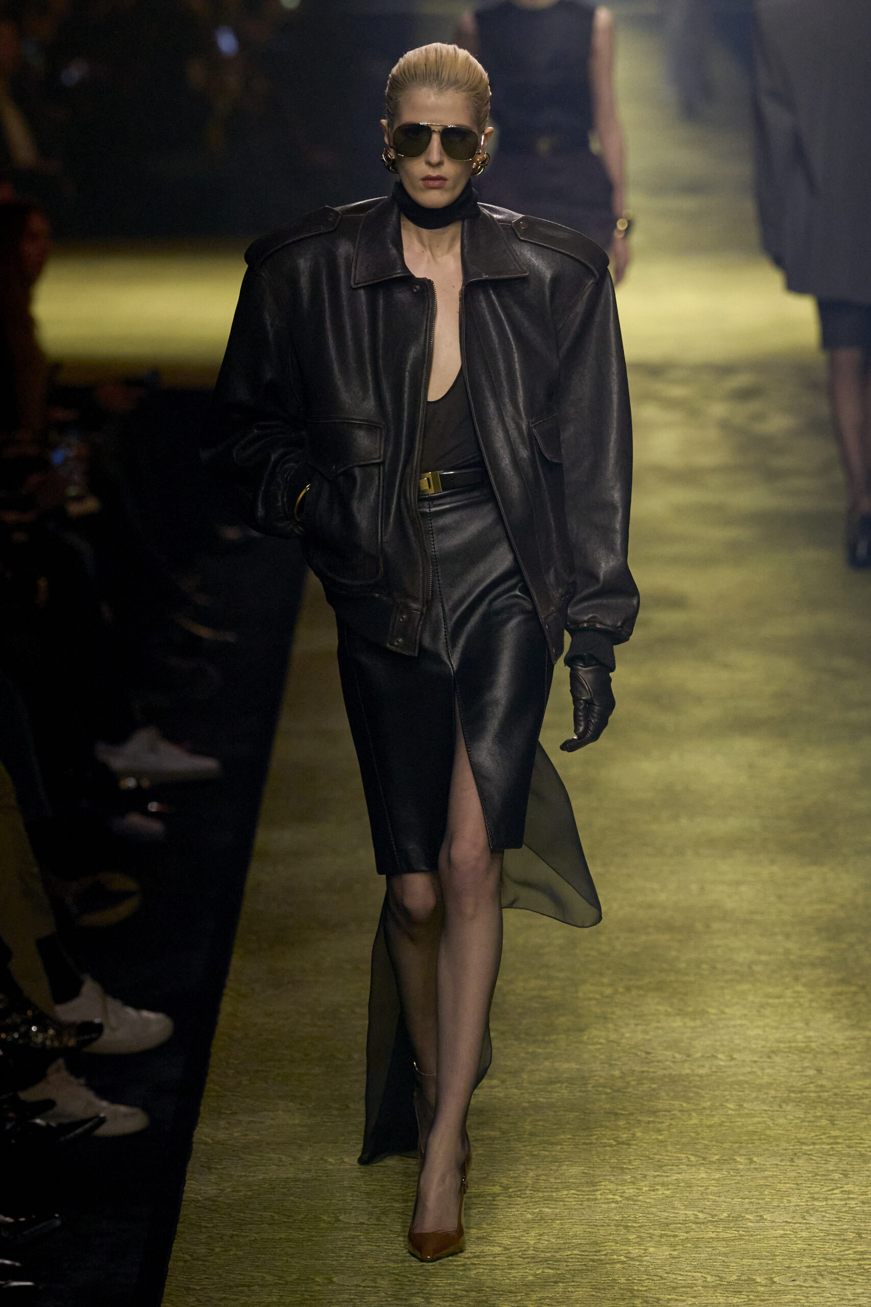 Tailleurs, oversize blazers, draping, then sensual dresses with incredible transparencies and golden buckles, up to leather gloves and pumps with vertiginous stiletto heels.