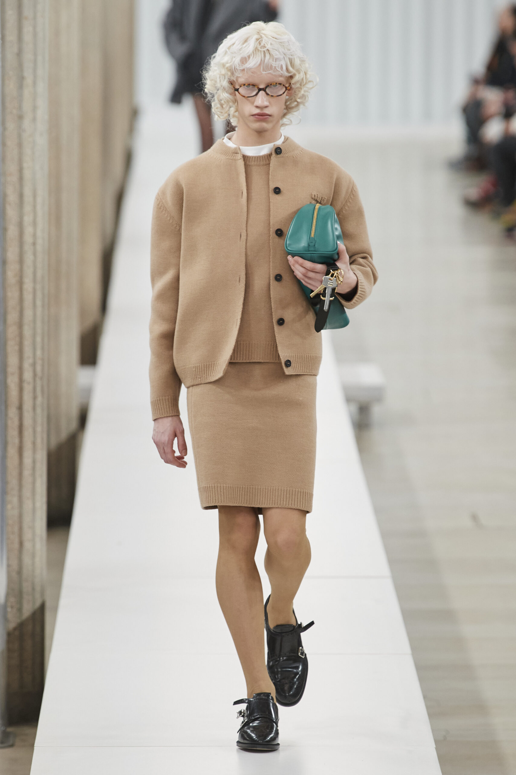 On the snow-white catwalk at the Palais d’Iéna, oversized cardigans and cabans, flesh-coloured tights (no joke), classic sling-backs with matching handbags and a muted colour palette were presented. The models sported a scruffy but striking beauty look.