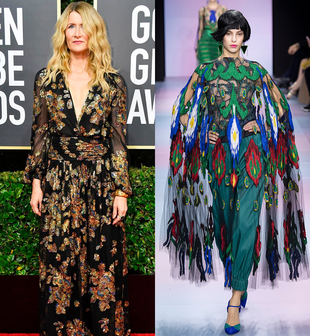 Chic and with an unconventional charm, Laura Dern is a woman who dares in films as in reality. Why not dare with pants then? This Armani Privè look is perfect for her, made of peacock green satin trousers and a divinely embroidered wide cape.