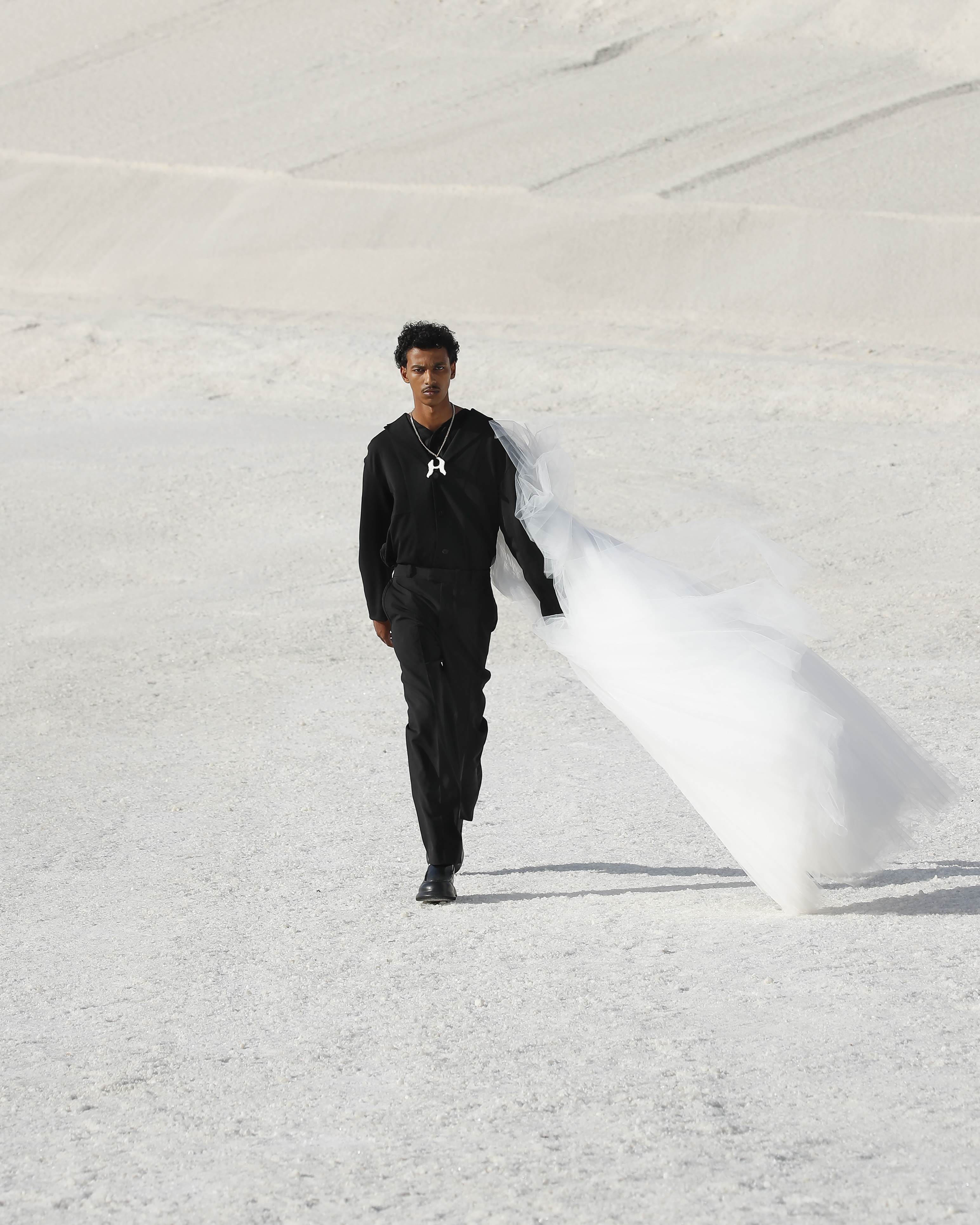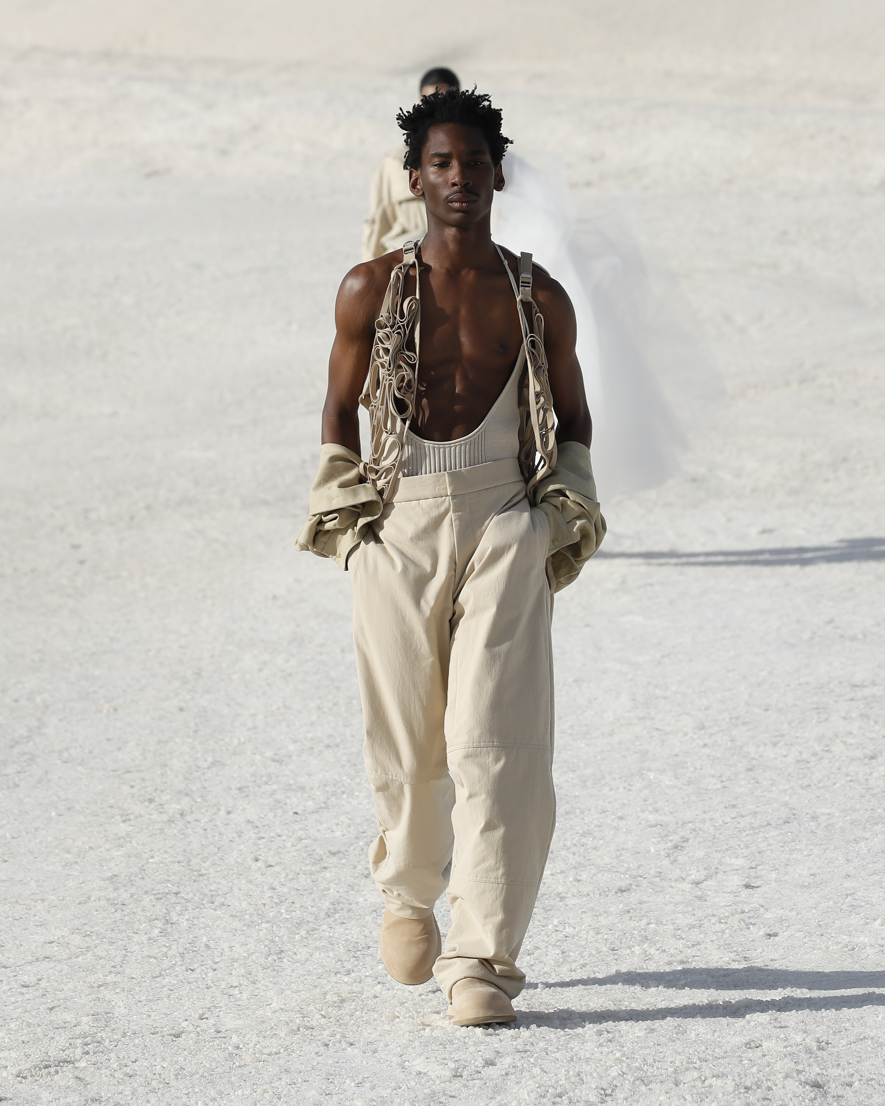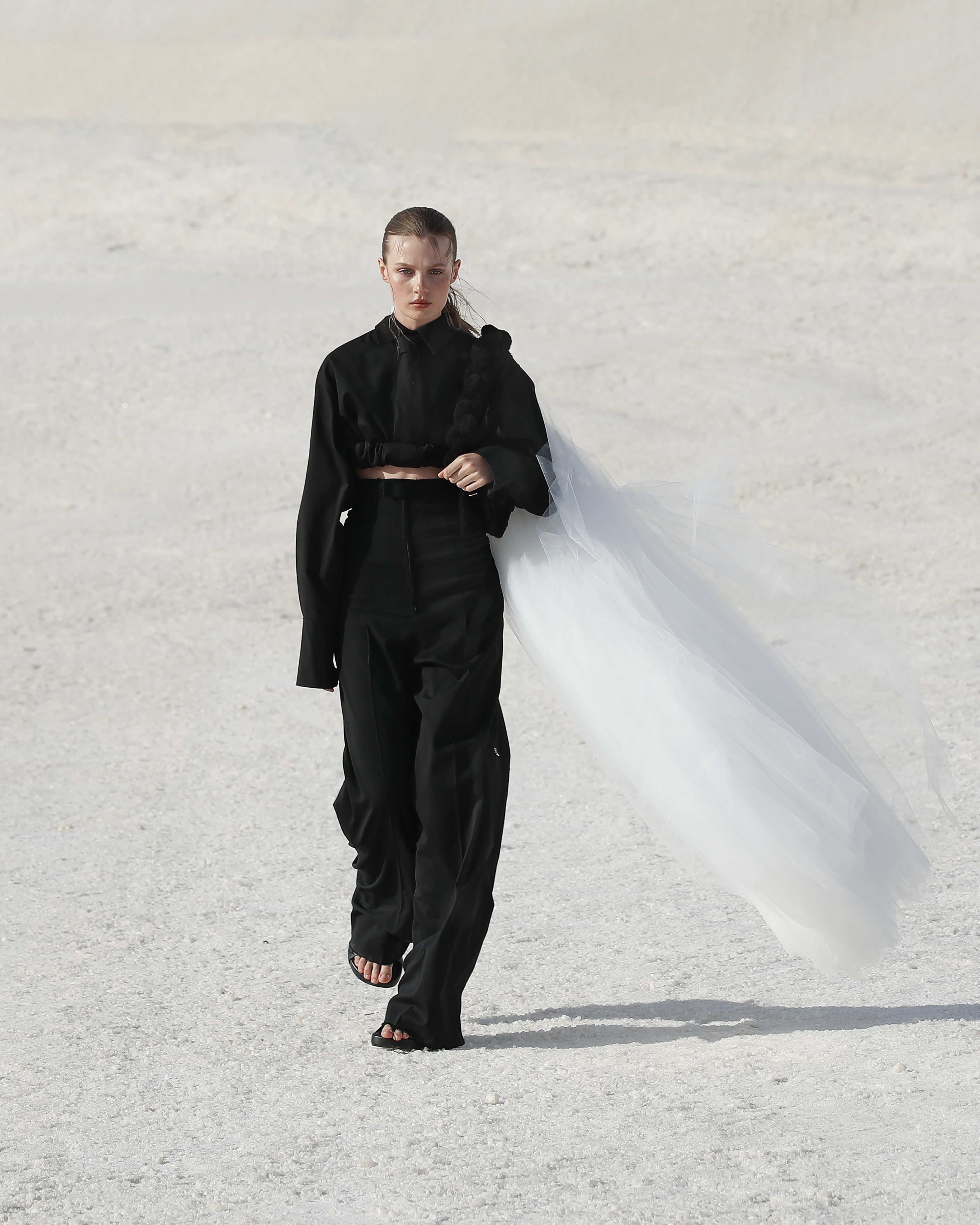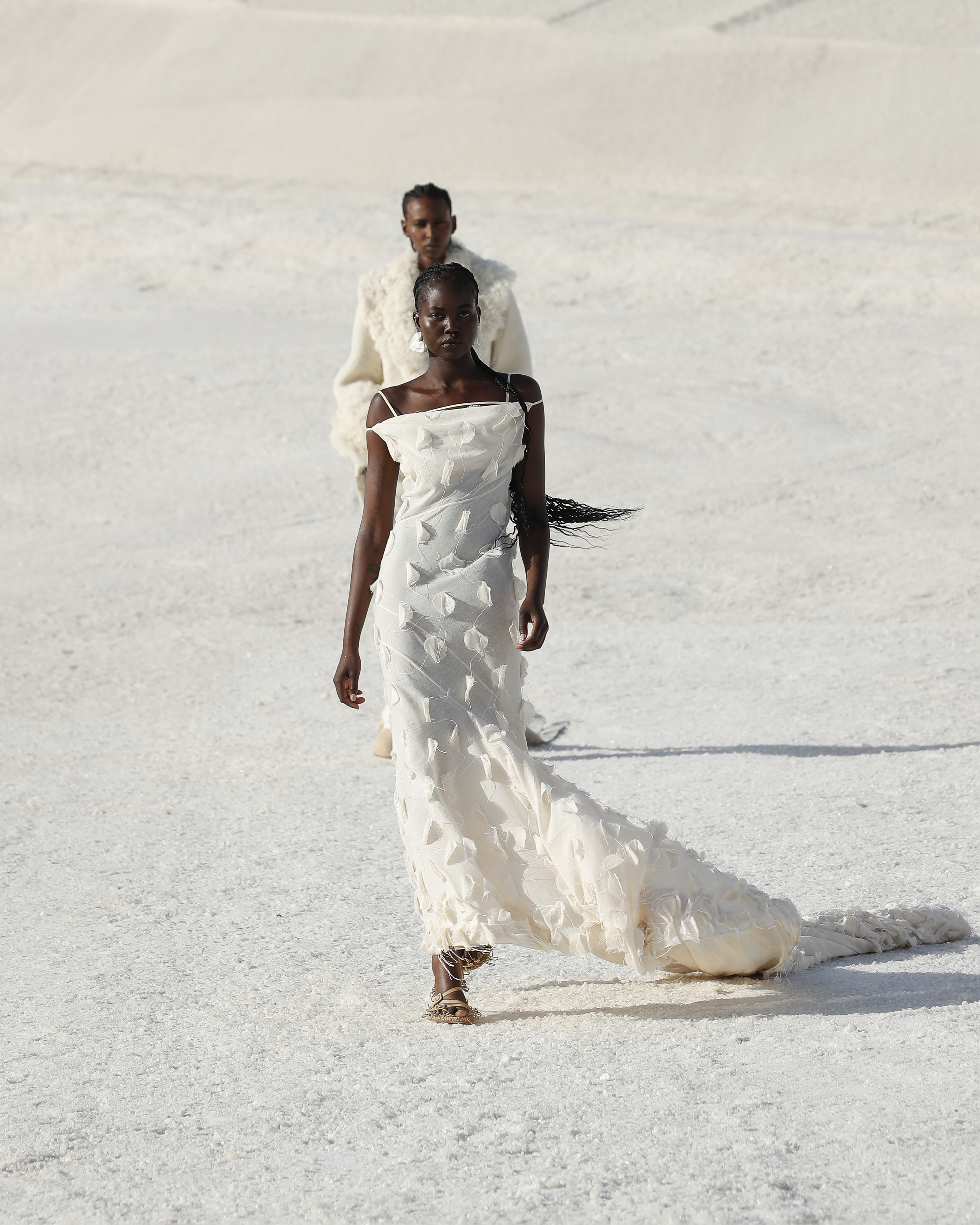 After his last fashion show on a rainy day in Hawaii, Simon Porte returns to his homeland, France. His new collection Le Papier comes to life in the salines de Giraud near Arles, in Camargue in southern France. Although the French designer has long declared his opposition to the imposition of seasonality in the fashion world, this collection should refer to Fall Winter 2022-2023.