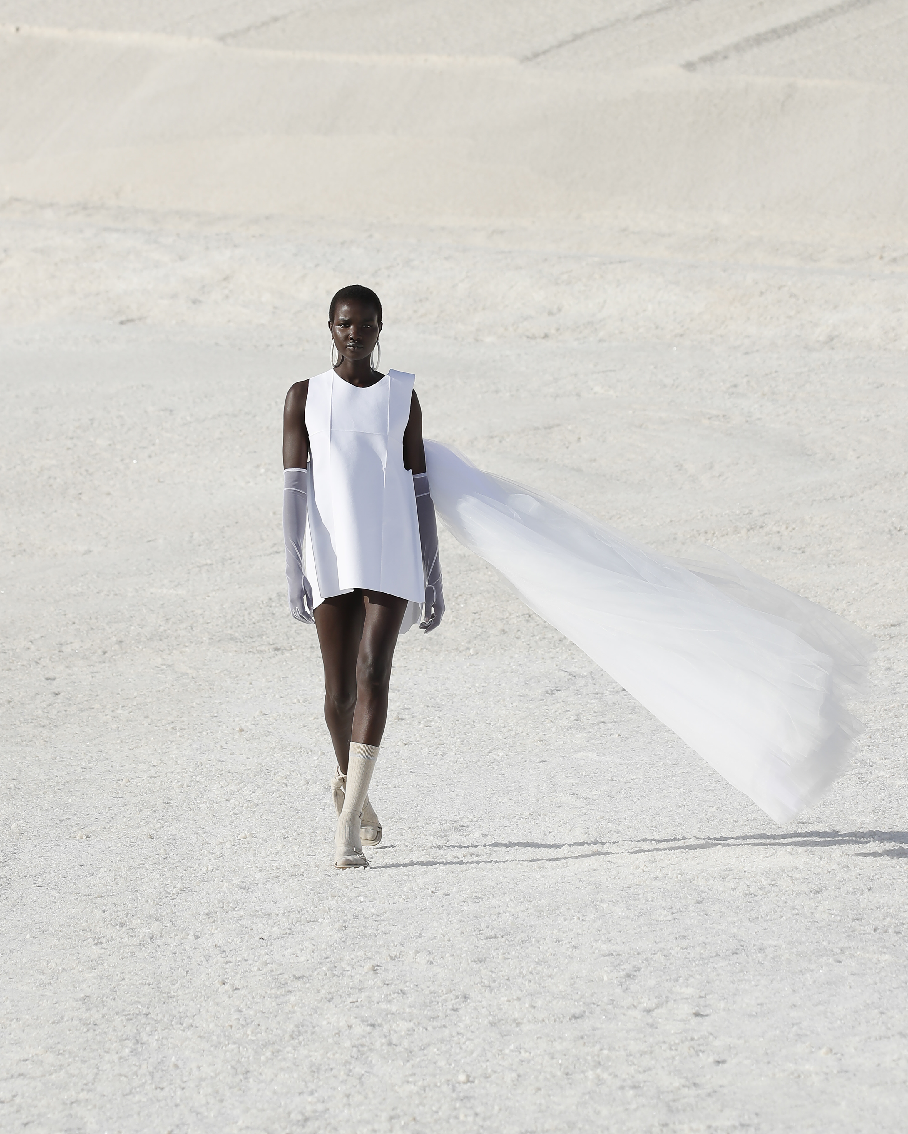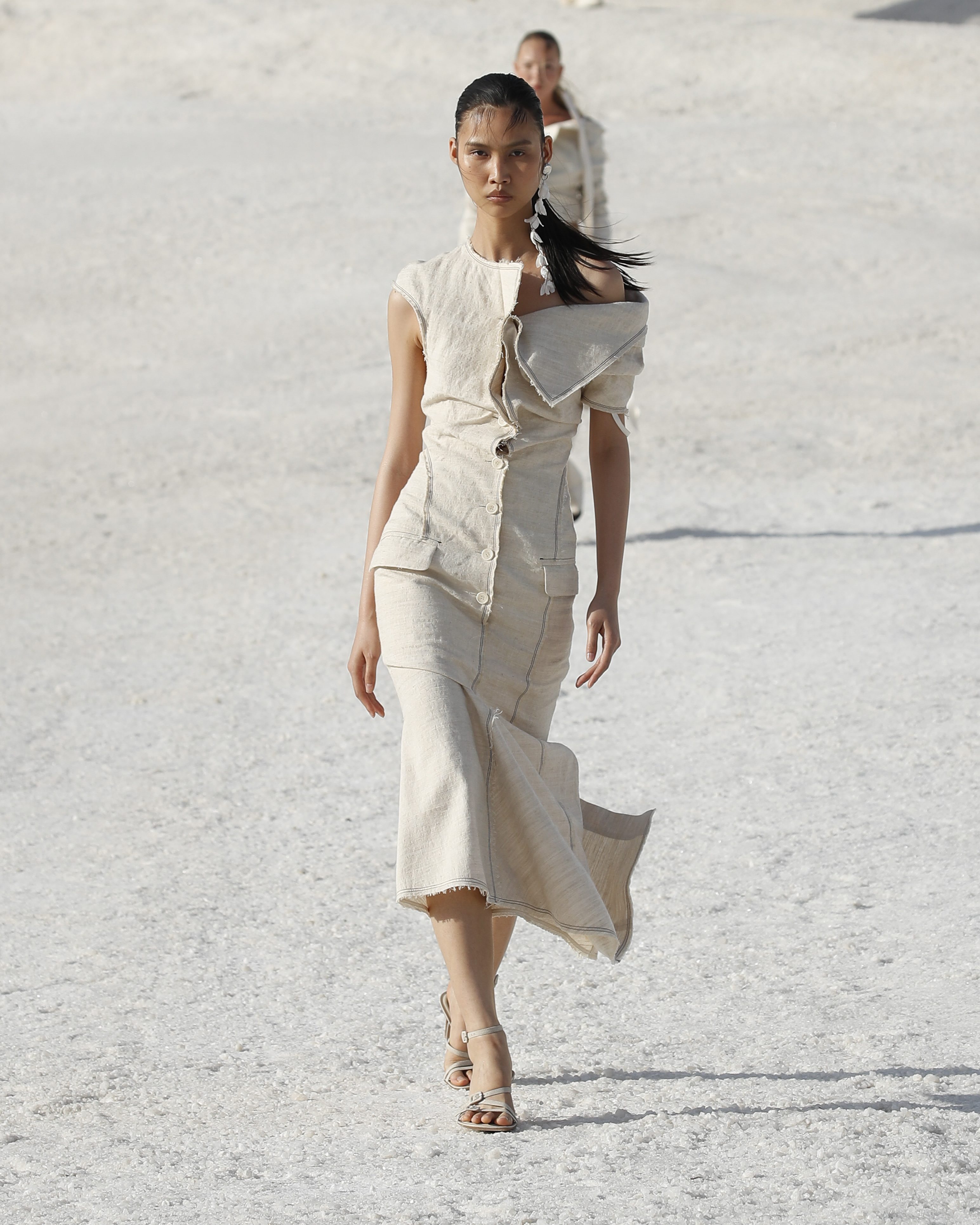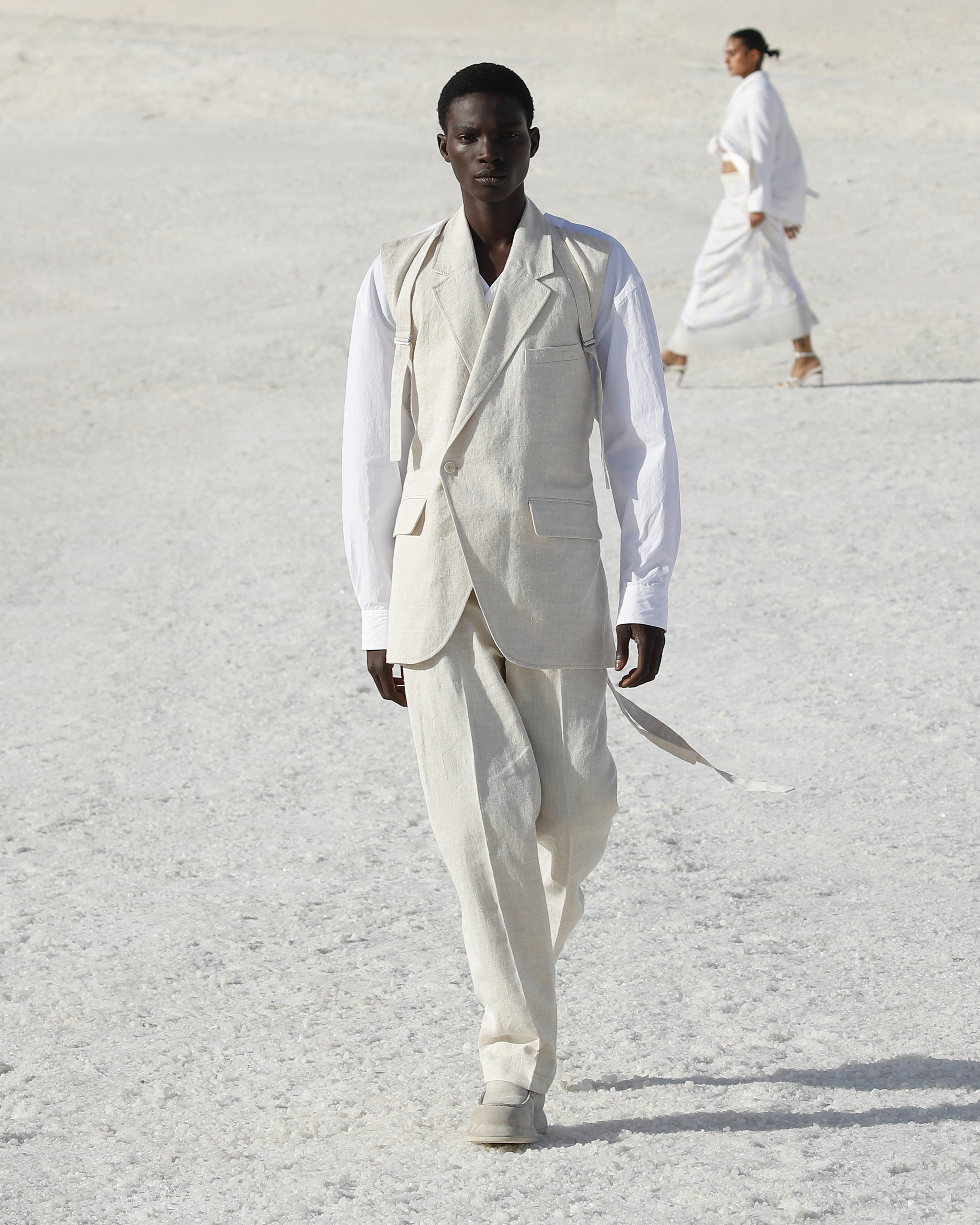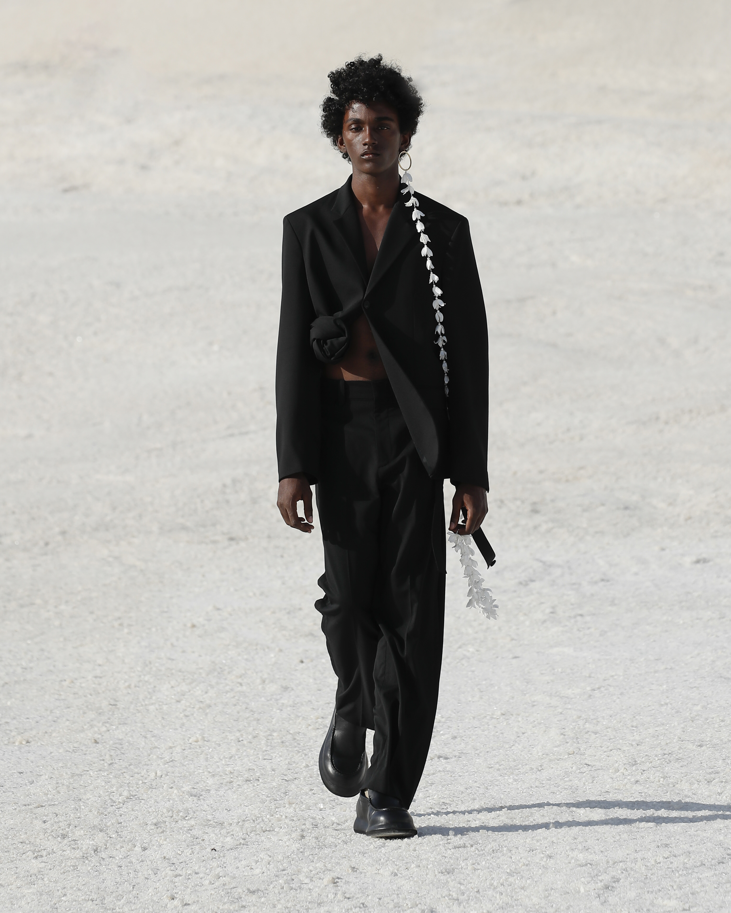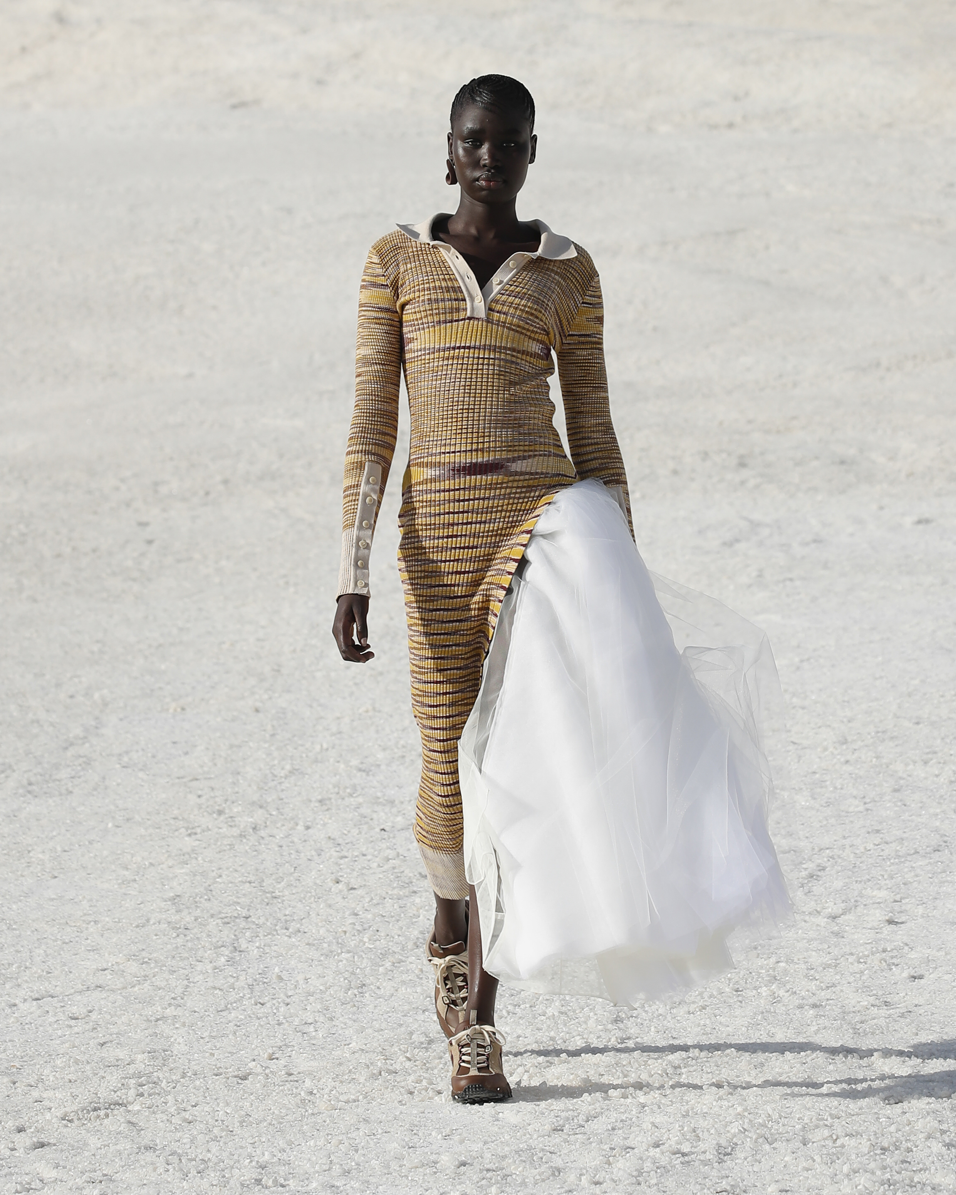 After his last fashion show on a rainy day in Hawaii, Simon Porte returns to his homeland, France. His new collection Le Papier comes to life in the salines de Giraud near Arles, in Camargue in southern France. Although the French designer has long declared his opposition to the imposition of seasonality in the fashion world, this collection should refer to Fall Winter 2022-2023.