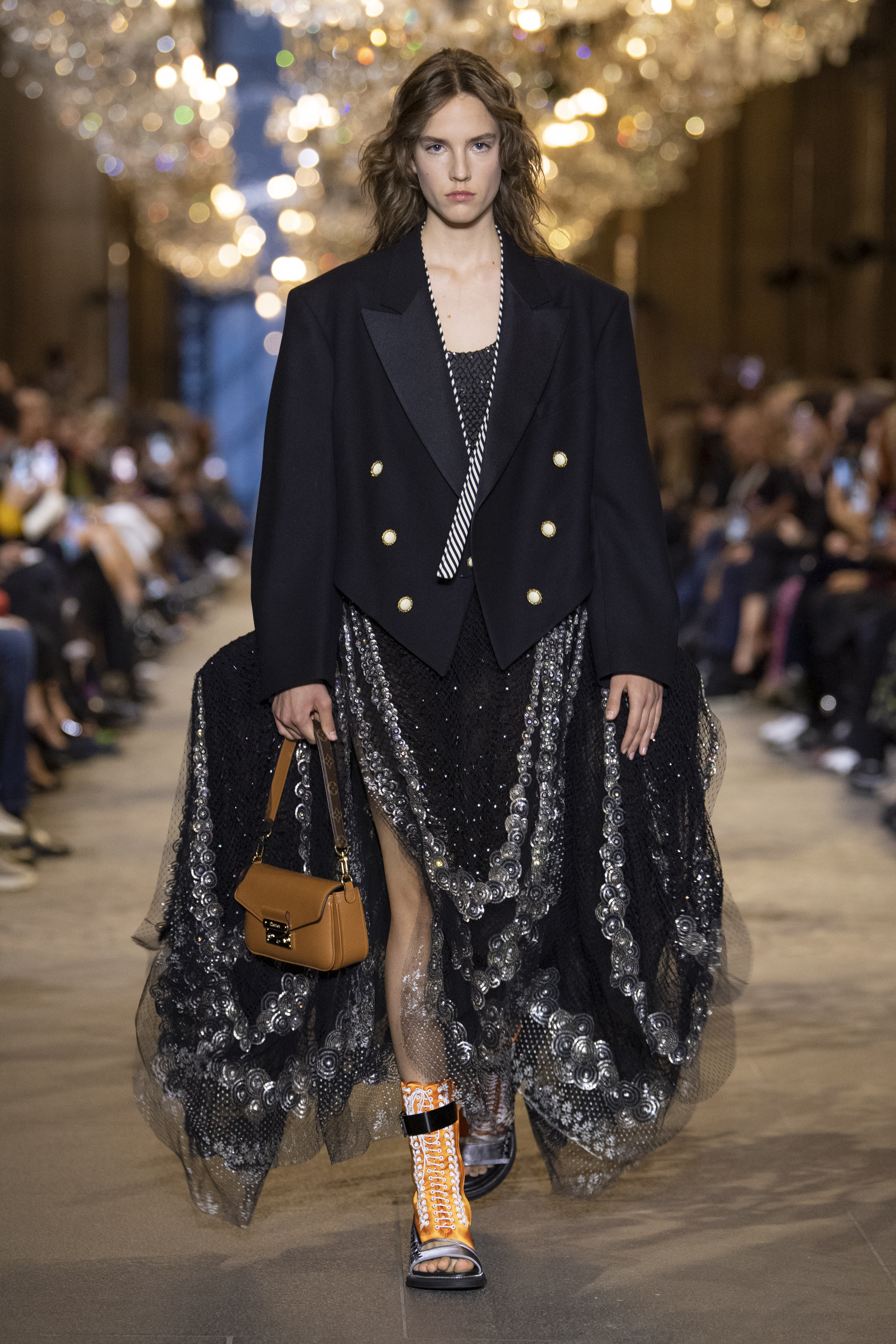 Different generations, times, and stylistic codes are mixed in the Louis Vuitton SS22 women’s collection. Everything is reversed and reinvented, the night wardrobe becomes the day wardrobe and vice versa. The atmospheres of the grand bal materialize in sequined dresses with rigid and wide hips, to be combined with low lace-up sandals and oversized jackets. Denim is also a great protagonist of the collection, especially on relaxed-fit trousers and mini jackets with a round and fringed neckline. Cape coats and slip dresses come together to create unusual looks suitable for the everyday summer wardrobe.