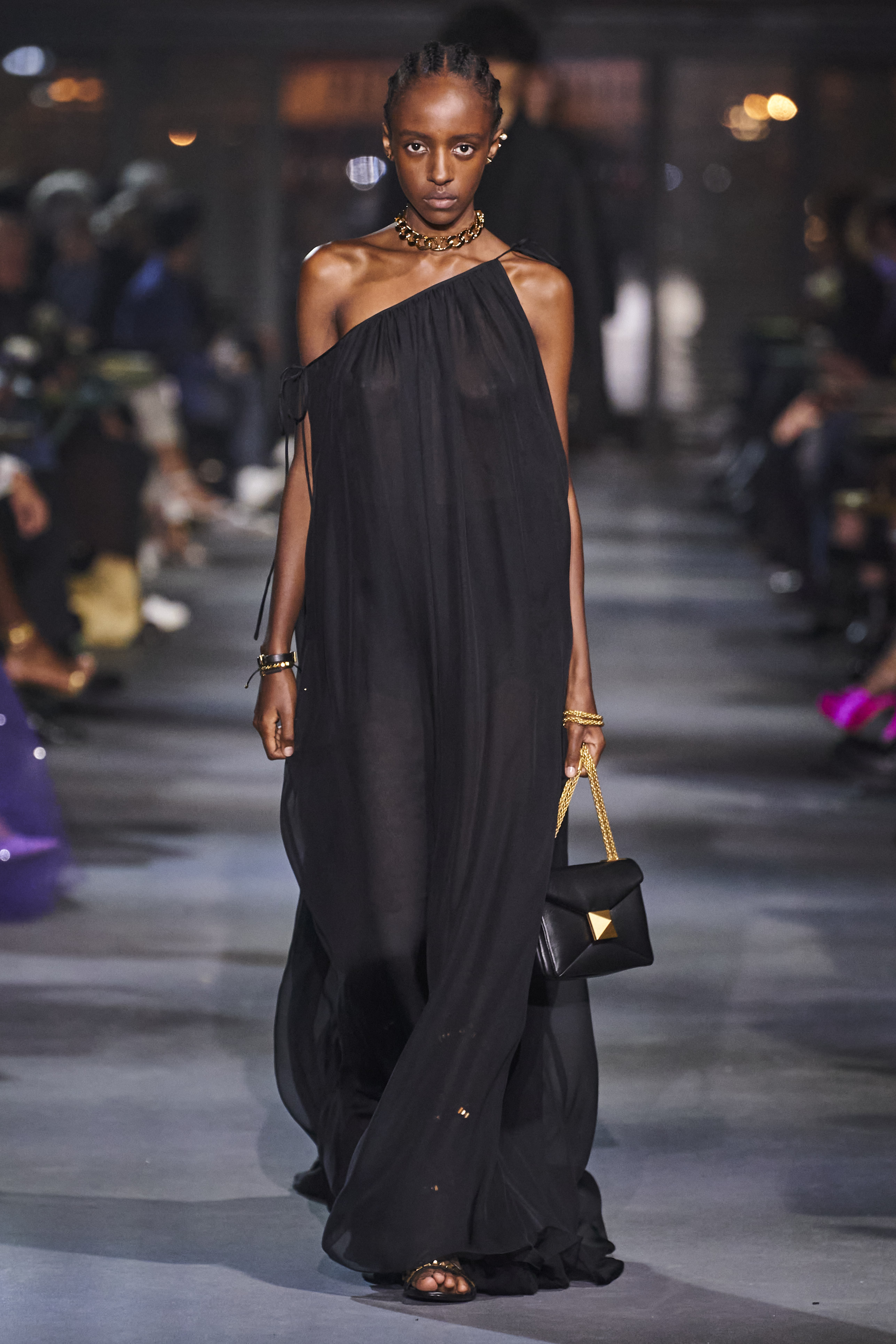 Valentino for the SS22 strips off its usual formality and embraces a more casual fashion which, however, does not forget its original codes. The palettes are the iconic ones of the Italian Maison: purple, brown, yellow and black are the protagonists that are now declined on everyday look now on sophisticated dresses with unusual transparencies. There are also sequin mini dresses to pair with combat boots and chain necklaces bolder than ever. The extraordinary nature of Pierpaolo Piccioli lies right here, in always knowing how to refine every garment and accessory. Oversized boyfriend jeans are combined with embroidered tunics, sequined capes, and oversized shirts, while maxi dresses recall Greek shapes together with gladiators sandals and unusual feather bags.