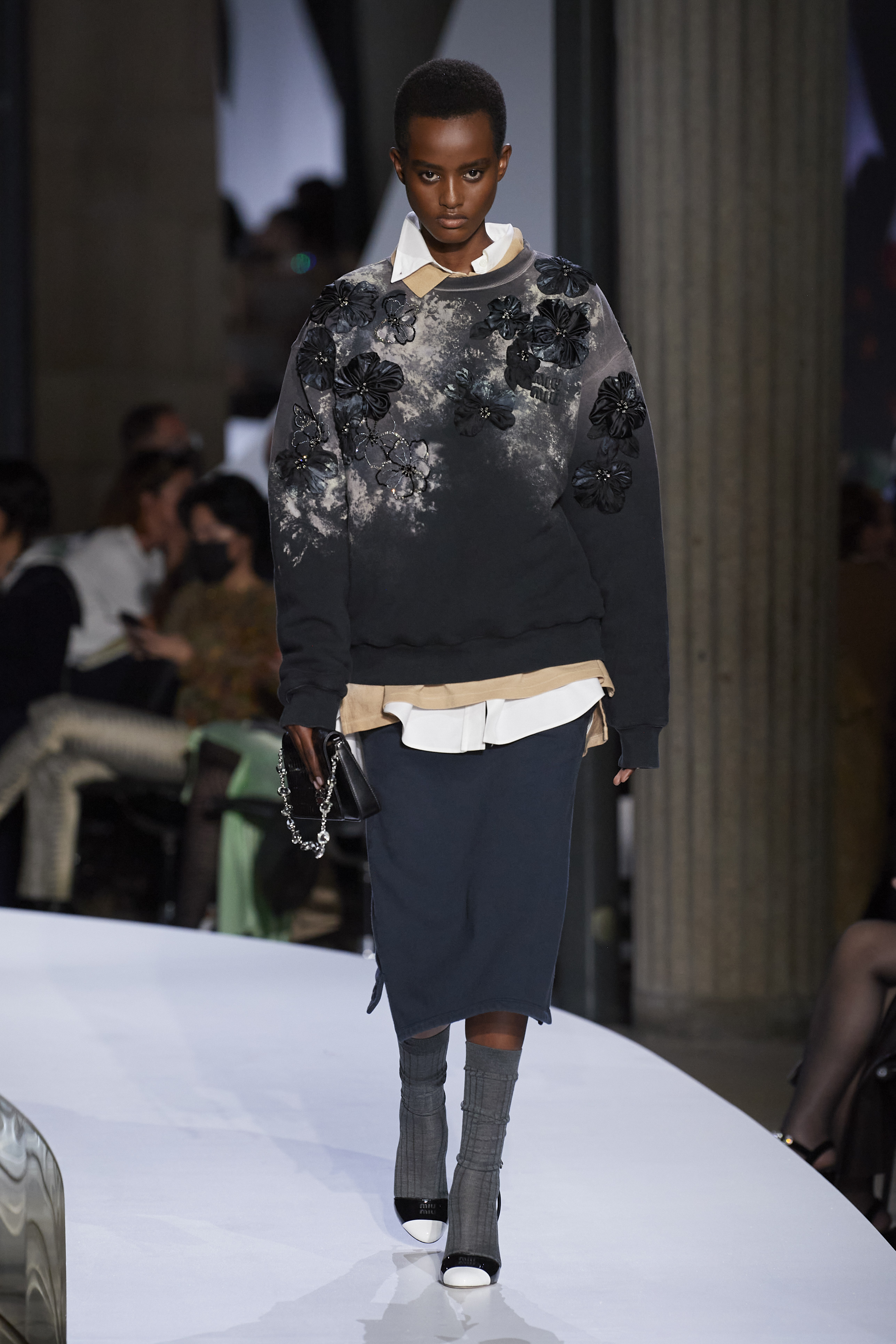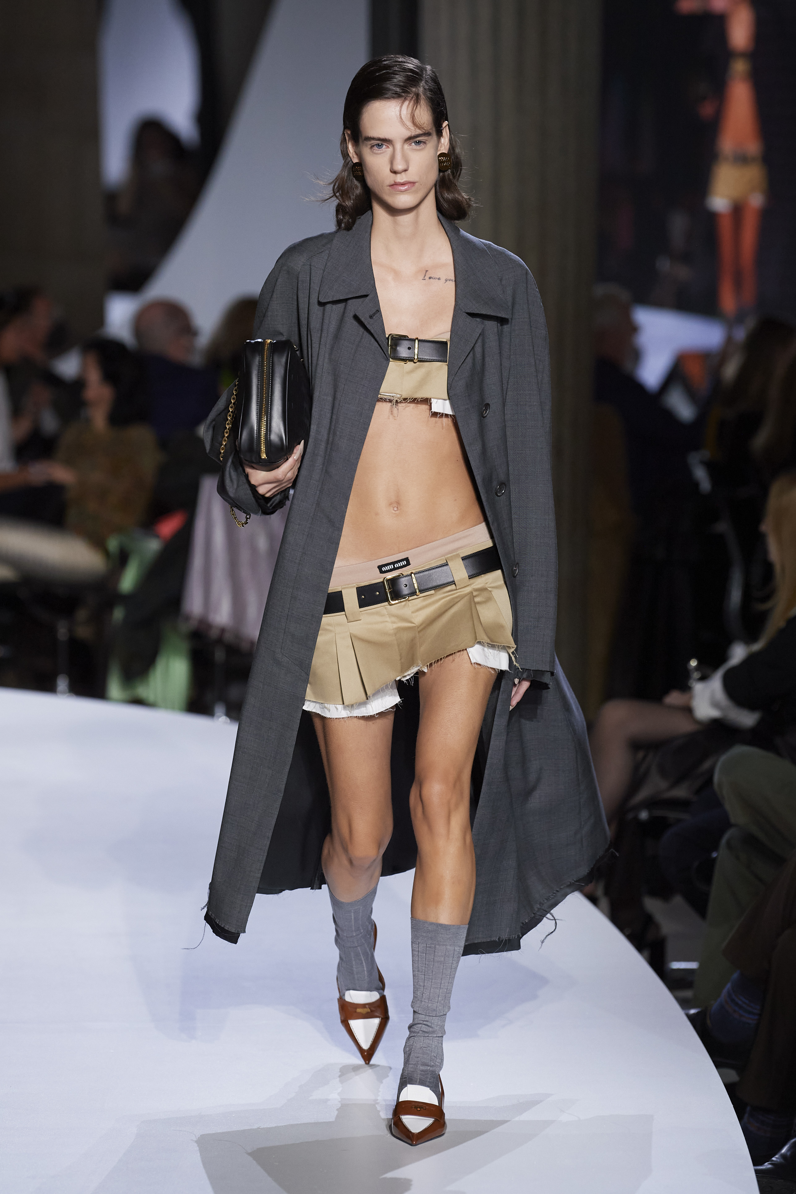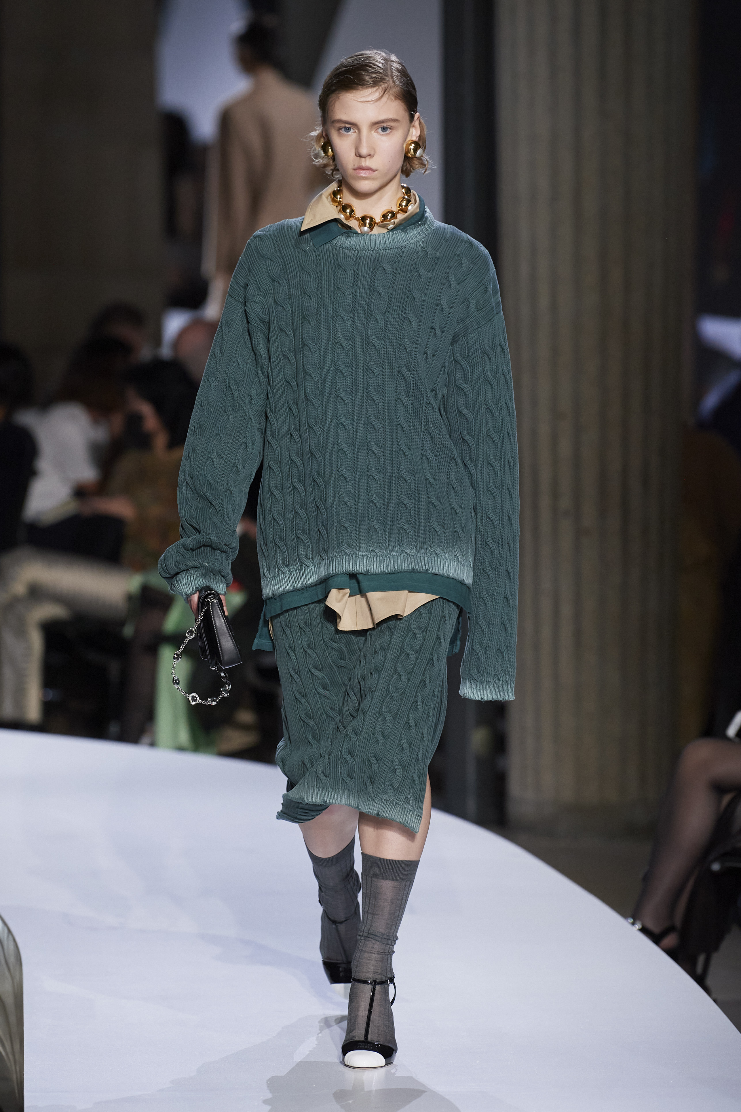 Miuccia, the real Miuccia is back. The Milanese fashion lady with Miu Miu manages to move away from the influences of Raf Simons and completely dress her truest clothes. That kind of fashion that knows how to make typically feminine garments genderless and vice versa is back, greeting the 2000s and interpreting them, perhaps for the first time, in a new and extraordinary way. Needless to hesitate, the keyword of this collection is miniskirt. Miuccia reinvents it and makes it more mini than ever and with a very low waist, to be combined with typically dad sweaters with braids that become crops to reveal androgynous and defined bodies. Outerwear is made of tailored and trench coats, coordinated suits are made of varsity sweatshirts and two-piece cable knits, all oversized and to be paired with midi skirts. The shoes, on the other hand, are pointed moccasins to be worn with socks, male ones, to be worn up on the calf.
