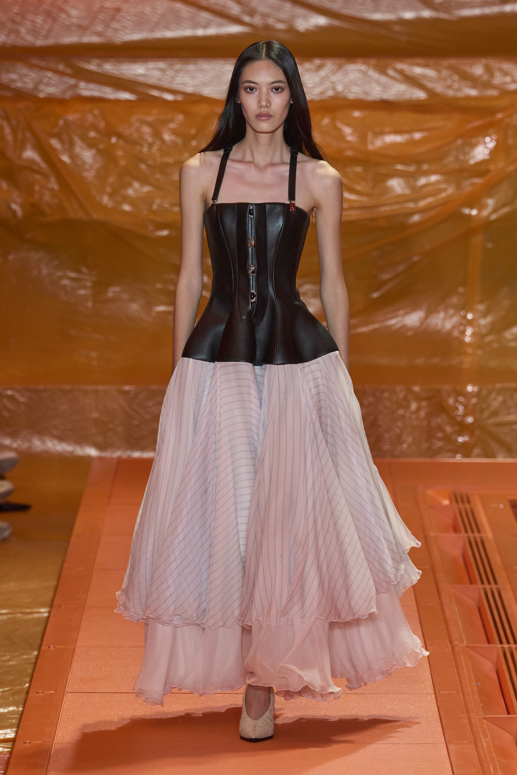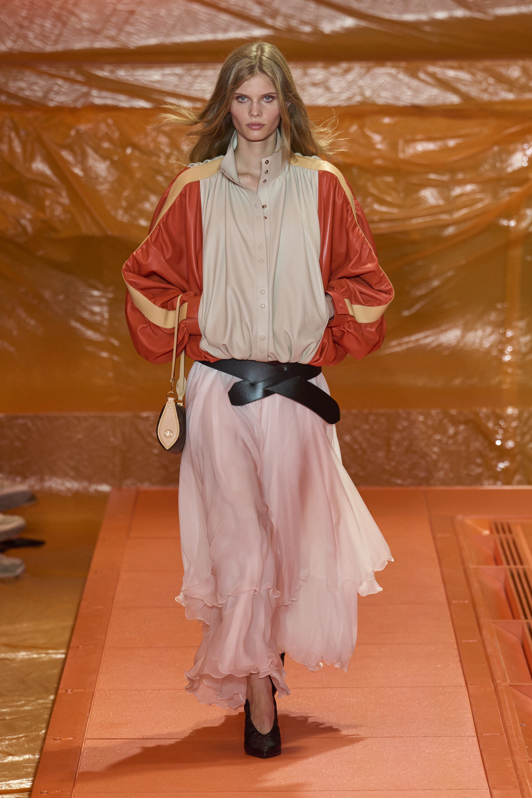 The collection was characterized by iconic pieces and accessories from the historic French fashion house, adorned with bombers, silk shirts, and long, voluminous skirts. Ghesquière’s vision of Spring/Summer proved to be the season of corsets, with essential accessories like belts and hats dominating the entire show. The hats came in various sizes, textures, and colors, adding a touch of versatility to the collection.