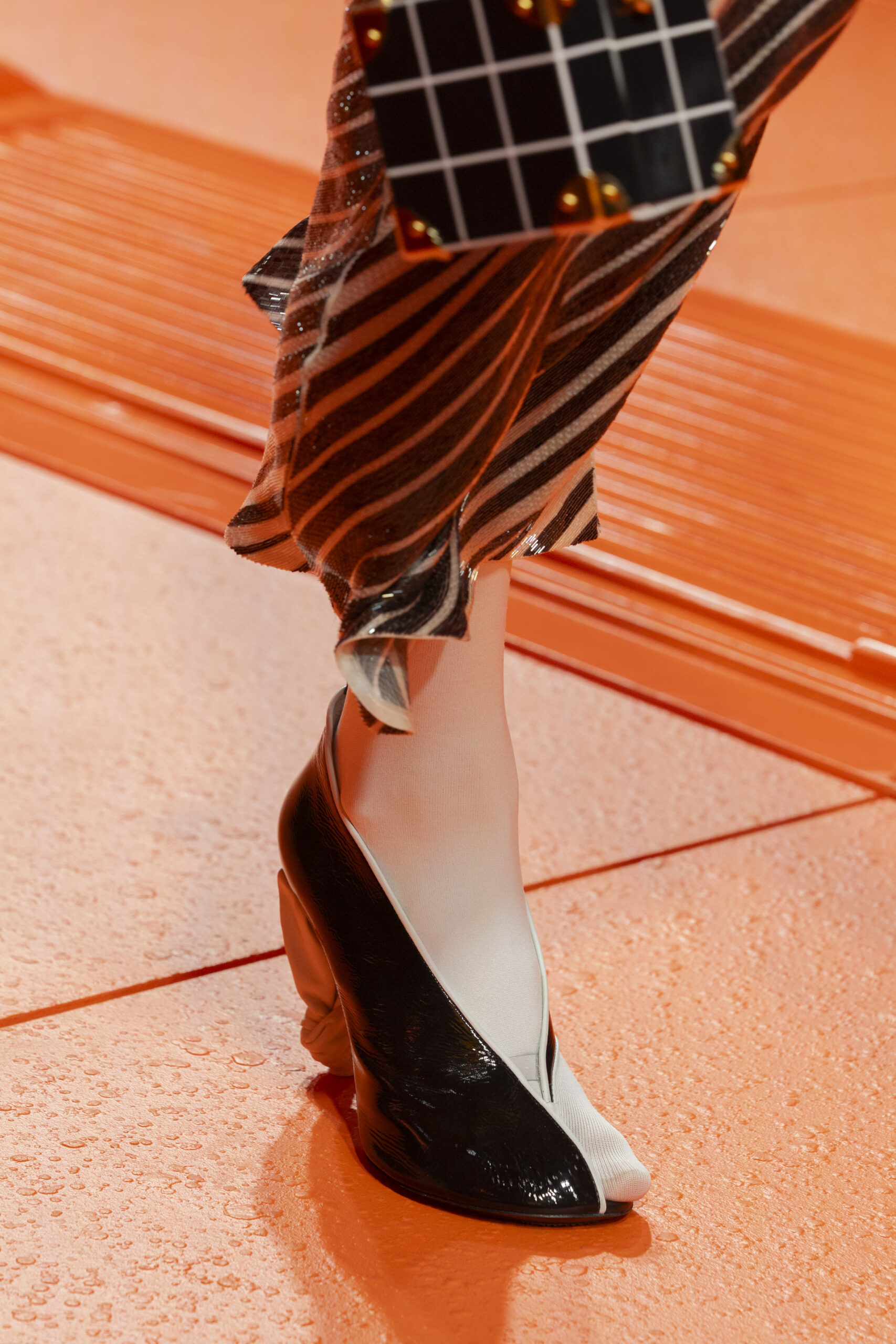 Key pieces in this runway show included bold blazers with oversized shoulder pads that captured attention in a surprising way. When it comes to footwear, the collection offered a variety of models, both medium and low in height, with pointed or, in the case of white and black shoes, a unique focus on foot shape, emphasized by a one-of-a-kind sock.