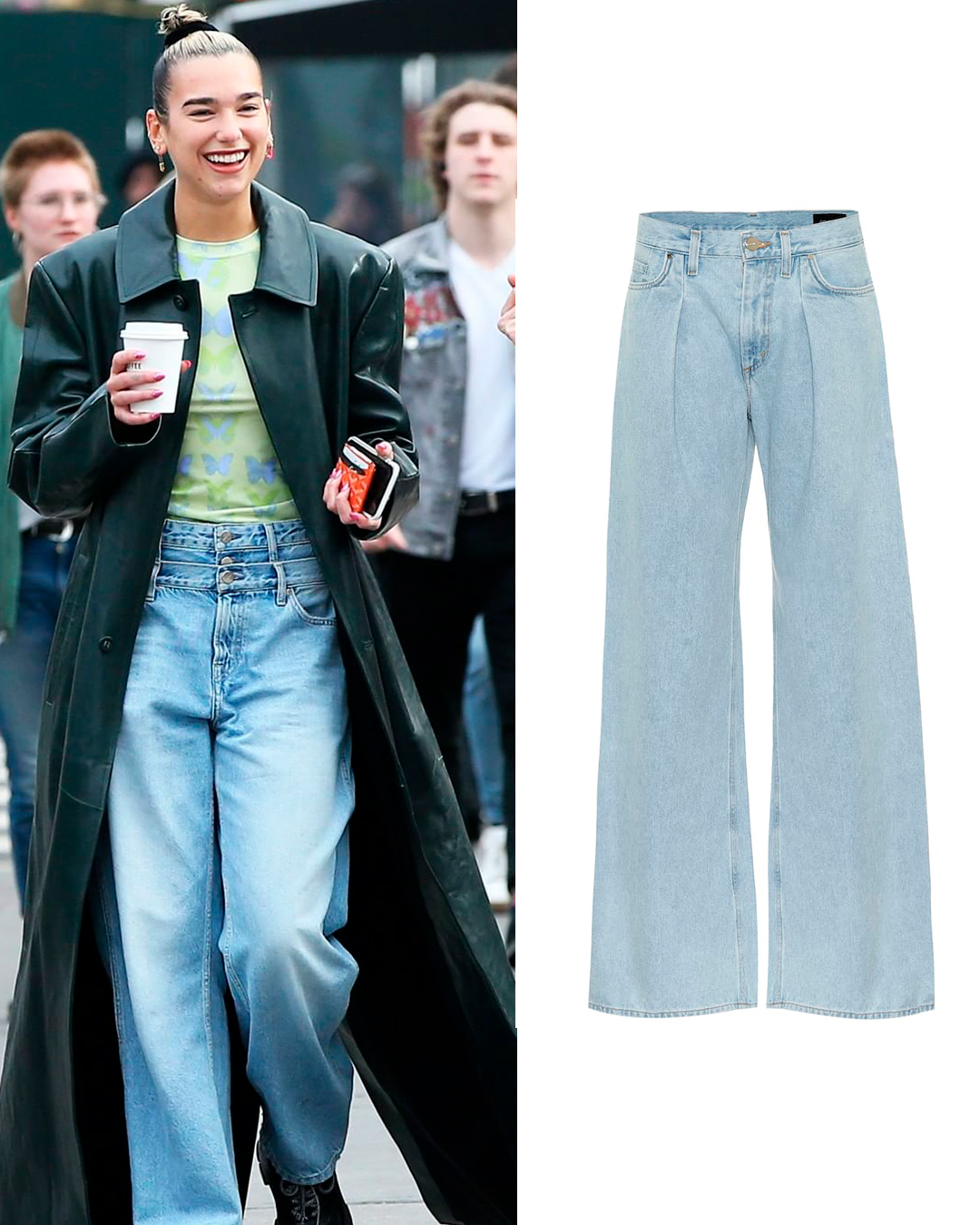 But here is finally the wide-leg jeans: with a high waist, they slim and lengthen the figure, especially if worn with a long jacket like Dua Lipa. Perfect this light blue model that you can buy in a very similar version here!