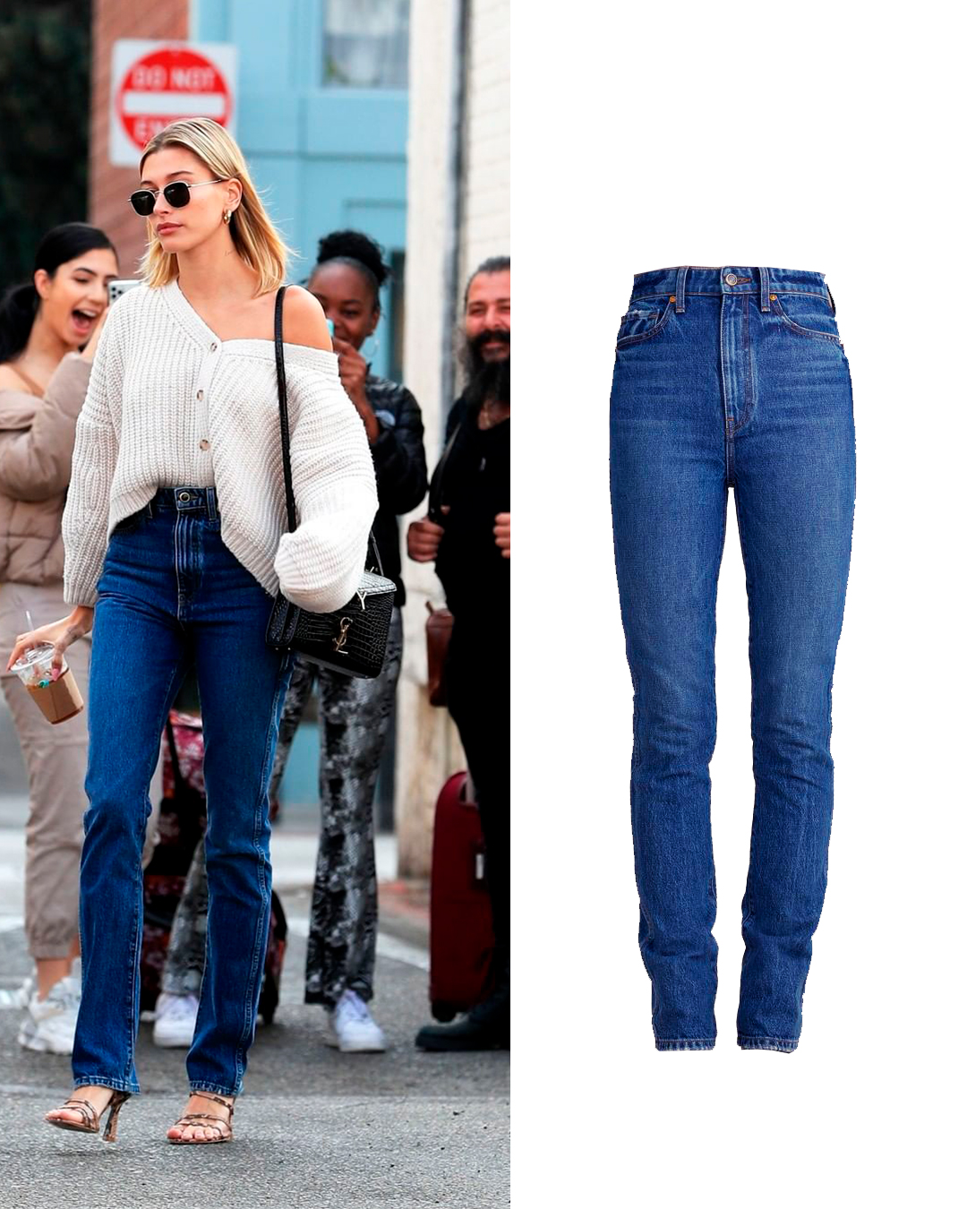 Same goes for the jeans worn by Kendall Jenner but in a more glam version. In fact, Hailey Bieber has followed the trend and has chosen this skinny model, dark blue and … super long to cover the shoe a little, pure coolness! Buy hers here!