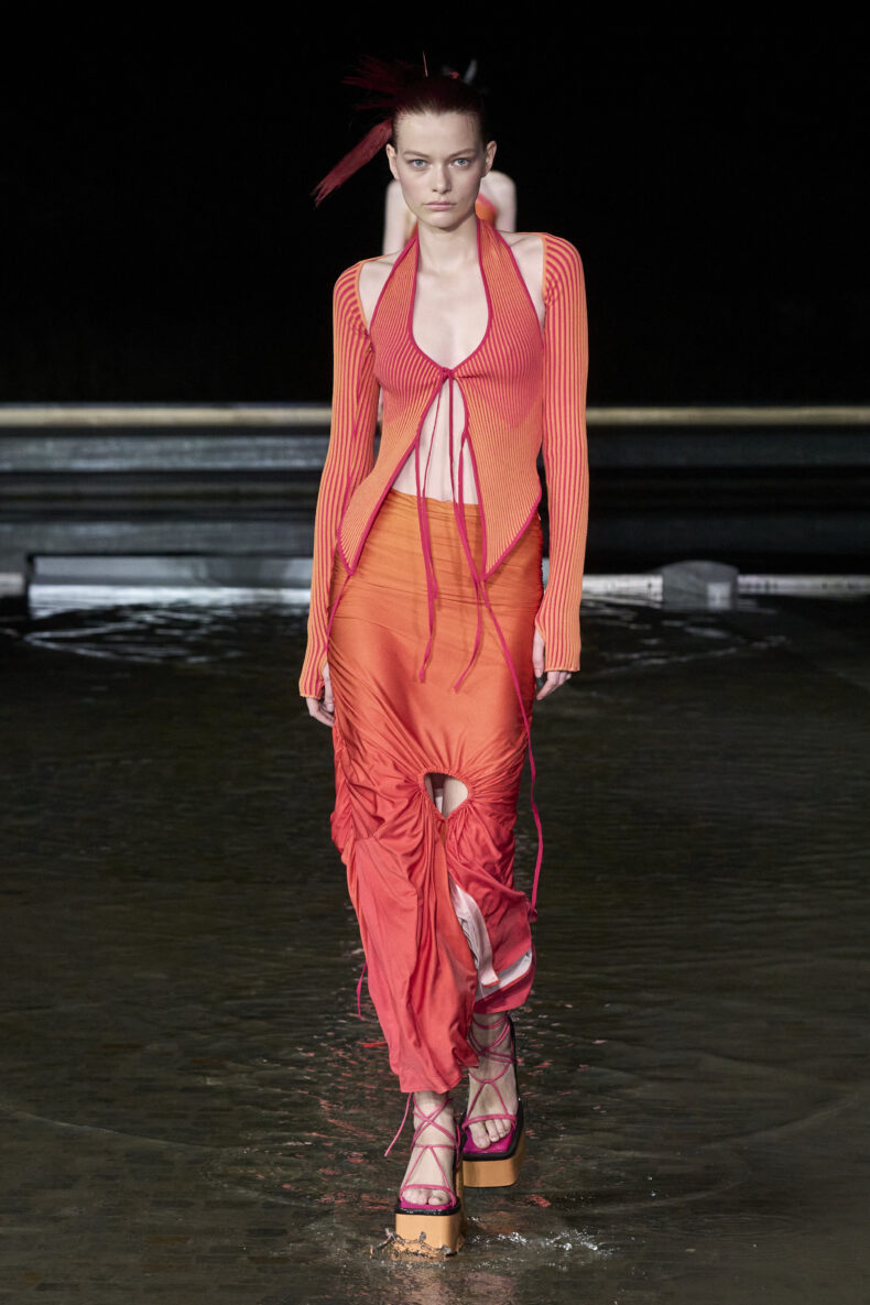 His brand is loved by celebrities, including Dua Lipa, Nicola Peltz, Anitta and Julia Fox. Yesterday in Milan’s Piazza Olivetti, the designer presented his Spring/Summer 2023. The models paraded in the water wearing vertiginous flip-flops and garments that are now considered the heritage of the brand new Italian maison. Andrea Adamo’s inspiration, also in the choice of location, seems to pay homage to a surfing village called Famara in Lanzarote.