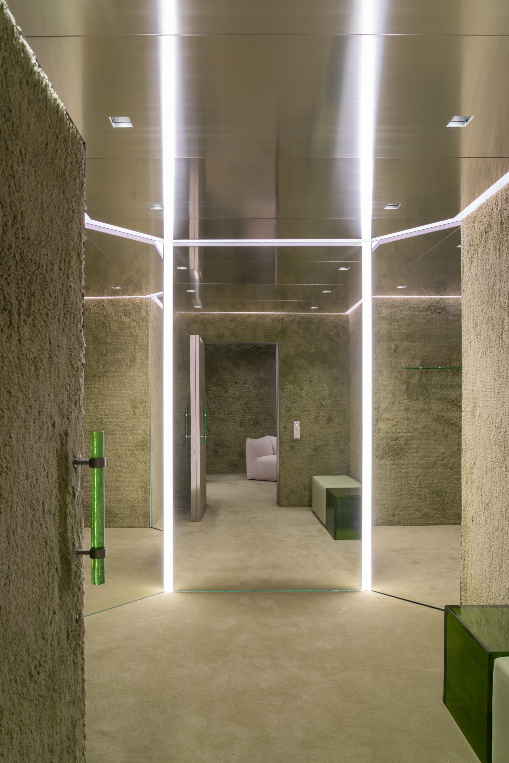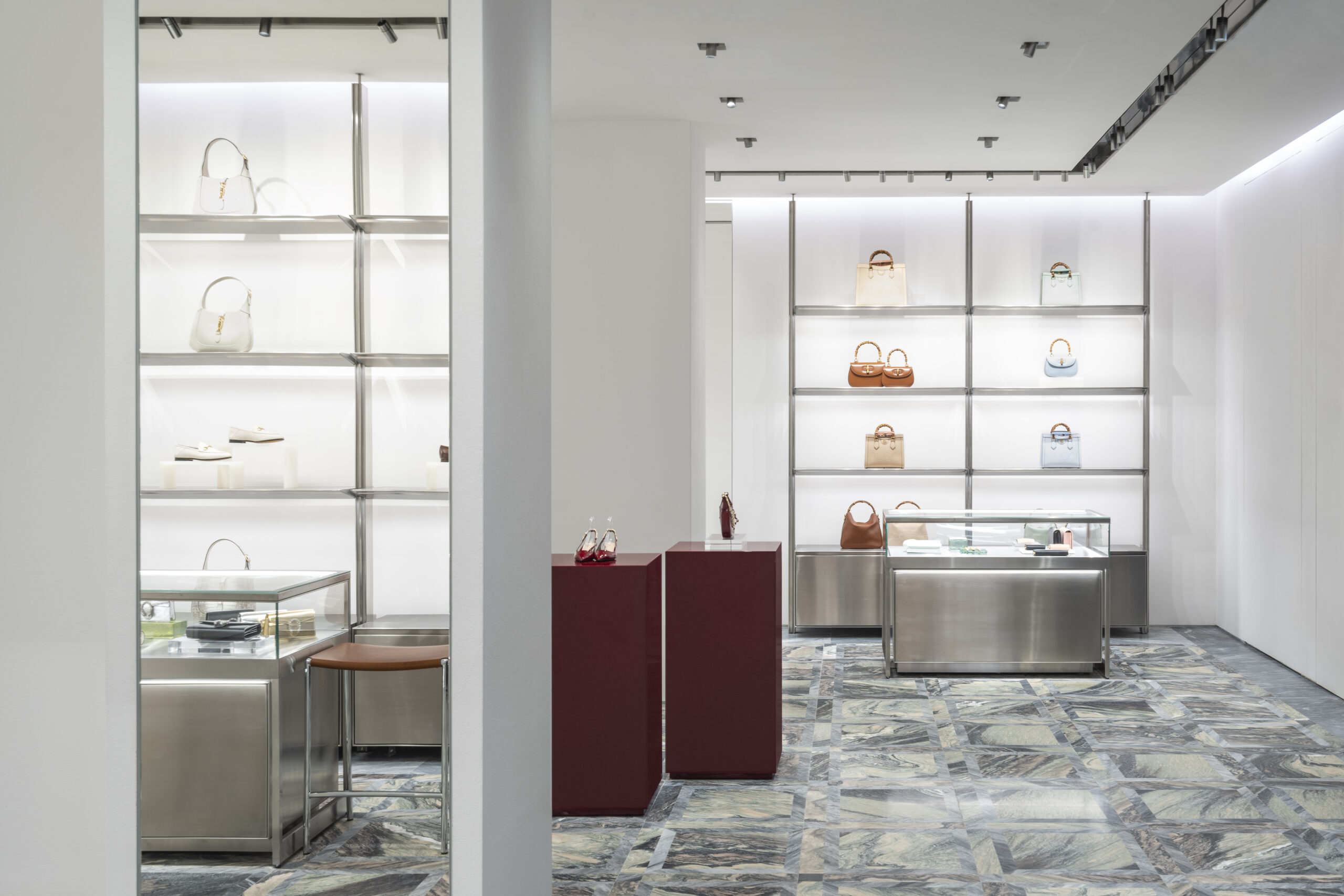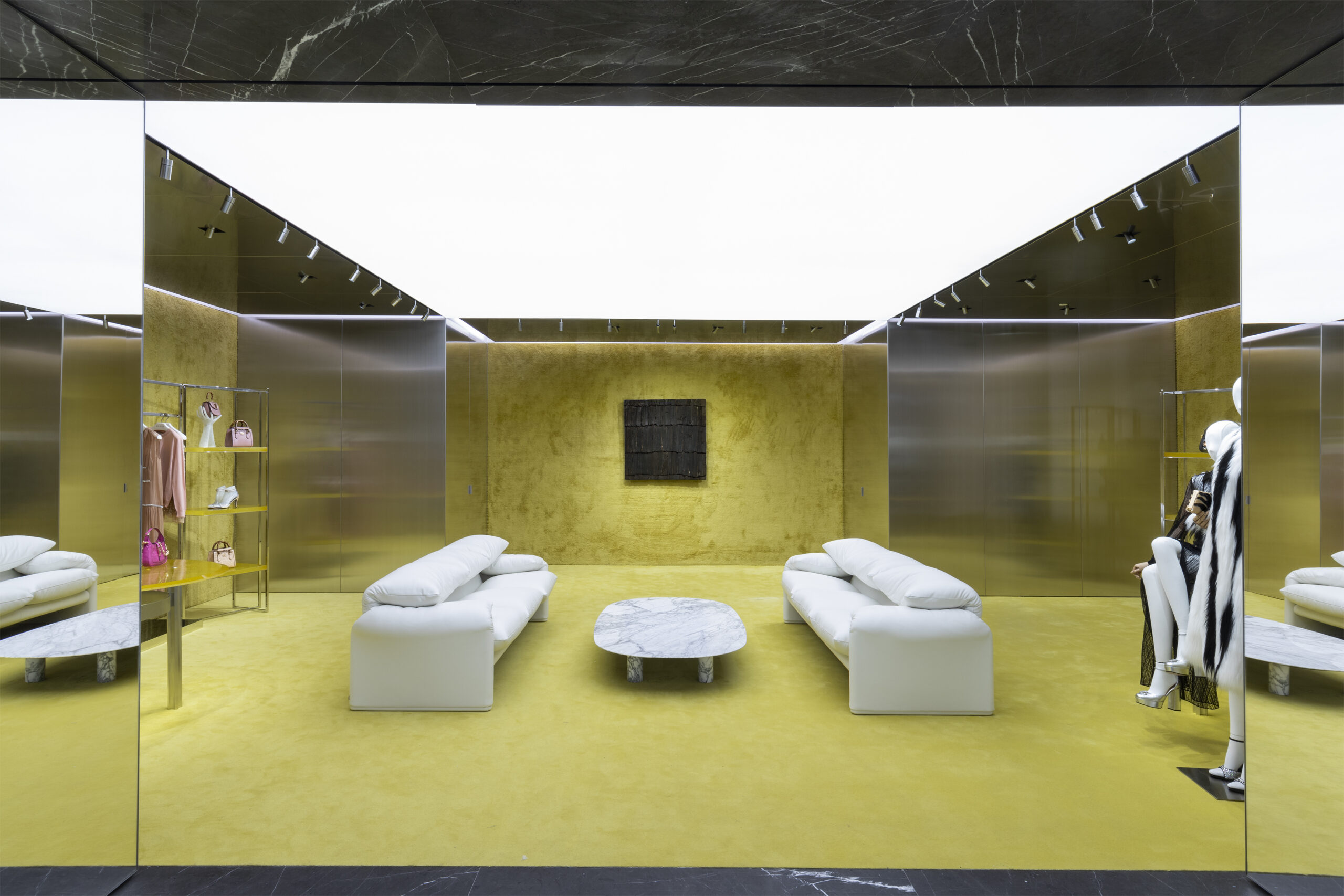 The boutique is a perfect mashup of modernity and tradition, a true tribute to Milanese aesthetics and the values that made Made in Italy famous worldwide. Milanese architecture perfectly marries the creative vision of the new creative director, Sabato De Sarno. Thus, with Cipollino and Bardiglio marble floors, “pulegoso” Venetian glass, furnishings from Cassina, B&B, Living Divani, and Minotti, recognized as icons of Italian design, the new boutique stands as an elegant space and a symbol of style and sophistication.