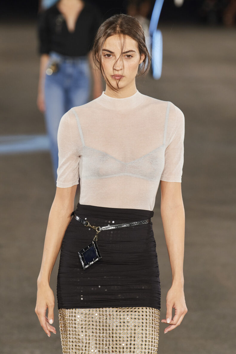Very popular in this Spring/Summer 2023 collection are the volumes, a particular and interesting overlapping of garments not always of the same texture. Then the denim, especially on the trousers, which the designer chooses strictly high-waisted, faded and embellished with accessories at the waist.