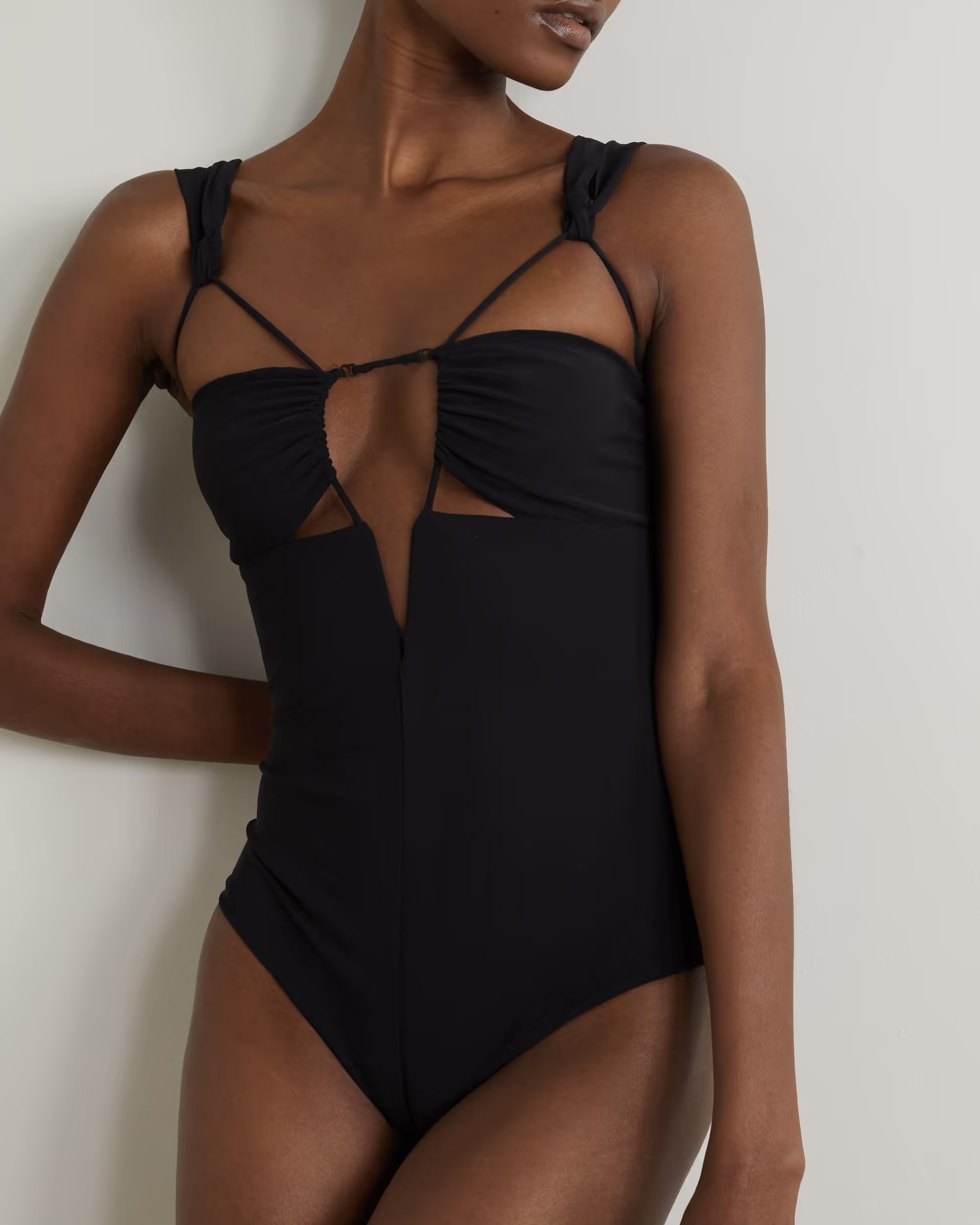 Then, swimsuits with metallic textures are all the rage thanks to the revival of 2000s fashion. And if you love lingerie details, you won’t be disappointed by bikinis inspired by this style; here are underwire tops and balconette-style cups with deep V-necks.