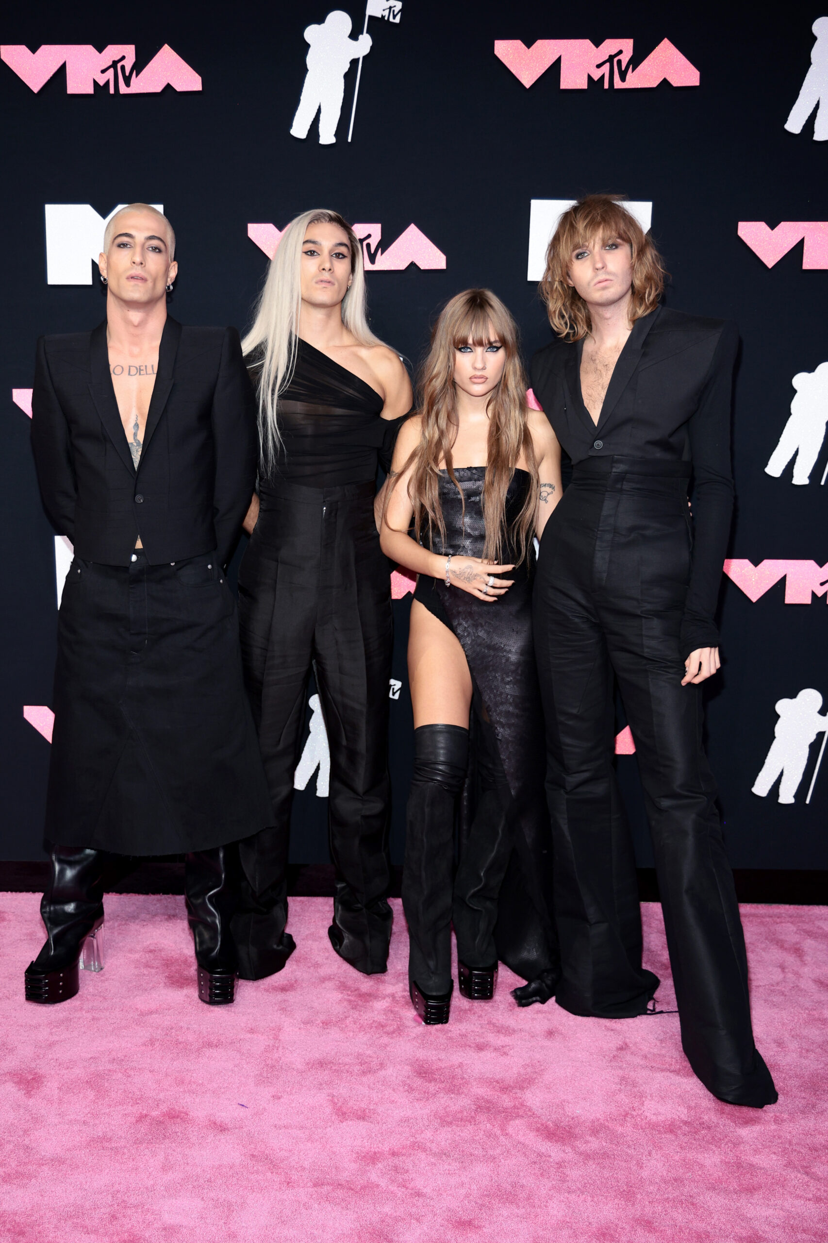 - NEWARK, NEW JERSEY – SEPTEMBER 12: (L-R) Damiano David, Ethan Torchio, Victoria De Angelis and Thomas Raggi of Måneskin attend the 2023 MTV Video Music Awards at the Prudential Center on September 12, 2023 in Newark, New Jersey. (Photo by Dimitrios Kambouris/Getty Images)