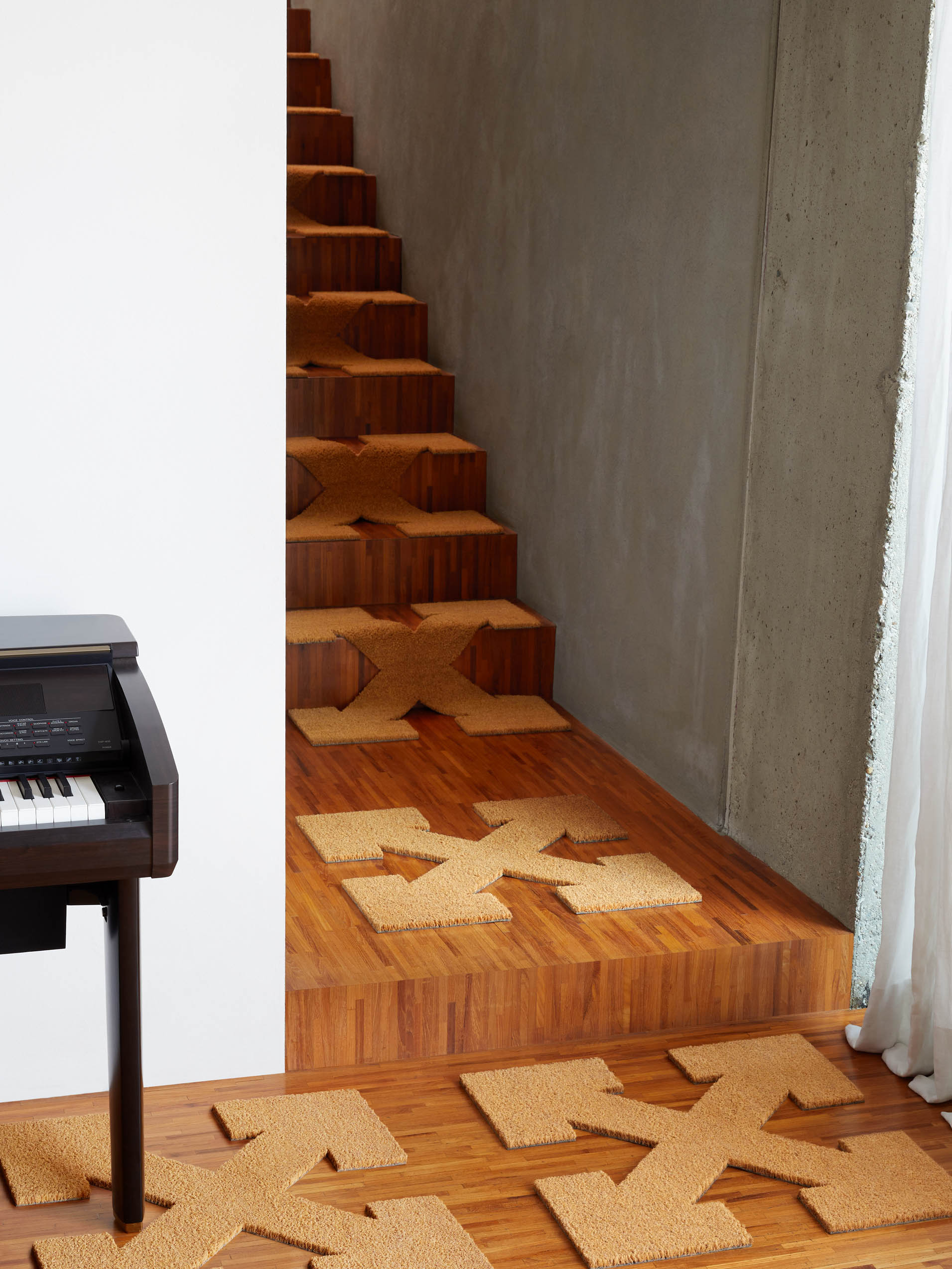 Made of birch plywood and natural oak, the screen and chair feature the Meteor pattern that offers a window on the “front” and the “back”, a portal connection. The orange fluorescent details of the brand develop as hinges on the screen and on oversized orange metal labels with the inscription “HOME”, an element that appears throughout the collection.
