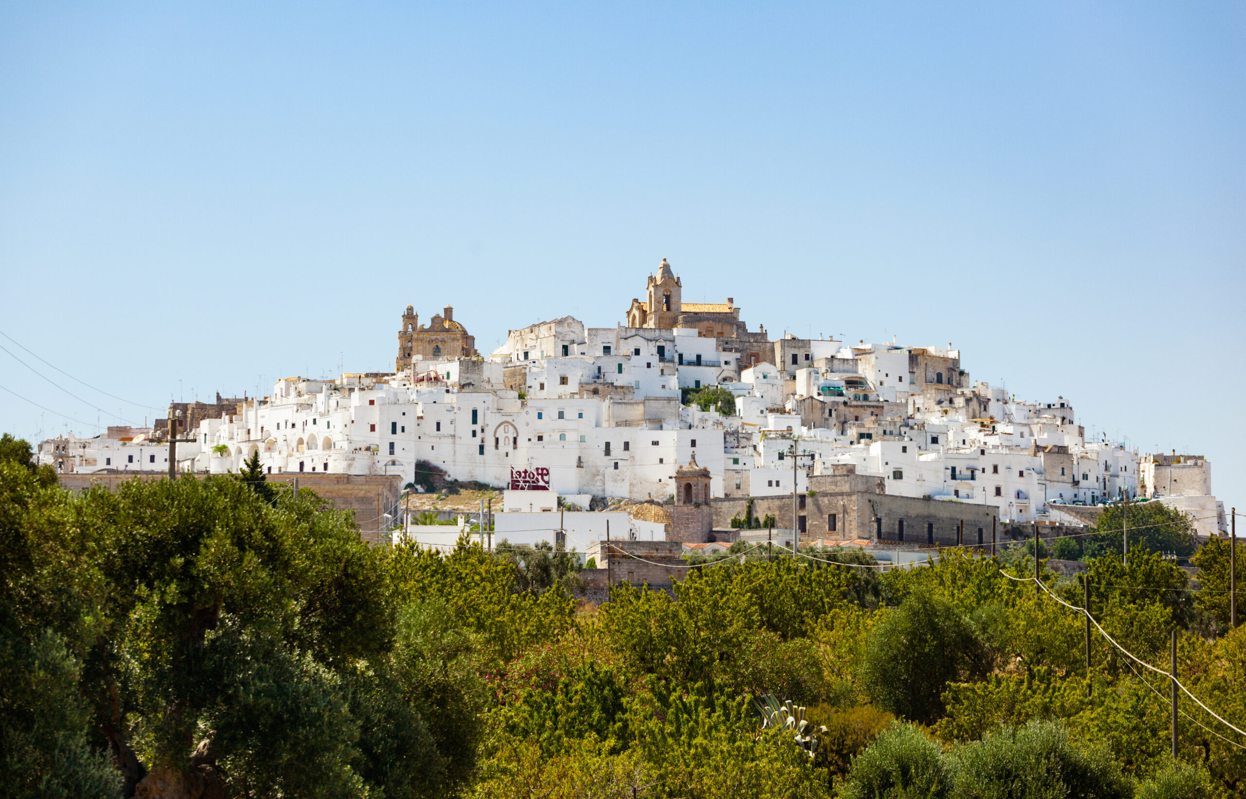 - Ostuni, Italy – August 14, 2014: panoramic view of the white and old city of Ostuni on a hilltop and with the cathedral on top.