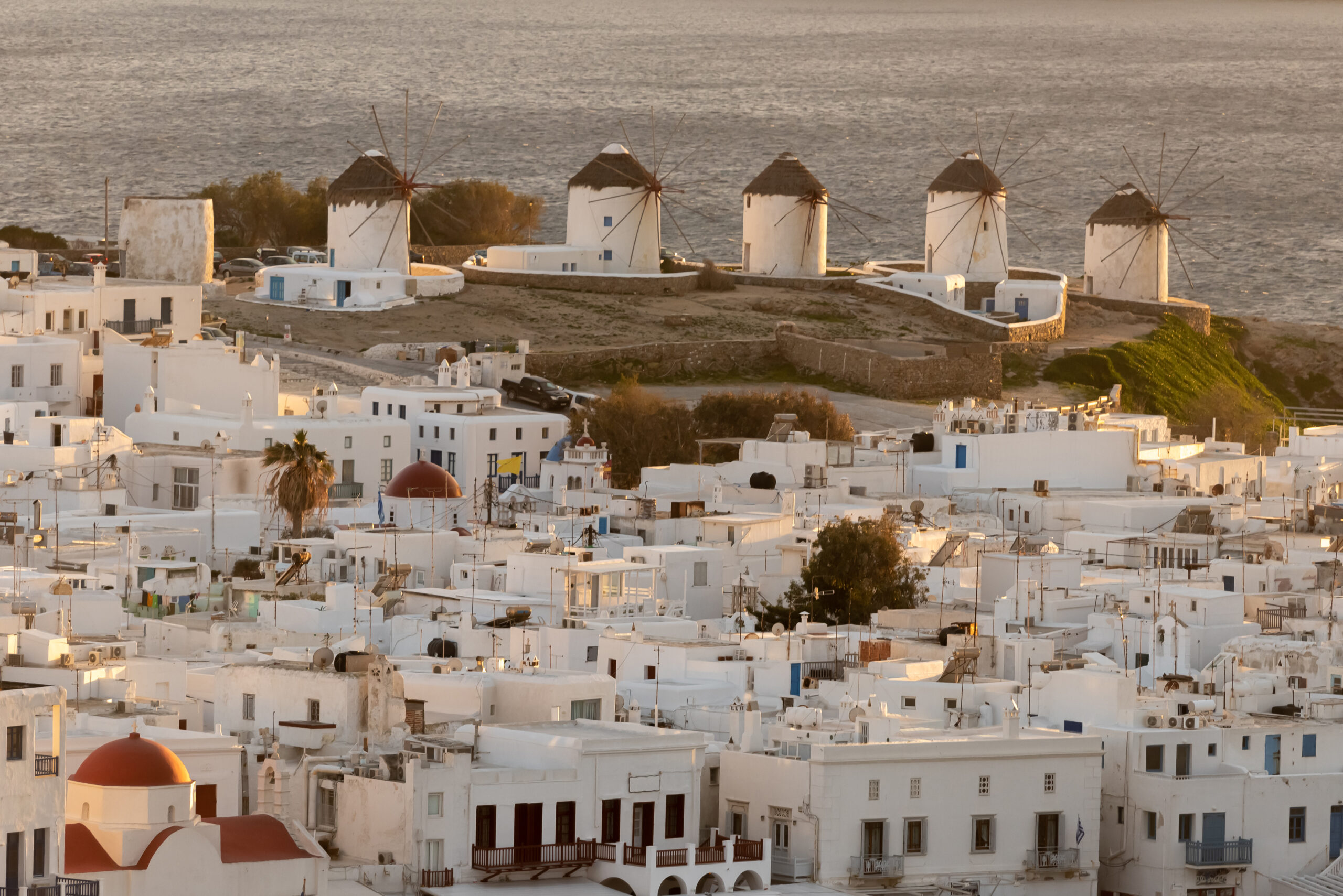 - Sunset view of Mykonos seafront with windmills