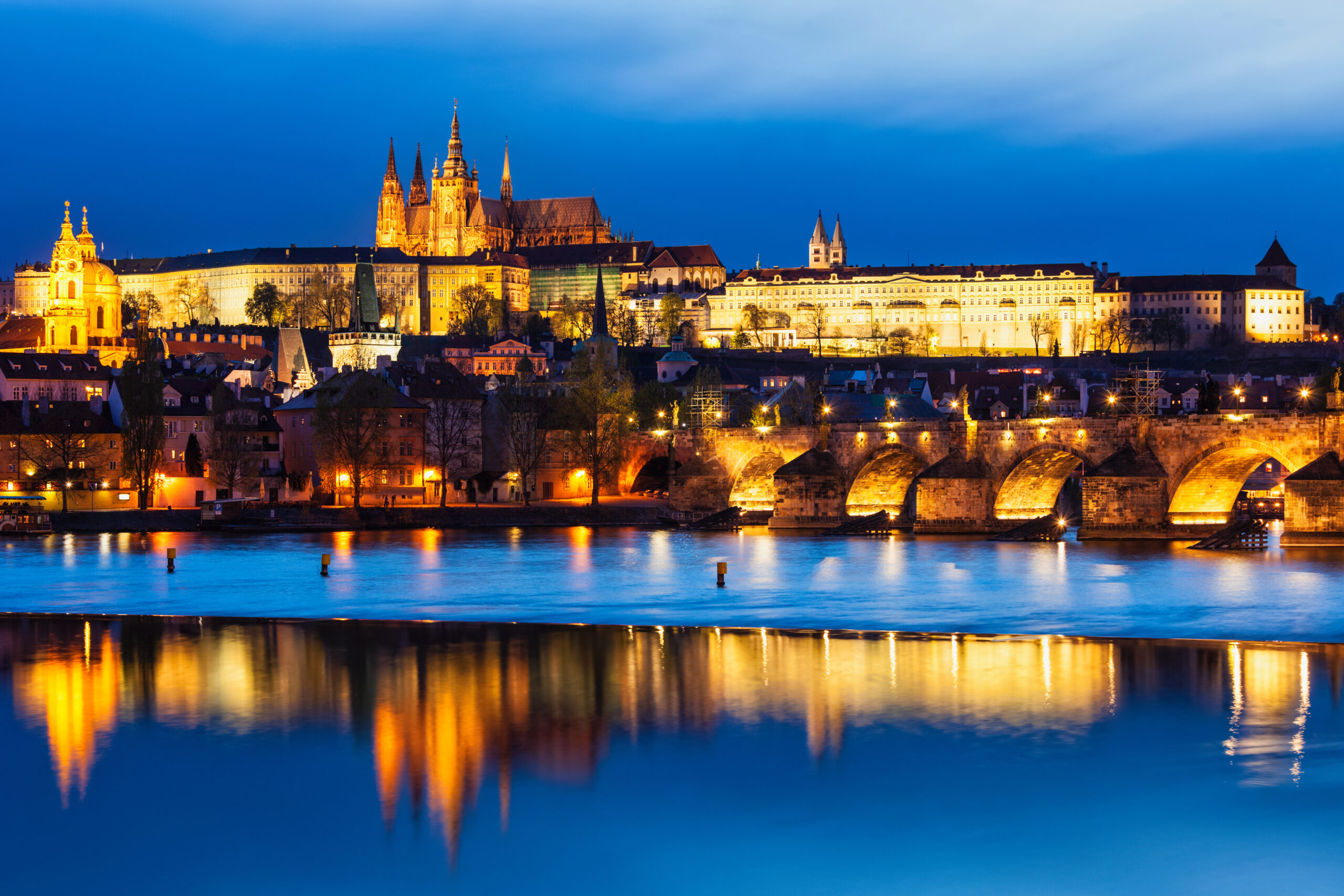 - View of Charles Bridge (Karluv most) and Prague Castle in twilight. Prague, Czech Republic