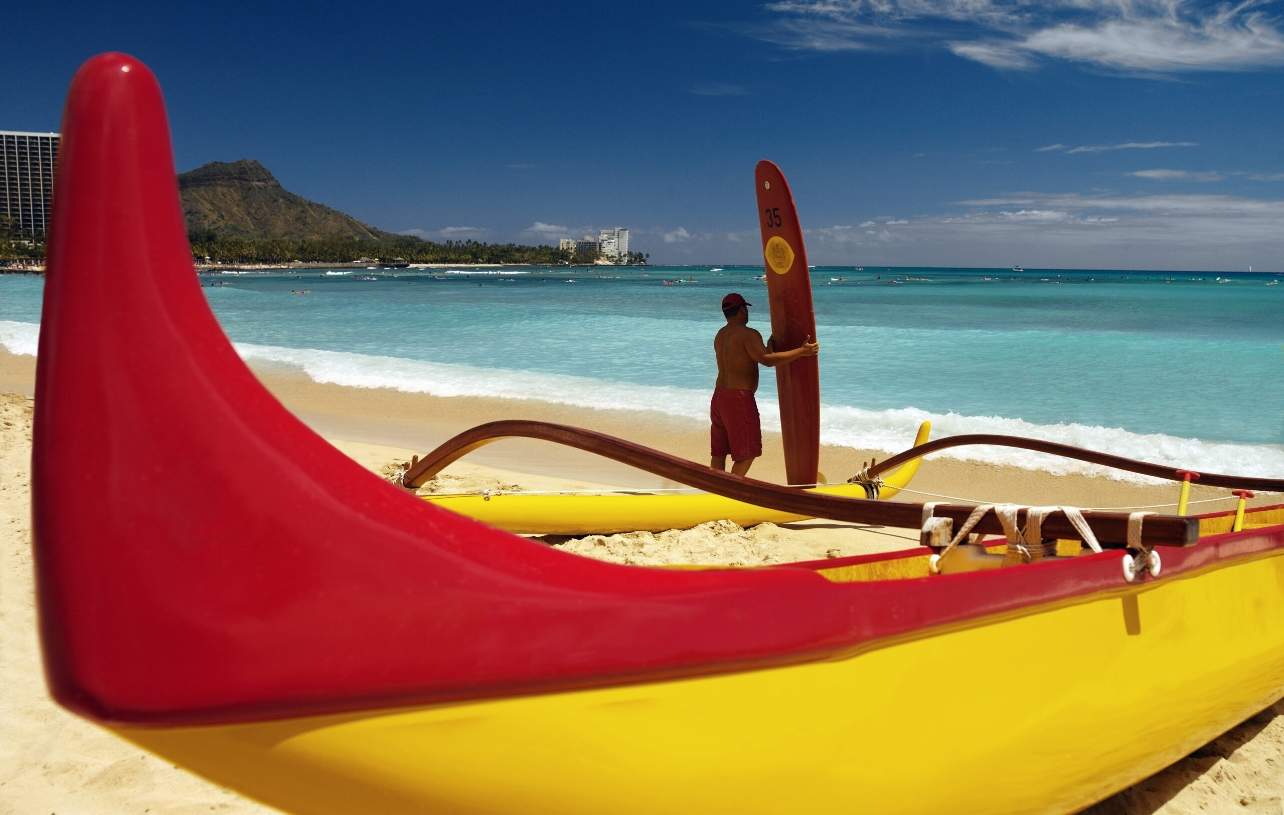 - Outrigger canoe and surfer with a malabu surf board on Waikiki Beach near Diamond Head in Honolulu on the island of Oahu in Hawaii, USA.