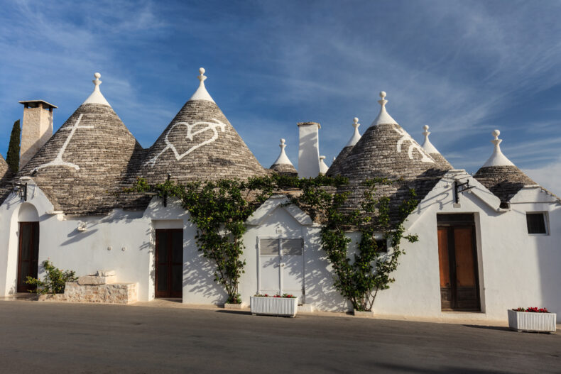 - Trulli houses with painted symbols on the conical roofs in Alberobello, Italy, Puglia