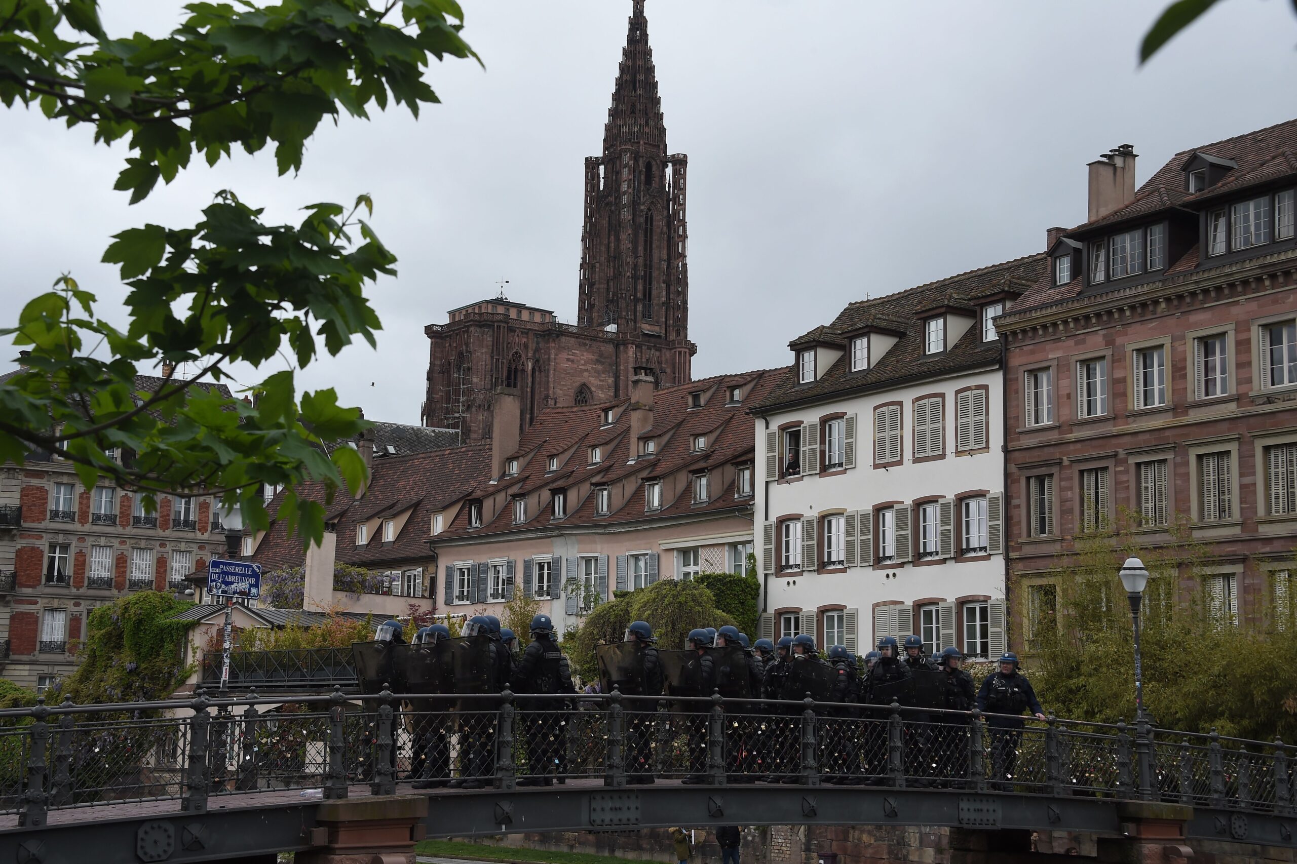 - Riot policemen gather on a bridge during an anti-government demonstration called by the “Yellow Vest” (gilets jaunes) movement in Strasbourg, eastern France, on April 27, 2019. – “Yellow Vest” protesters take to the streets for the 24th consecutive Saturday. (Photo by PATRICK HERTZOG / AFP) (Photo credit should read PATRICK HERTZOG/AFP via Getty Images)