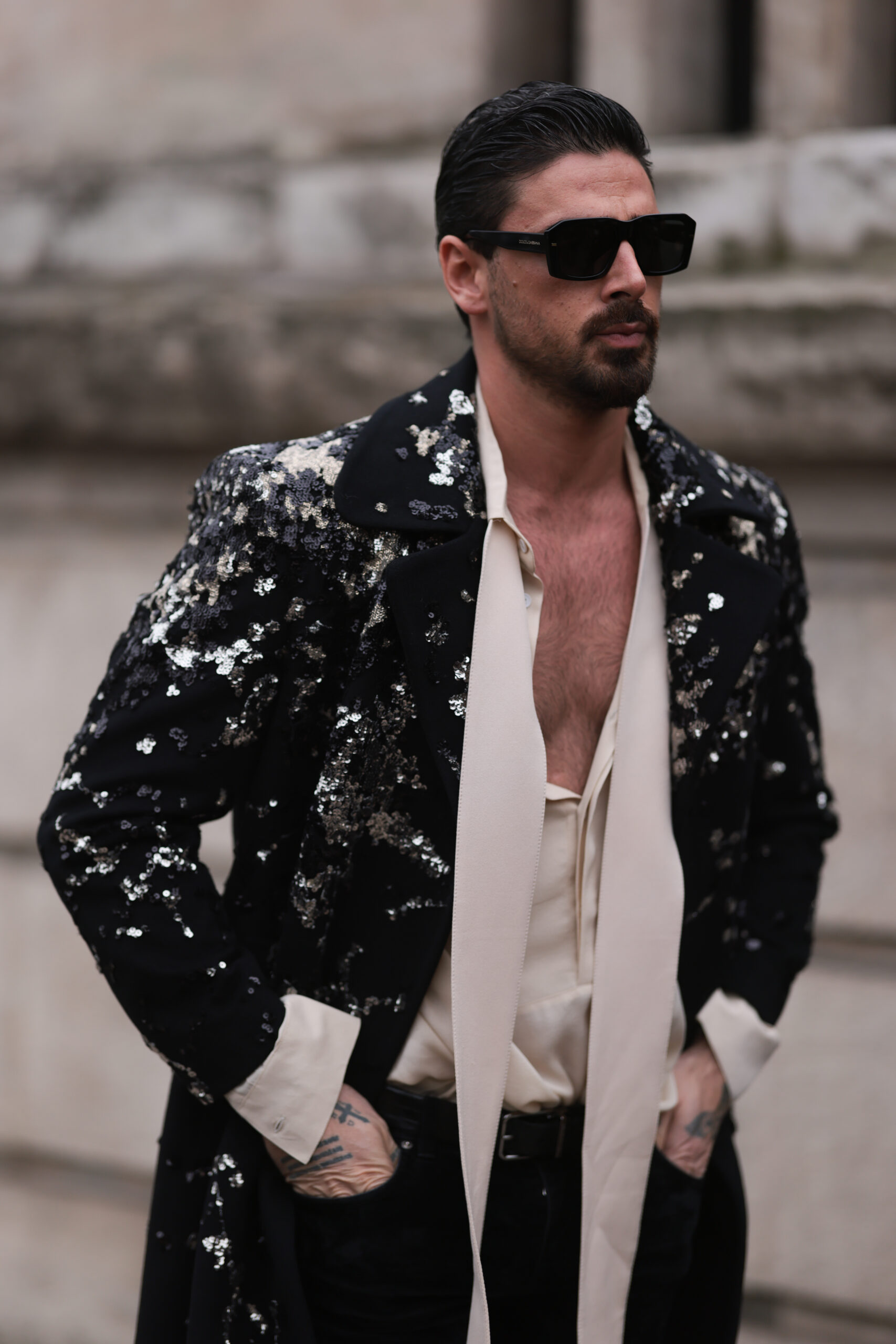 - PARIS, FRANCE – MARCH 04: Michele Morrone wears Dolce & Gabbana black sunglasses, a black sequin suit jacket, a beige satin shirt with a scarf detail, black pants and a black leather belt, outside Elie Saab show, during Paris Fashion Week on March 04, 2023 in Paris, France. (Photo by Jeremy Moeller/Getty Images)