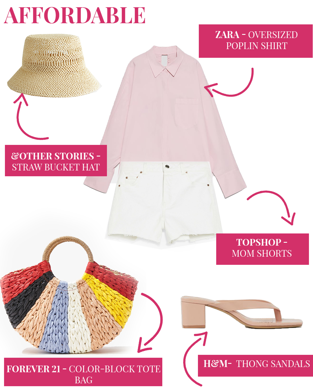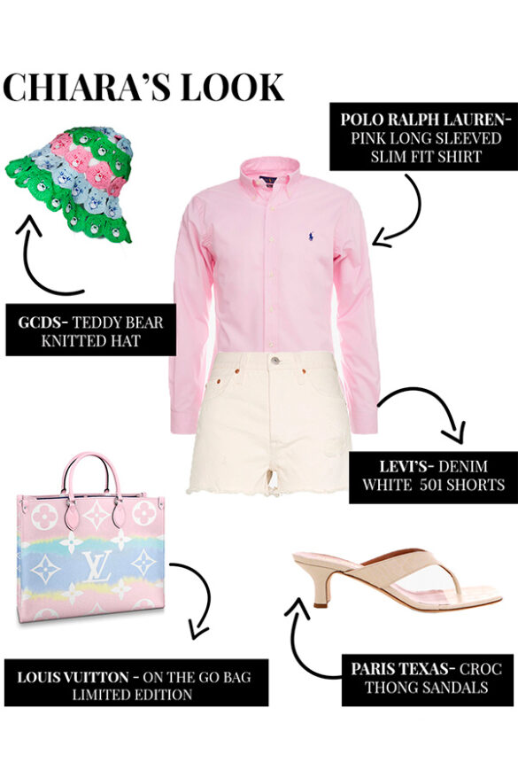 The boyfriend shirt, in this case, Chiara wears one for men, soft and unbuttoned is the perfect ally for the days on the beach: slipped into high-waisted shorts it is super cool for walks and left open over the bikini instead becomes the fashion approved alternative to the pareo. The shorts are in white denim, slightly frayed on the bottom and rigorously mom fit or high waist to mark the waist and make the look more feminine. The trendy touch is given by the bucket hat, worn by Chiara in a super colourful crochet version, but available for this Summer 2020 in many essential variants, such as the straw one. The accessories follow the shades of the look: oversized tote bag, perfect for the beach, and solid colour thong sandals (Review the fashion shows to appreciate their coolness). We have decided to recreate this look for you and provide you with a super affordable but equally glamorous alternative, would you like to discover it? Here’s how to replicate Chiara Ferragni’s Pastels Queen look: