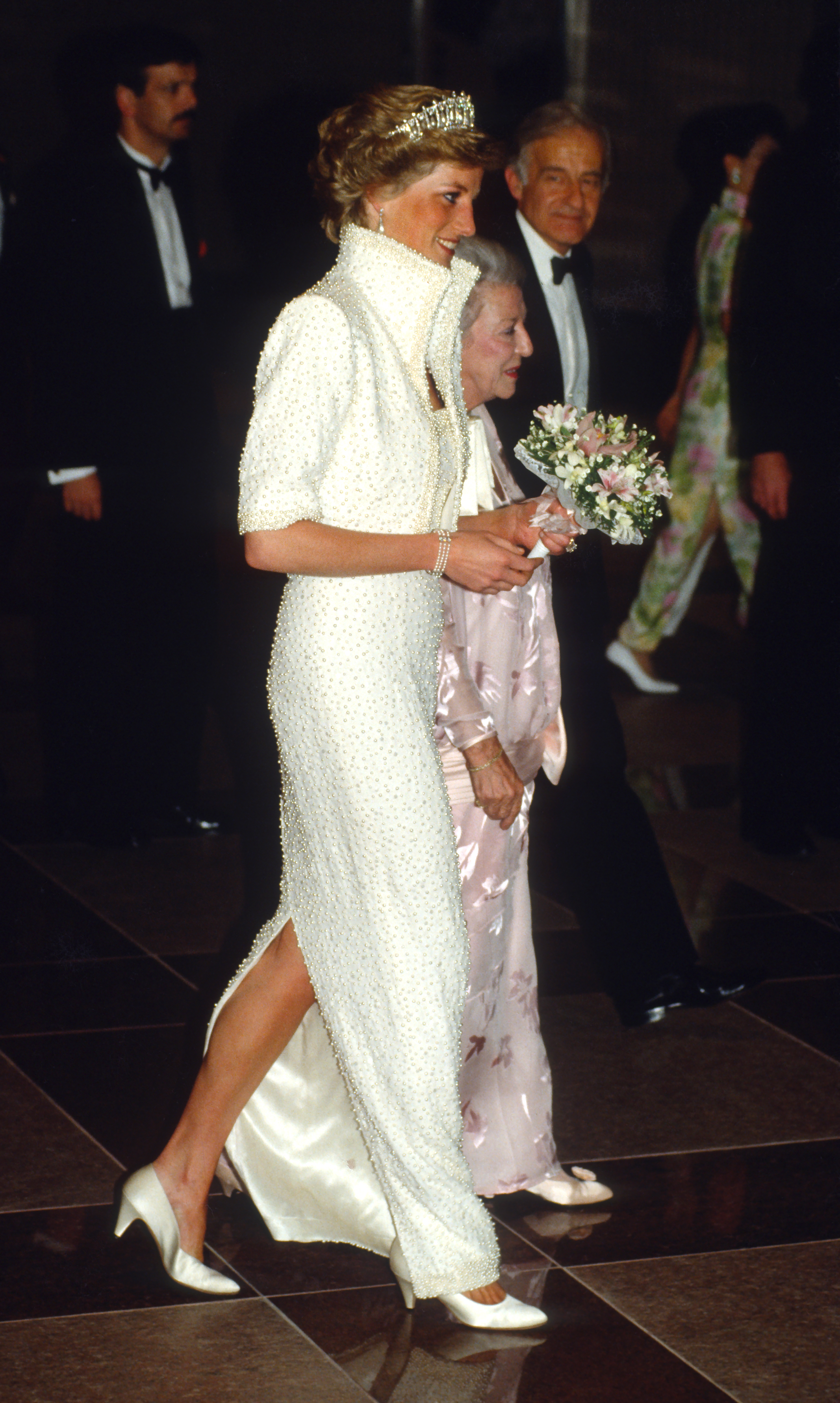 - HONG KONG, CHINA – NOVEMBER 08: Diana, Princess of Wales, wearing a white dress and jacket embroidered with sequins and pearls designed by Catherine Walker and known as the ‘Elvis’ dress with the Cambridge Lover’s Knot Tiara, during a visit to the Culture Centre in Hong Kong on November 8, 1989 in Hong Kong, China.(Photo by Anwar Hussein/Getty Images)