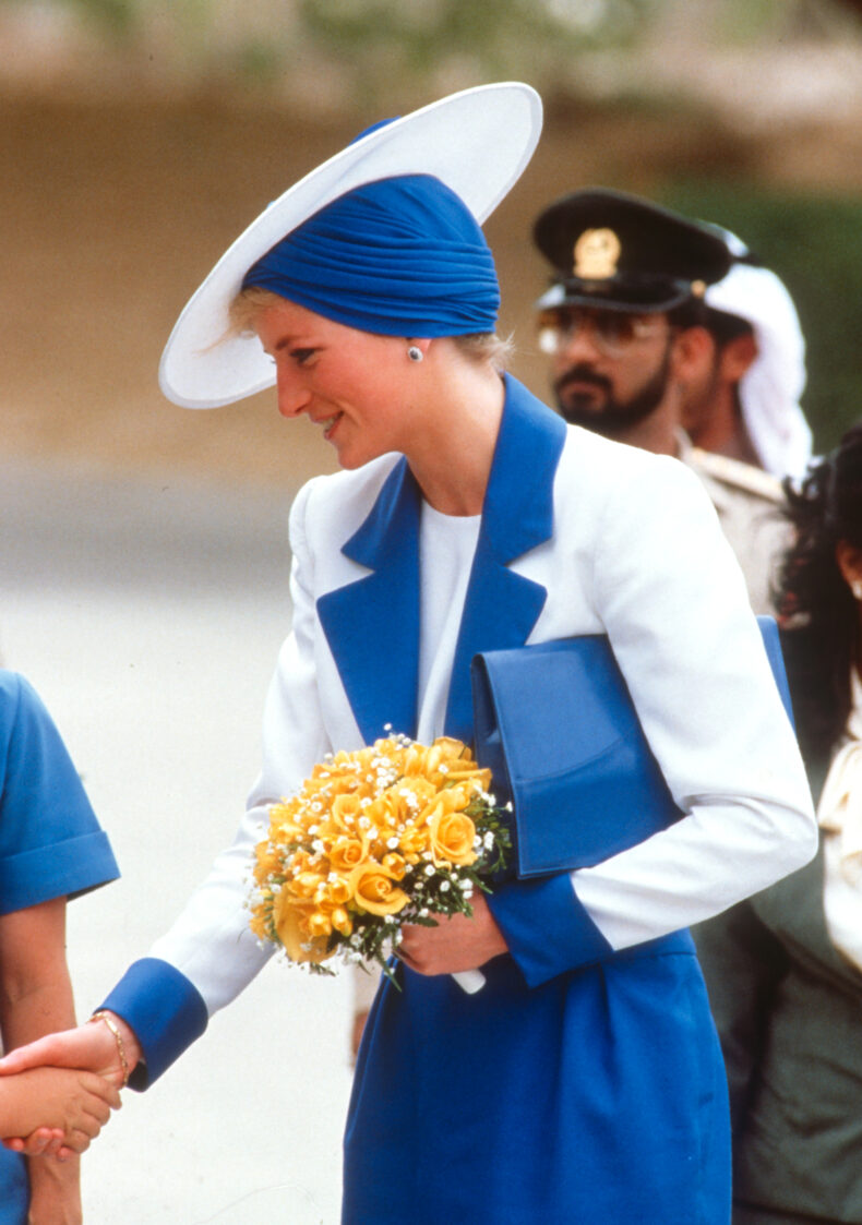 - DUBAI, UNITED ARAB EMIRATES – MARCH 17: Diana, Princess of Wales, wearing a white suit with a blue collar designed by Catherine Walker and a Philip Somerville turban hat, during an official visit on March 17, 1989 in Dubai, United Arab Emirates. (Photo by Anwar Hussein/Getty Images)