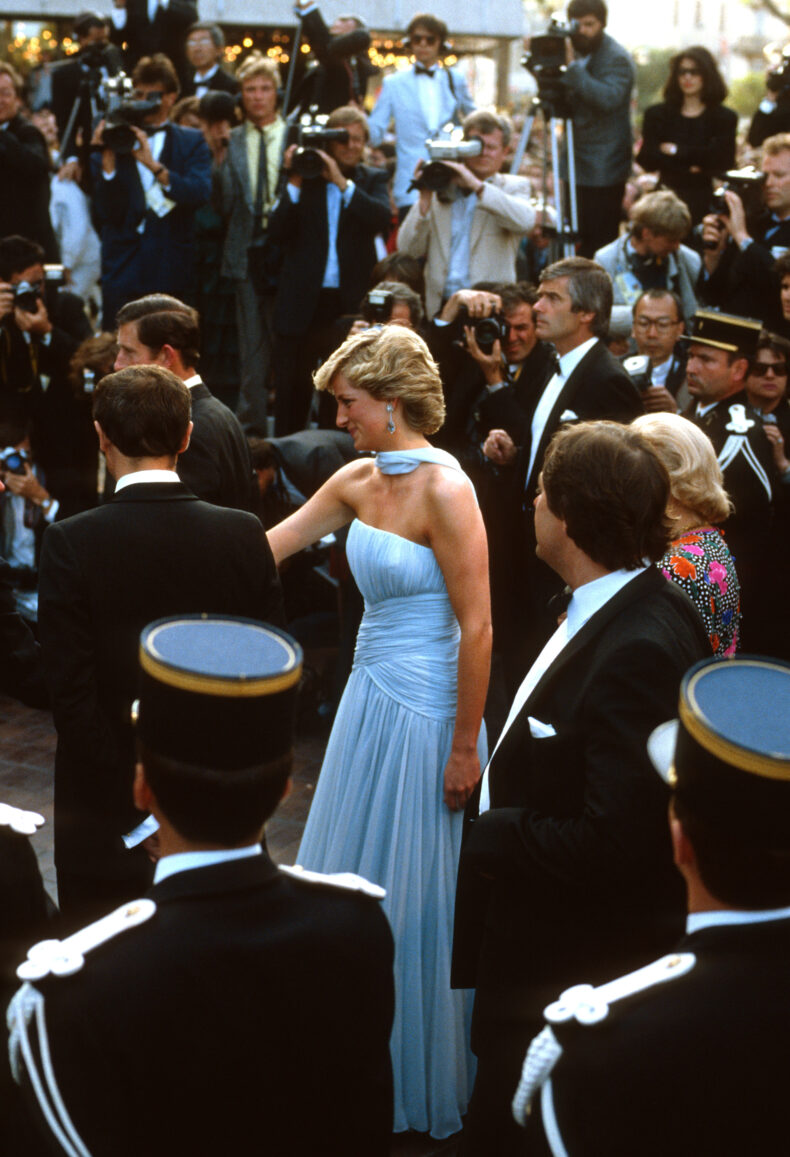 - CANNES, FRANCE – MAY 15: Prince Charles, Prince of Wales and Diana, Princess of Wales, wearing a pale blue silk chiffon strapless dress with a matching chiffon stole designed by Catherine Walker, arrive to attend a Gala night in honour of actor Sir Alec Guinness at the Cannes Film Festival on May 15, 1987 in Cannes, France. (Photo by Anwar Hussein/Getty Images)