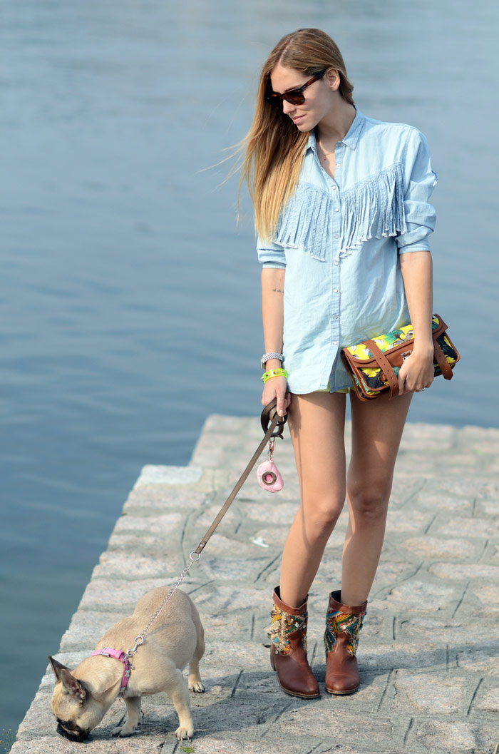 I was wearing DL1961 yellow shorts, MSGM denim shirt, Howsty boots and Proenza Schouler clutch.