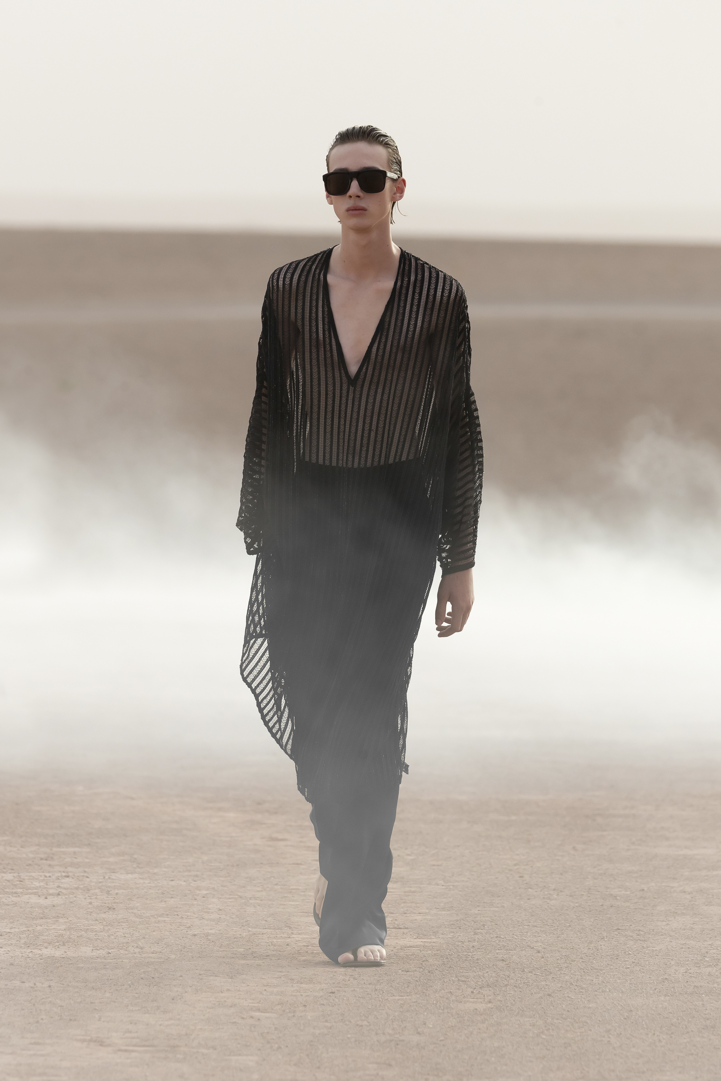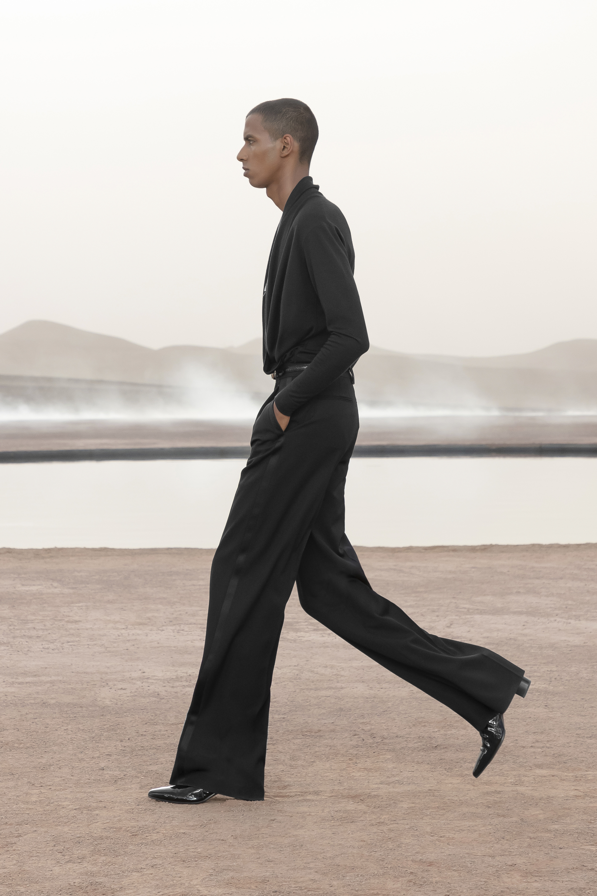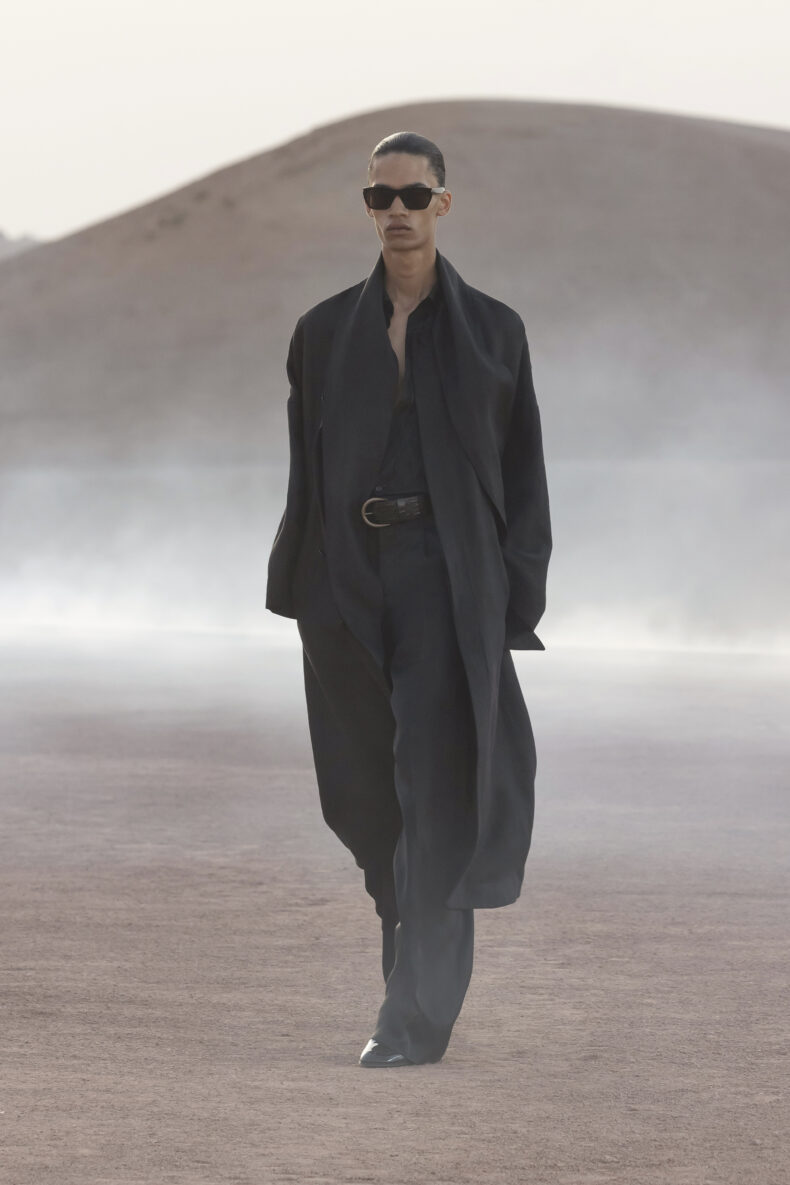 The men’s collection for the upcoming Spring Summer 2023 by Saint Laurent is set in the desert of Agafay, just outside Marrakech. Anthony Vaccarello chooses to pay homage to Yves and one of his best-loved places. Yves Saint Laurent arrived in Marrakech for the first time in 1966, and fell immediately and madly in love with it. The show staged amidst special effects, tailoring and the iconic and emblematic silhouettes – an expression of YSL’s signature codes and Vaccarello’s creative flair – seems almost like a theatrical and cinematographic moment. The role of black and white, of narrow straps and very soft trousers, the elegance of thong sandals and the maxi cardigan paired with an ochre neck scarf. The casual elegance is more than appreciated and marks this fashion show.