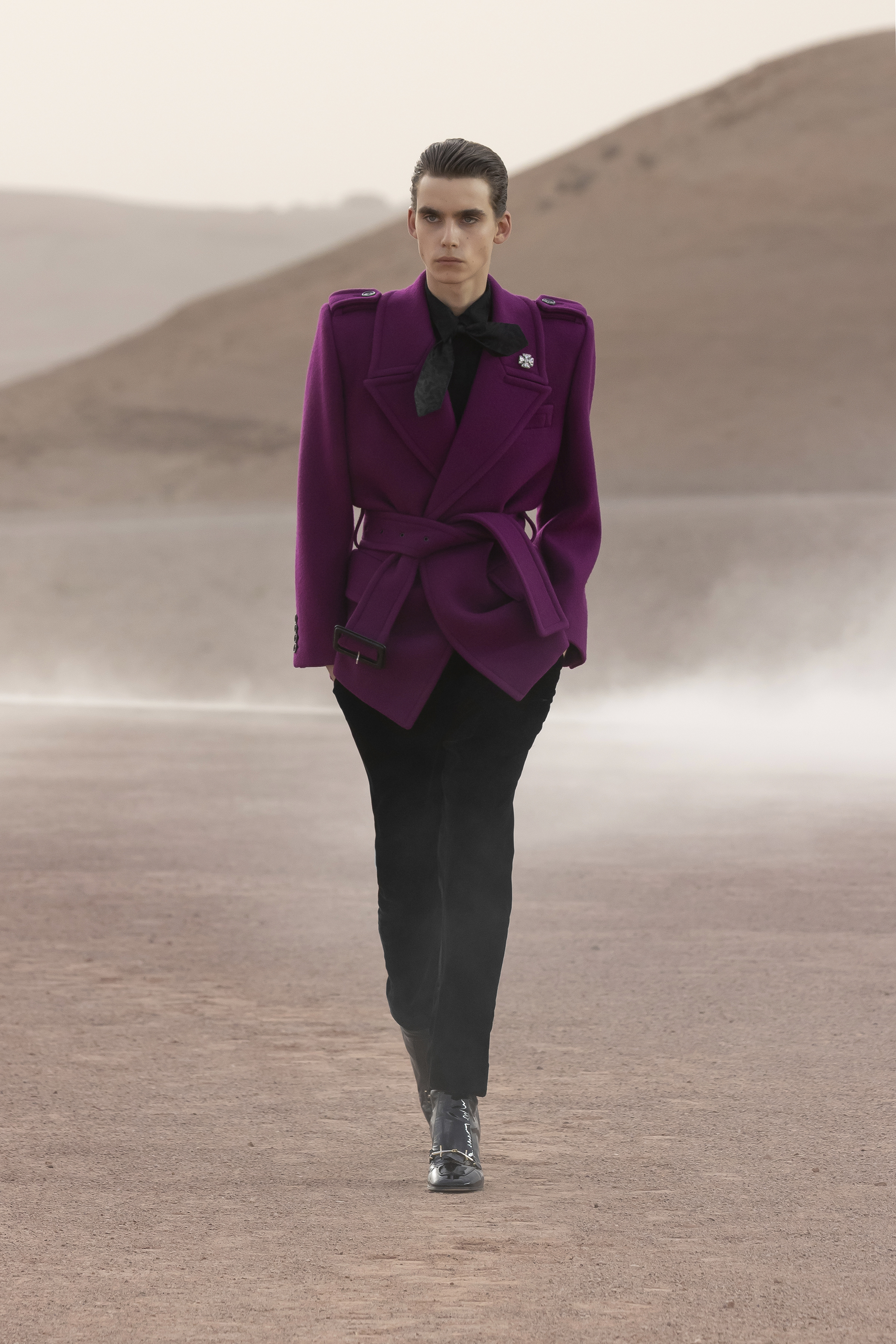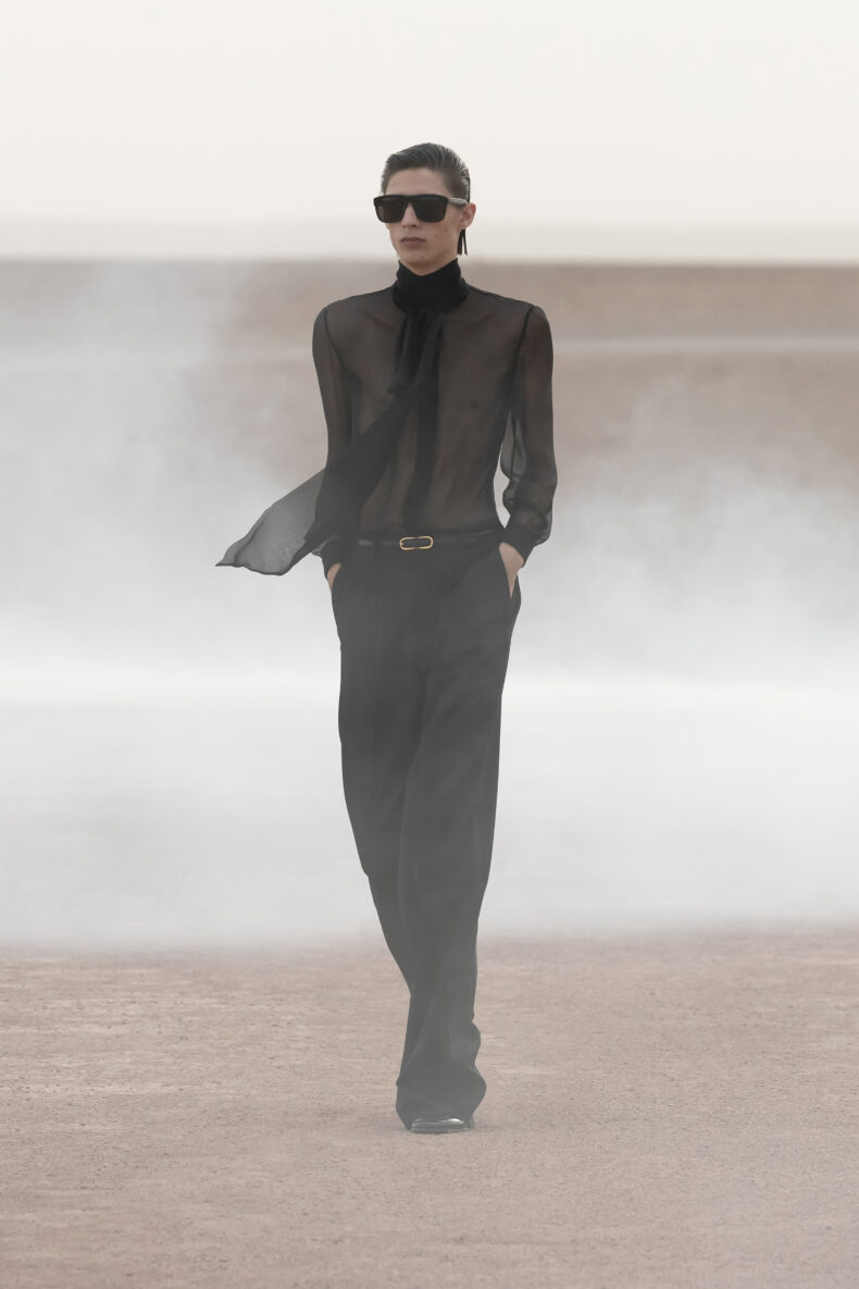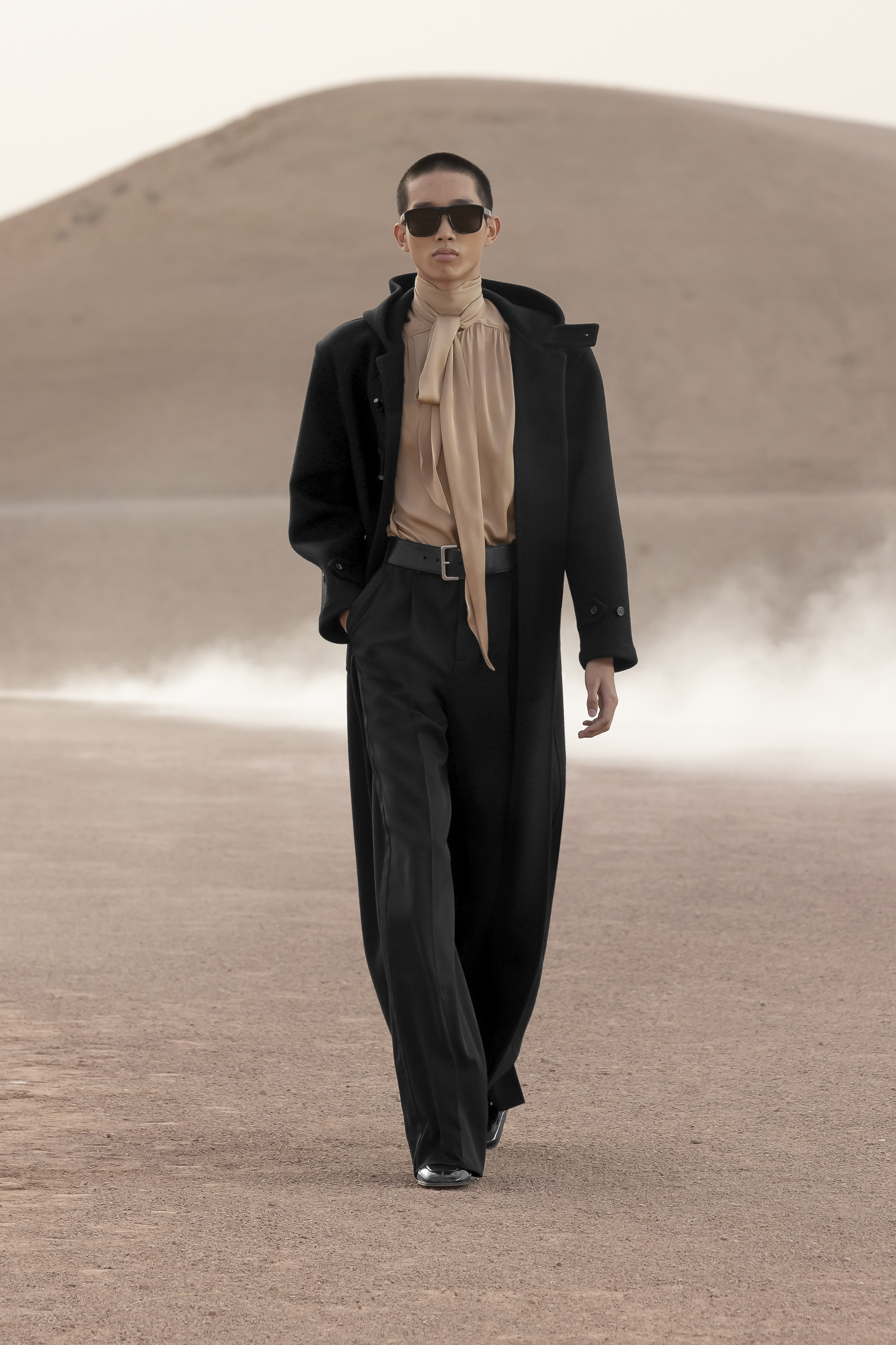 The men’s collection for the upcoming Spring Summer 2023 by Saint Laurent is set in the desert of Agafay, just outside Marrakech. Anthony Vaccarello chooses to pay homage to Yves and one of his best-loved places. Yves Saint Laurent arrived in Marrakech for the first time in 1966, and fell immediately and madly in love with it. The show staged amidst special effects, tailoring and the iconic and emblematic silhouettes – an expression of YSL’s signature codes and Vaccarello’s creative flair – seems almost like a theatrical and cinematographic moment. The role of black and white, of narrow straps and very soft trousers, the elegance of thong sandals and the maxi cardigan paired with an ochre neck scarf. The casual elegance is more than appreciated and marks this fashion show.