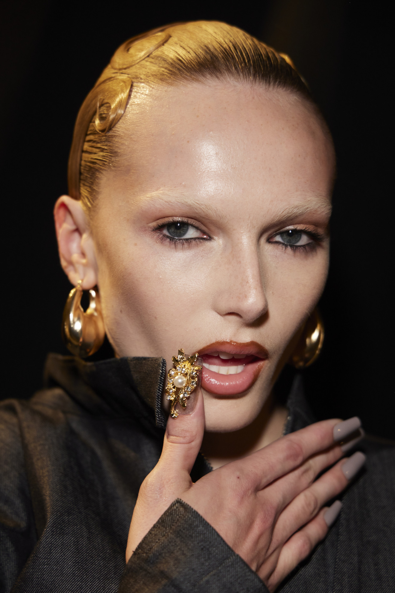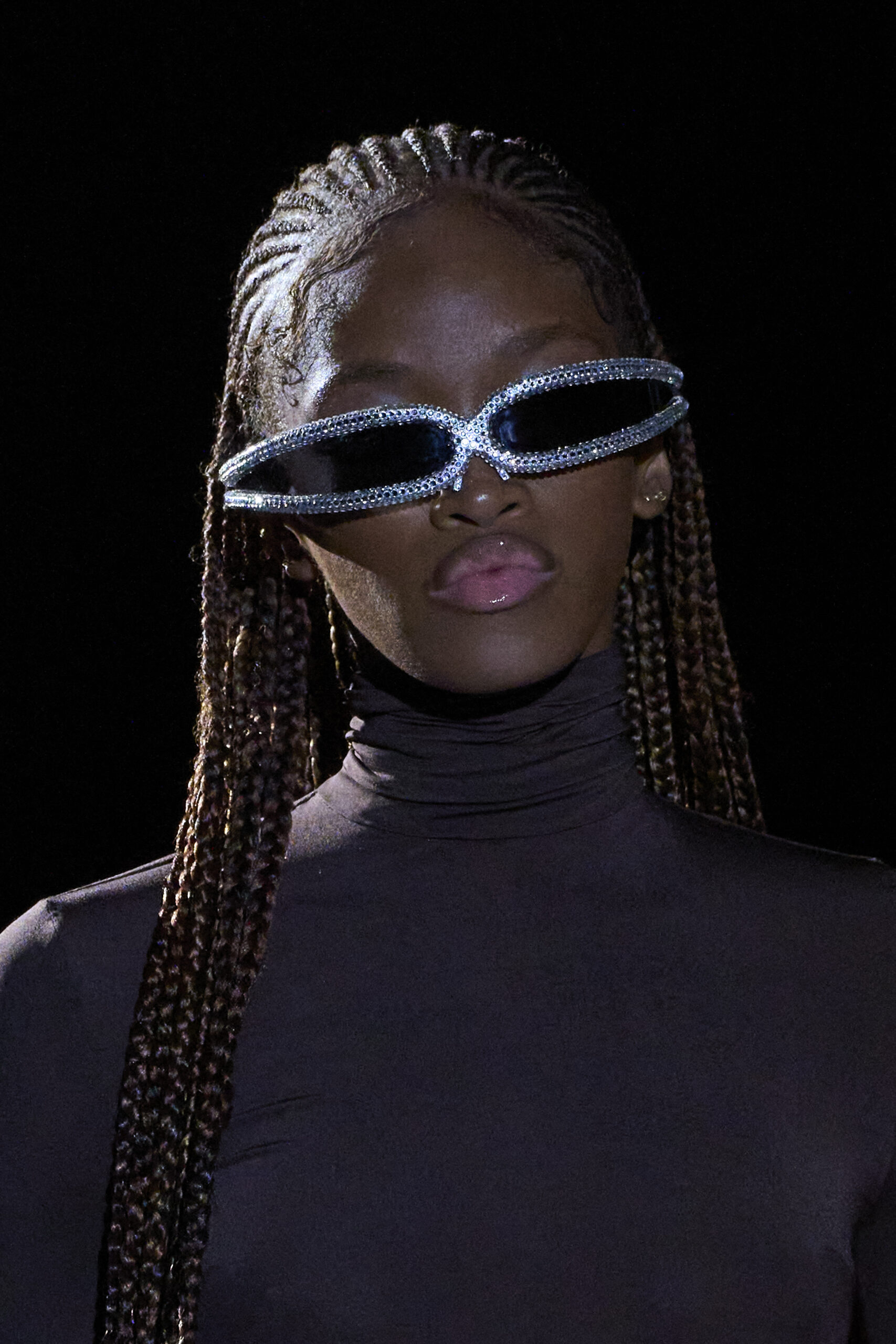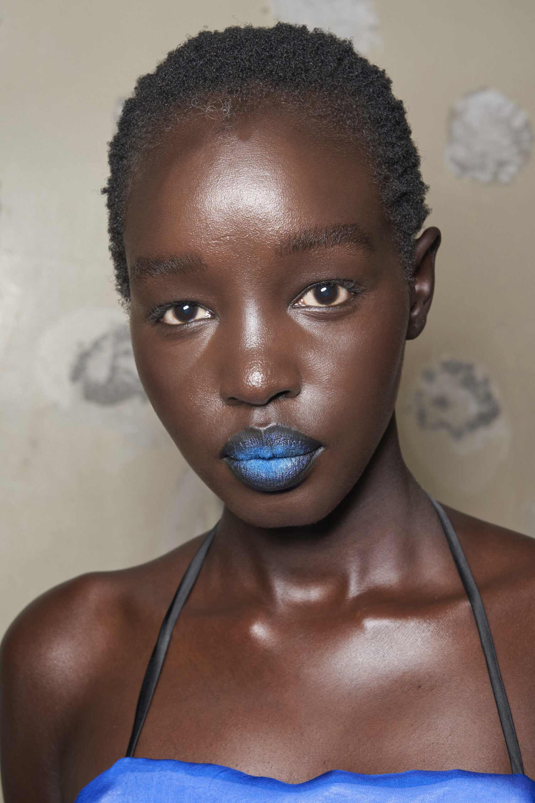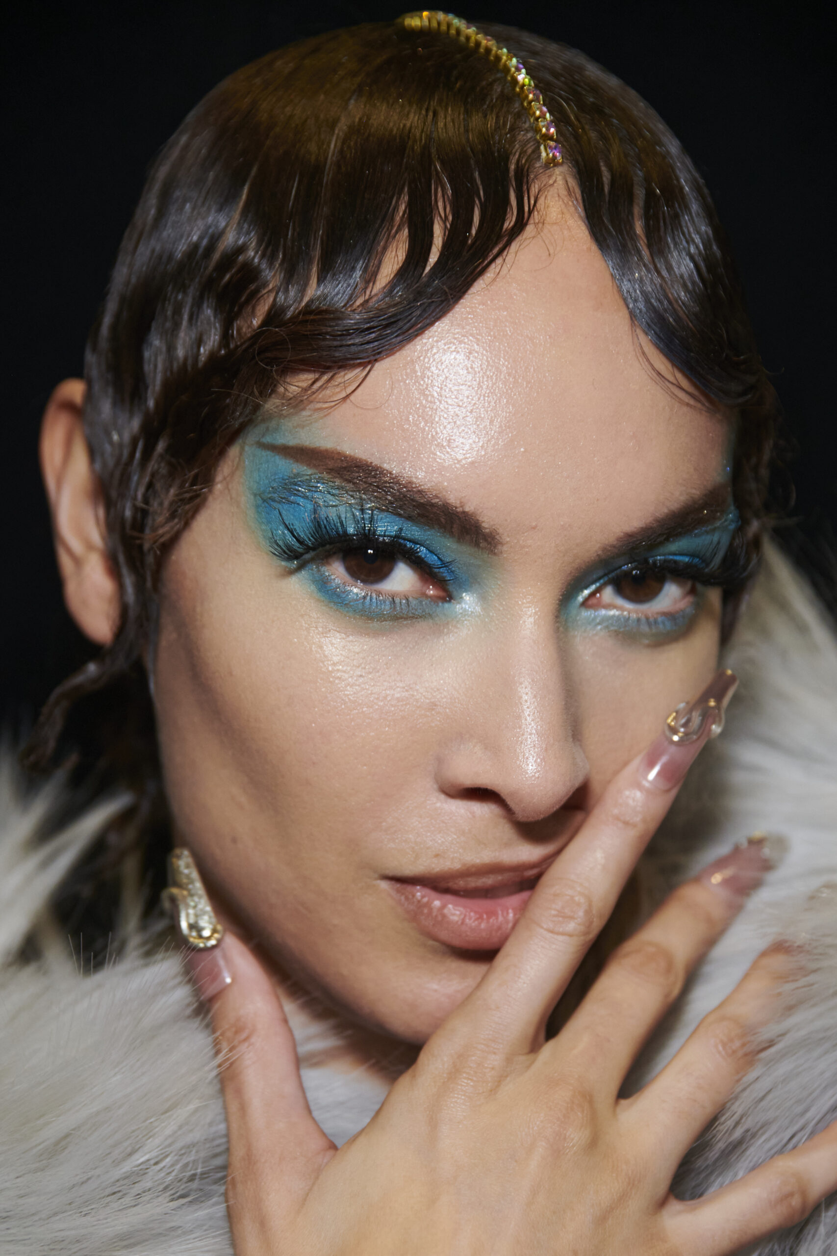 Luar, on the other hand, ensured that its beauty look didn’t go unnoticed. Models showcased thick and pronounced eyeliner, along with bold nail art. Laquan Smith brought the glossy effect to the runway. The skin was radiant and hydrated, with a hint of oil or gloss on the lips, eyes, and cheekbones for an irresistible glossy effect. Botter introduced a touch of blue on the models’ lips. This unusual and surprising look demonstrated how blue can be a runway color, turning makeup into an experimental art form. Finally, The Blonds presented a somewhat theatrical look with blue on the eyes. This look celebrated eclecticism and individuality, proving that fashion and makeup can be forms of artistic expression.