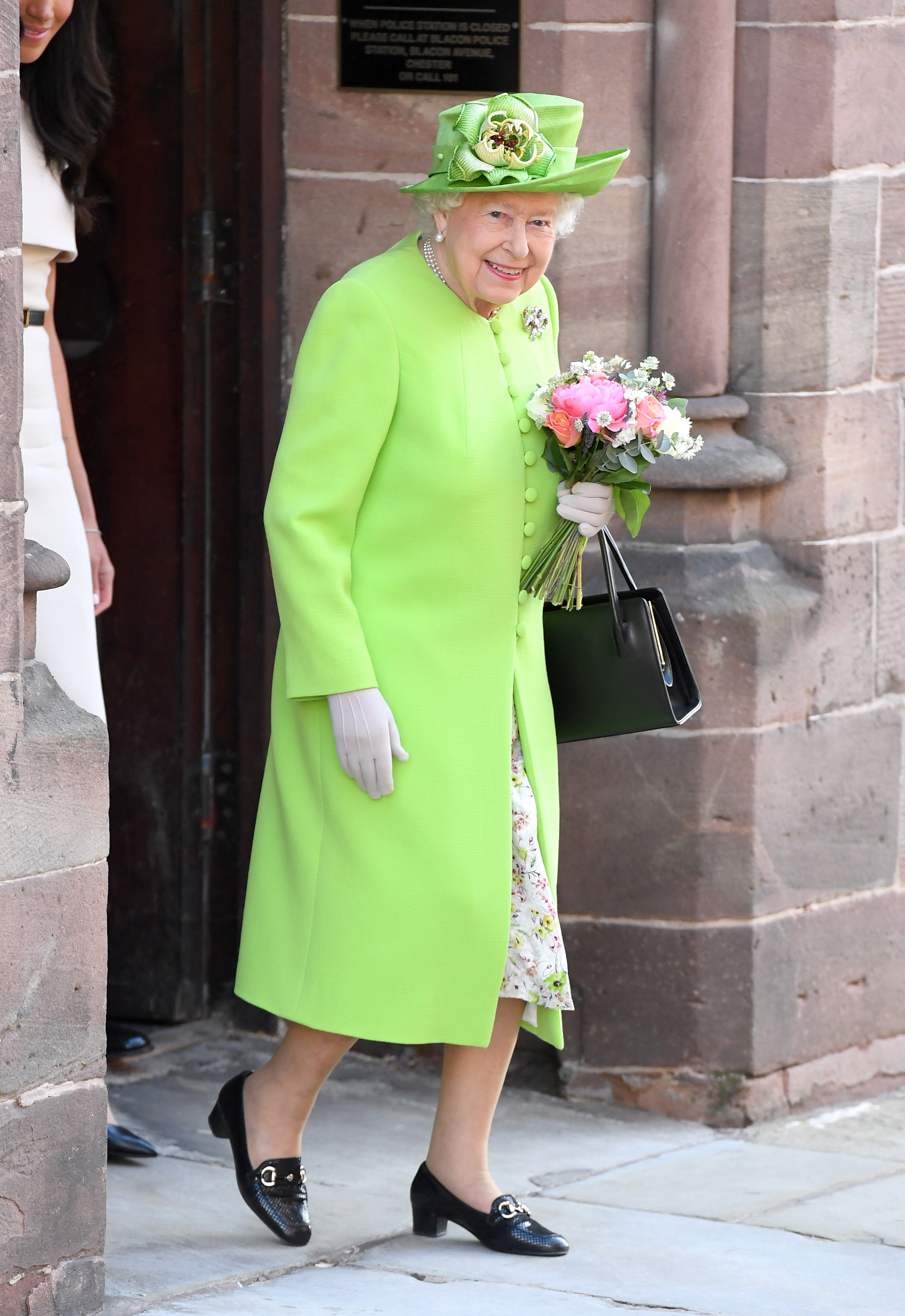- CHESTER, ENGLAND – JUNE 14: Queen Elizabeth II departs Chester Town Hall, where she attended lunch with Meghan, Duchess of Sussex as guests of Chester City Council on June 14, 2018 in Chester, England. Meghan Markle married Prince Harry last month to become The Duchess of Sussex and this is her first engagement with the Queen. During the visit the pair opened a road bridge in Widnes and visited The Storyhouse in Chester. (Photo by Karwai Tang/WireImage)