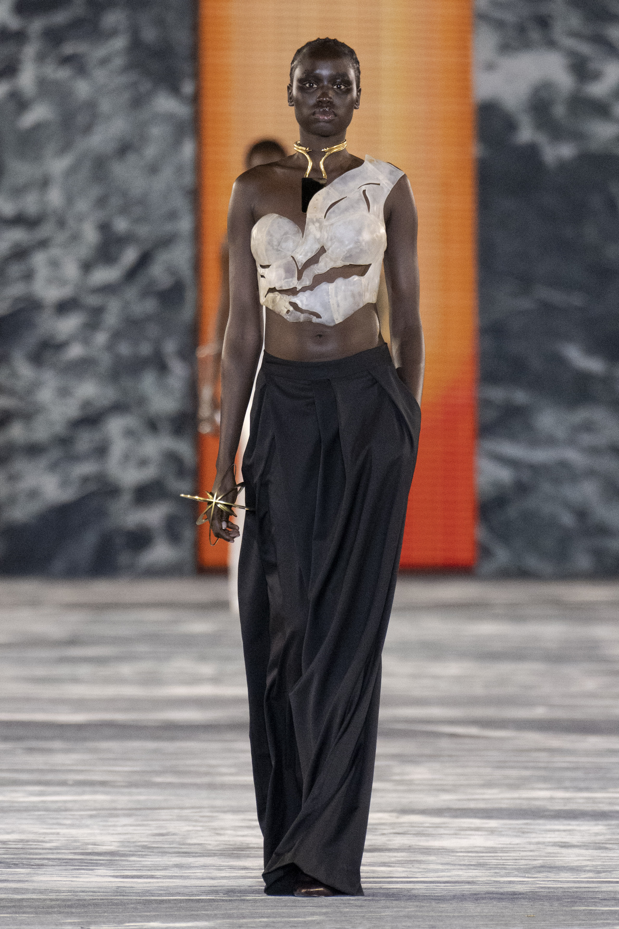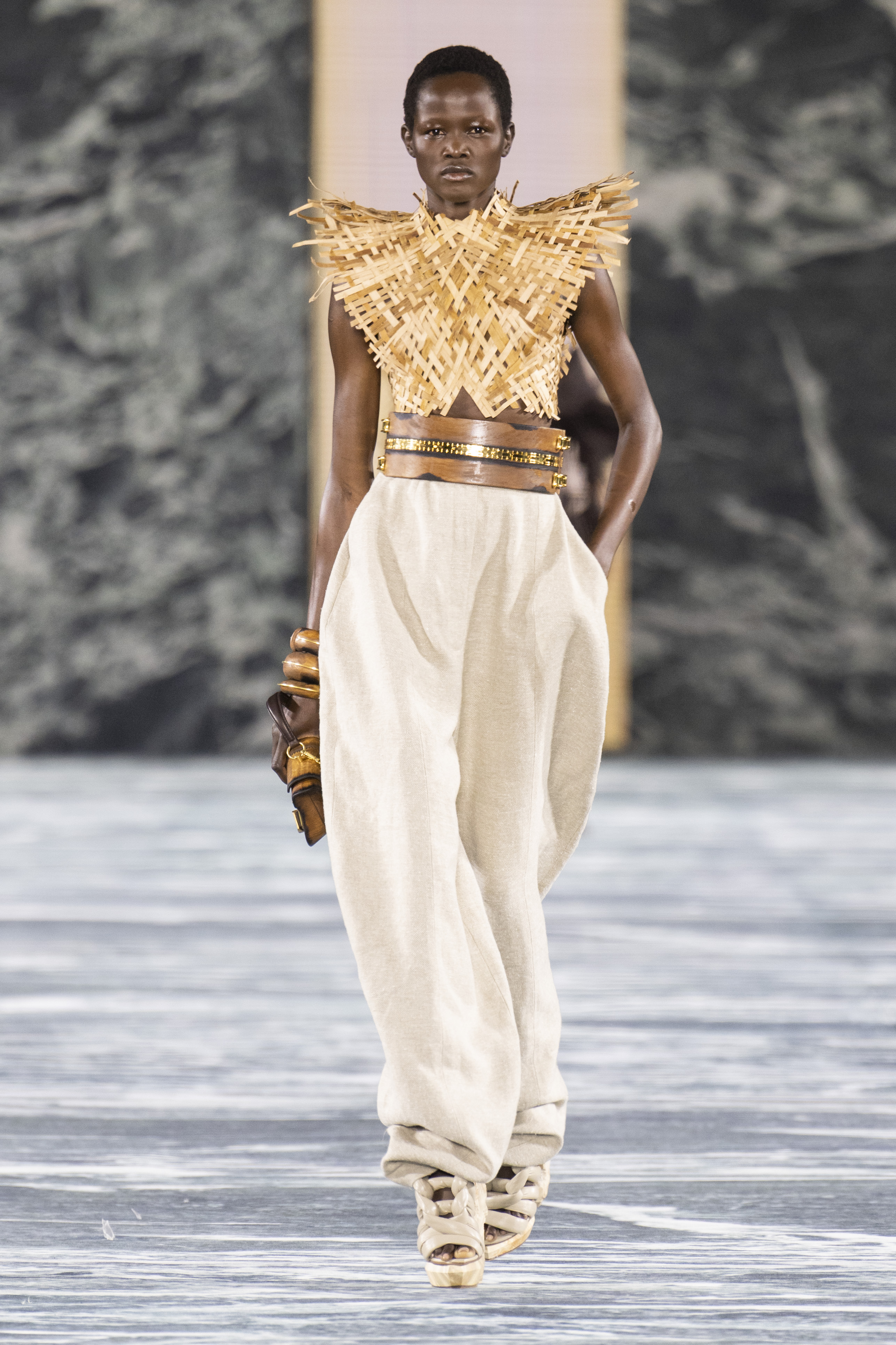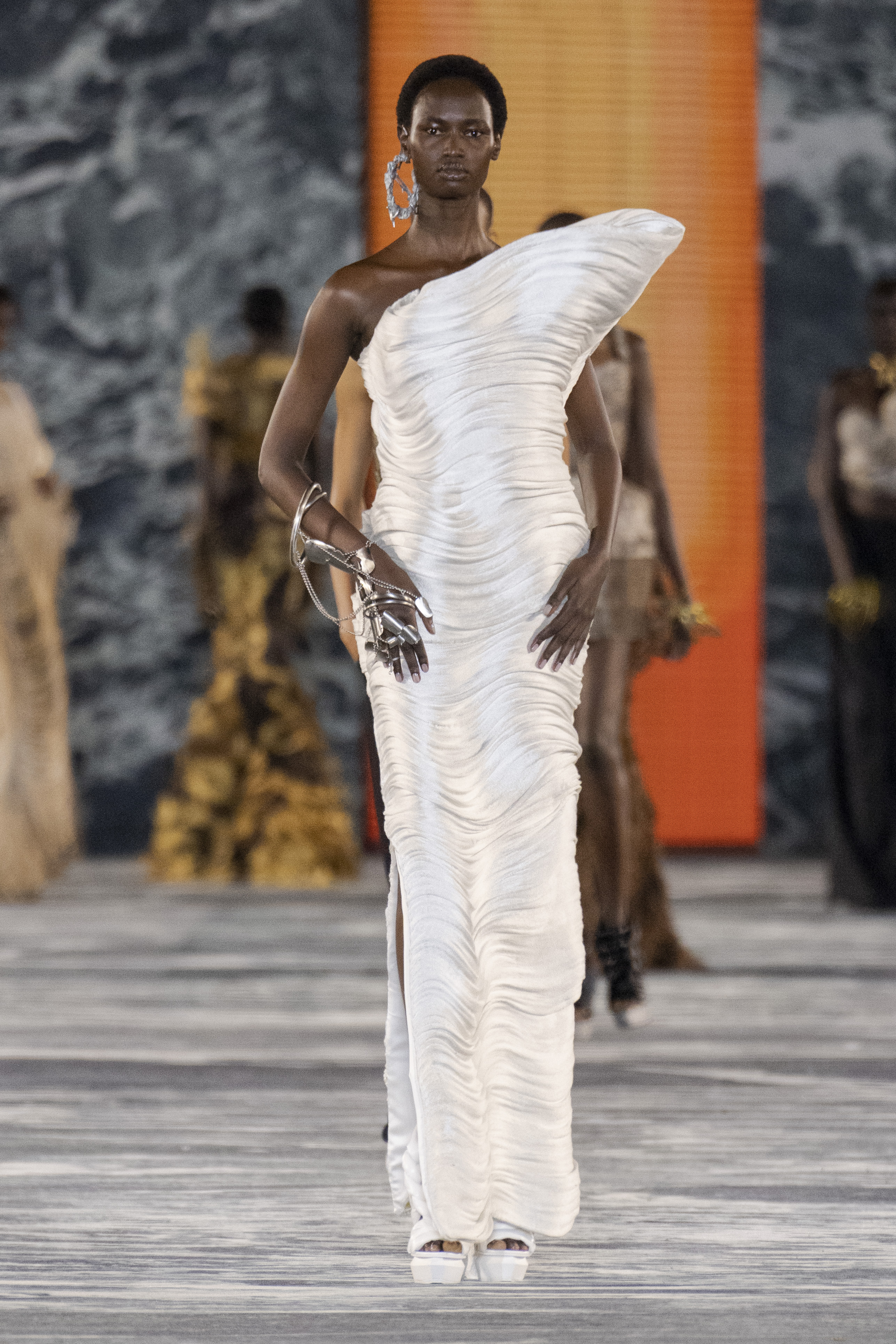 La collezione Primavera Estate 2023 di Olivier Rousteing per Balmain, di oltre 100 look, sembra esser pronta a stupirci. Questa sfilata vede l’alternarsi di due momenti differenti, due collezioni distinte, quella Ready-to-Wear e la Couture. L’immaginario si presenta quasi al 100% sostenibile, il designer ha difatti utilizzato tessuti di carta, banana e vimini per la collezione couture. La visione creativa di Rousteing invece – più o meno sostenibile che sia -, si sa, sembra aver ben poco di reale. I suoi capi, in particolar modo quelli couture, rendono più che difficoltosa la camminata alle modelle. Non troppe novità, alcuni pezzi sembrano addirittura esser stati estrapolati dalla collezione in collabo con Jean-Paul Gaultier. Per concludere, i tecnici del settore sembrano non aver apprezzato le tempistiche dello show, sono in molti infatti a non aver vissuto il famigerato momento Cher. Ça vas sans dire, lo spettacolo deve continuare, questa volta con Cher. Ma come sarebbe stata questa collezione senza di lei?