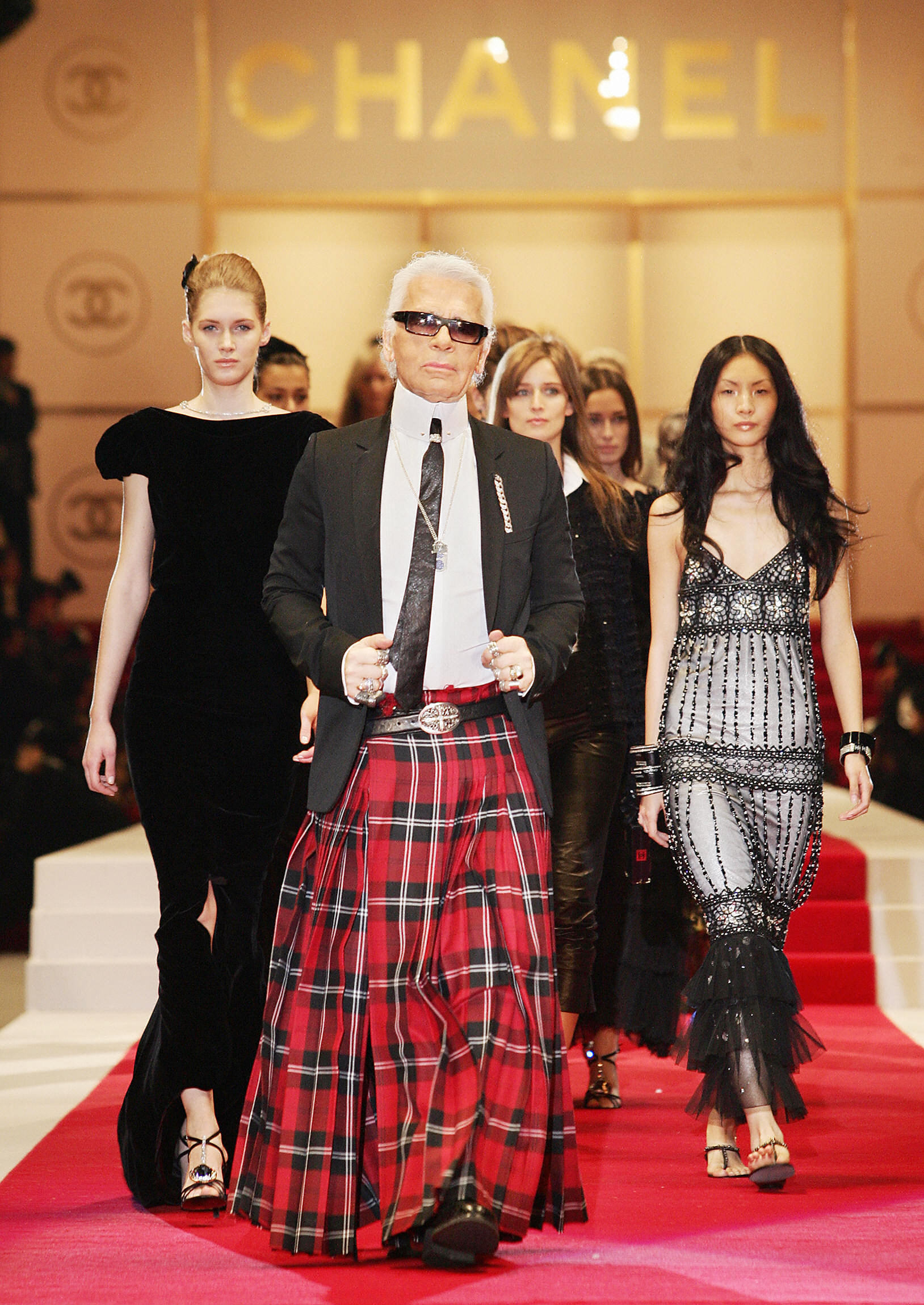 - TOKYO, JAPAN: German designer Karl Lagerfeld (C) of French fashion giant Chanel walks with models during the 2005 spring/summer pret-a-porter collection at a makeshift auditorium at Hibiya Park in downtown Tokyo, 03 December 2004, on the eve of the opening of its biggest boutique in the world at the main street of Ginza shopping district. AFP PHOTO/Toru YAMANAKA (Photo credit should read TORU YAMANAKA/AFP via Getty Images)