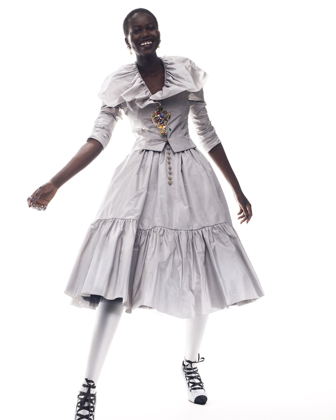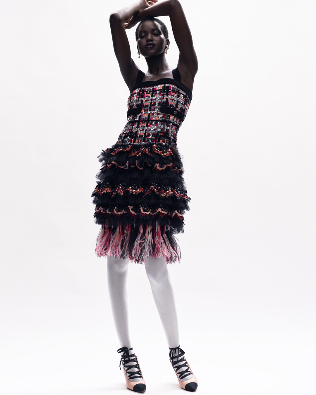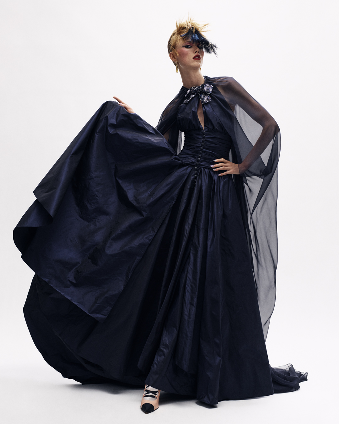 Un abito in taffetà, grandi capelli, piume e molti gioielli, questo il mood percorso dalla designer che, racconta, si ispira per la prima volta molto più a Karl Lagerfeld che a Gabrielle Chanel stessa. E in effetti Karl a “Le Palace” ci sarebbe andato proprio così, accompagnando queste principesse contemporanee sofisticate, overdressed al punto giusto ed elegantemente eccentriche. A differenza della scorsa collezione Haute Couture in cui il mood era decisamente più bucolico ed ispirato all’infanzia di Gabrielle, i capi di questo Autunno/Inverno 2020-21 hanno abbandonato la fanciullezza per vestire i panni dell’opulenza, del lusso e dei gioielli luccicanti. I gioielli sono una componente fondamentale della collezione, al punto che sono proprio quelli di alta gioielleria Chanel ed essere i veri protagonisti. Virginie Viard dichiara di aver scelto appositamente di andare controcorrente rispetto alla collezione precedente, per sfidare questa volta la complessità e la raffinatezza nella loro accezione più pura.