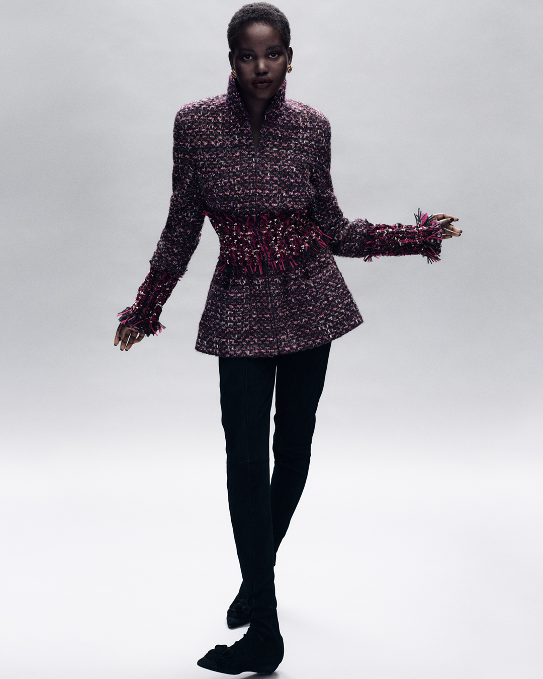 Grande protagonista è ancora una volta l’intramontabile tweed, ricamato dai famosi Métiers d’art Lesage e Montex così come da Lemarié e Goossens e impreziosito, questa volta, da paillettes, strass, pietre e perline che confermano la volontà all’esagerazione di questa ultima Haute Couture. I completi tipicamente androgini vengono resi iper femminili da trecce a forma di diamante che adornano i pantaloni, mescolandosi ad abiti corti dalla vita stretta e iconiche gonne corolle. Accanto ad essi gli intramontabili maxi dress dal fascino quasi rinascimentale e tipico delle donne che hanno fatto della rivoluzione un motto. Più che alla Francia, sembra sia stata l’arte tedesca a influenzare Virginie, che conferma ancora la volontà di sentirsi sempre più vicina al maestro Karl. Lampi di rosa illuminano gli intramontabili abiti neri e grigio antracite e i lacci dipinti arricchiscono le giacche bolero. Fili di lurex danno carattere al tweed così come a texture più semplici come la lana e il cotone, mentre gli accessori riprendono la moda punk-rock per ingentilirla come soloChanel sa fare. Romantica ed eccentrica, la donna Chanel Haute Couture del prossimo inverno è un mix di contraddizioni, è l’insieme delle diverse facce di una stessa medaglia: quella dell’amore incondizionato in tutte le sue forme.