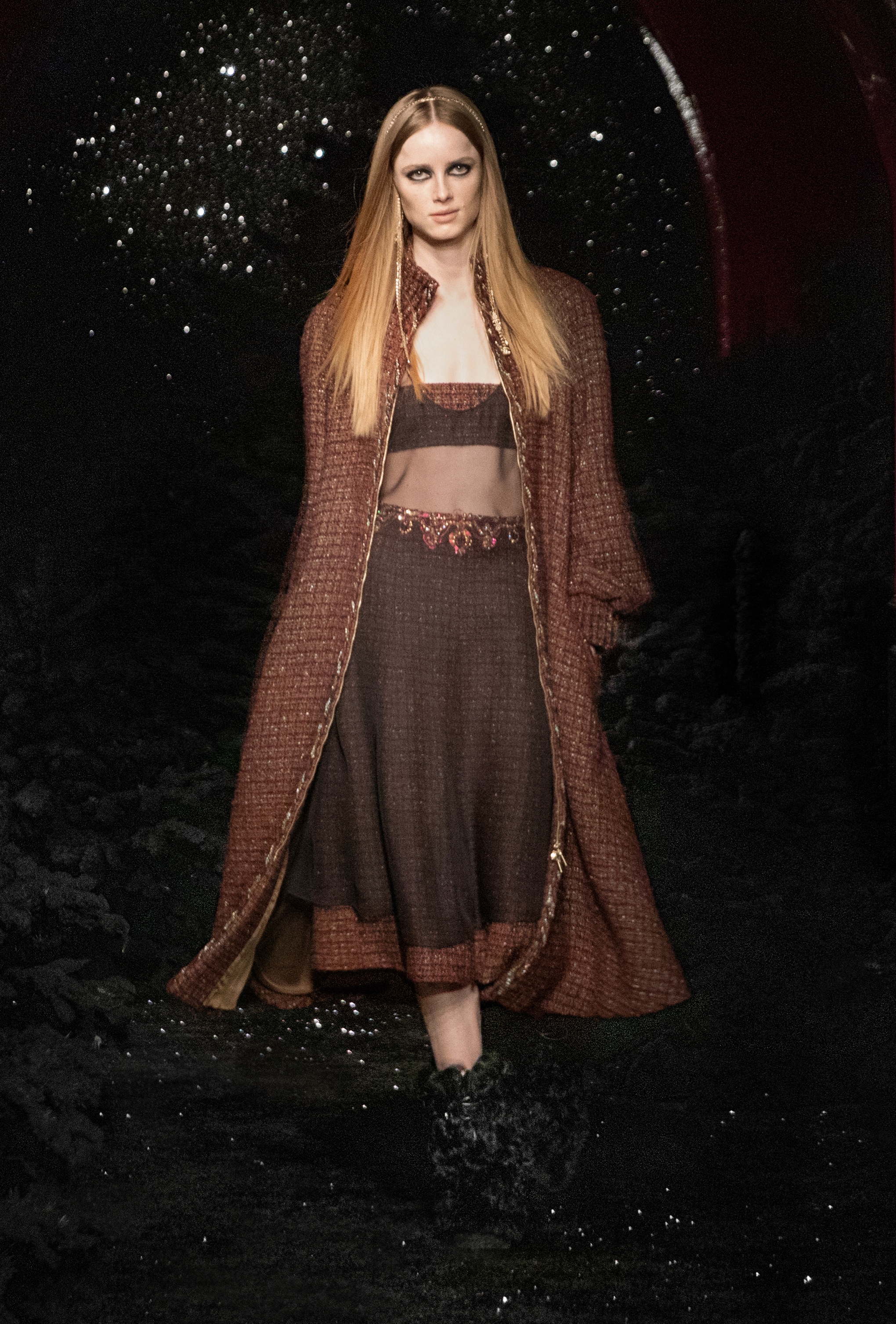 I contrasti sono i protagonisti non solo del mood dell’intero corto ma della collezione in sé, che mixa volumi, materiali e spirito. Il tweed è un grande protagonista della collezione, rivisitato in chiave più comfy e avvolgente, su cappotti oversize dal fit rilassato, oppure su completi coordinati abbellito da fili di lurex. I vestiti hanno tutti bretelle sottili e texture trasparenti che lasciano intravedere bra sofisticati e corpetti aderenti in pizzo e paillettes. La grande novità della collezione sono le salopette-tute trapuntate, che ricordano l’abbigliamento da snow, con motivi rossi e blu oppure in tweed fucsia, indossate con sandali con il cinturino impreziositi da catene e fiocchetti neri o décolleté adornate da una camelia. Le bluse in chiffon o crêpe de Chine si accostano a pezzi ispirati allo sportswear invernale, come pantaloni ampi con tasche laterali e giacche crop in tweed da indossare con stivali in pelliccia ecologica. A strizzare l’occhio all’abbigliamento da neve sono anche i capispalla, declinati in trench in nylon e trapuntati, in pellicce ecologiche cropped e puffer jackets oversize e smanicati. Le palette di colori giocano con le nuance care alla maison: rosso, blu, fuchsia e nero si intrecciano a pattern multicolor e outfit total lilla.