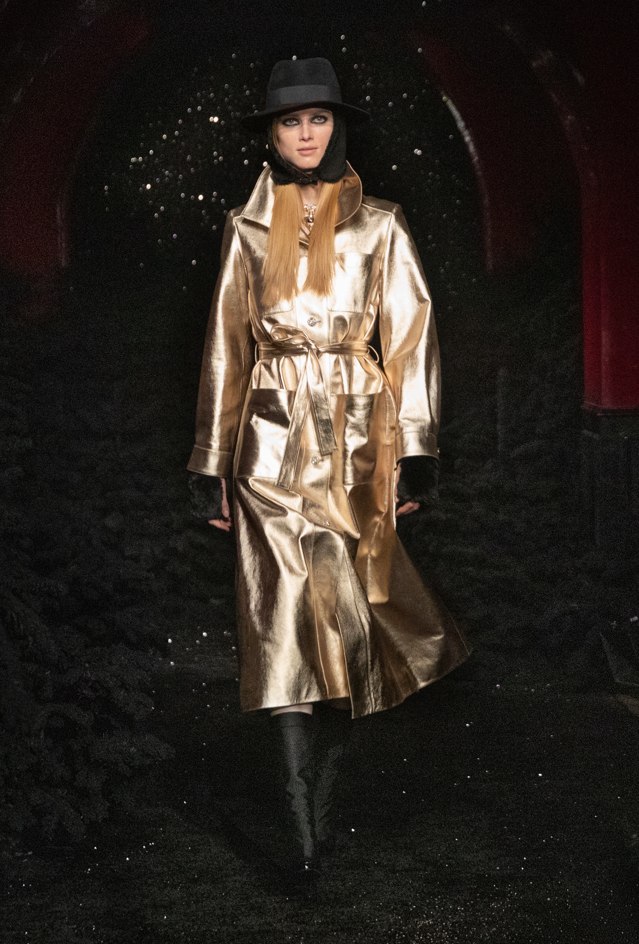 Gli accessori sono il dettaglio che ingentilisce i look e li ricollega all’iconico stile Chanel: fili di perle danno vita a collane sautoir, colletti oversize ingentiliscono i maglioni oversize e catene da indossare al collo, in vita, o a mo’ di giarrettiera completano i look. Le iconiche borse Chanel si vestono di texture metallizzate e colori inediti come il blu e il fuchsia, mentre i cappelli diventano beanie in lana abbelliti dai simboli emblematici della maison: camelie e spille con doppia C. A chiudere la sfilata un omaggio allo stile di Karl Lagerfeld: le modelle camminano in strada insieme assieme a Virginie Viard, che saluta il pubblico digitale estasiato da una collezione che mixa le atmosfere delle vacanze sulla neve, alla già classica idea di cool-chic parigino.
