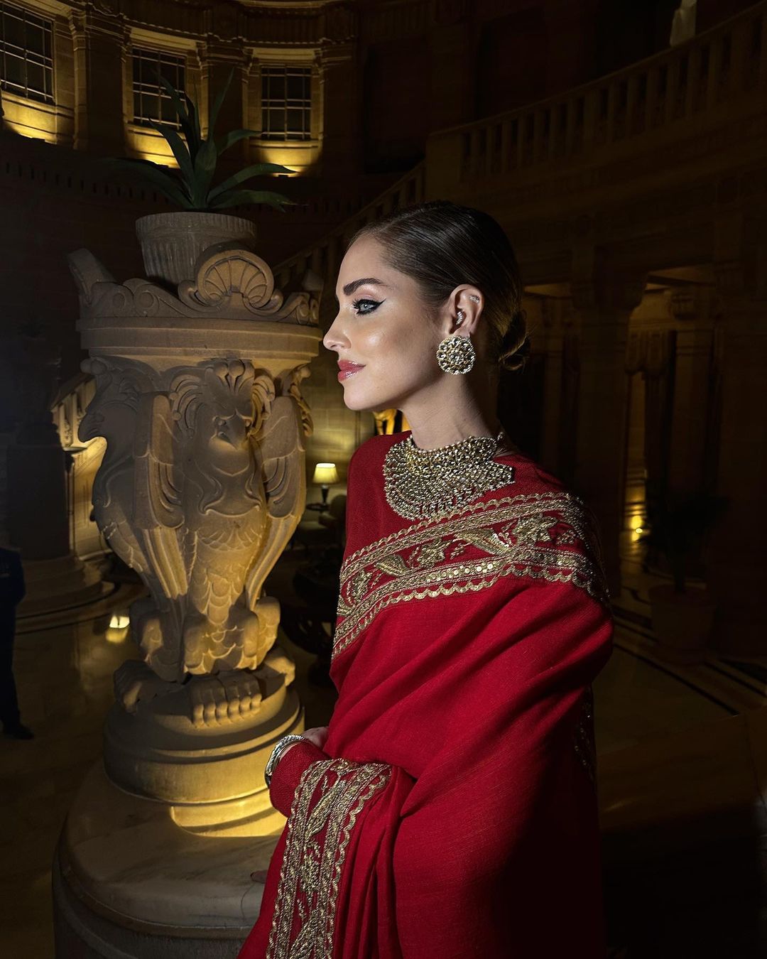 Chiara Ferragni continua il suo viaggio alla scoperta delle meraviglie dell’India. Per la sua notte a Jodhpur ha voluto celebrare la cultura e la storia indiana indossando un sari realizzato da Sabyasachi. Due donne hanno aiutato Chiara nel momento della vestizione, raccontandole la storia e come nasce questo tradizionale indumento. Le origini del sari risalgono al 100 a.C. ed è uno dei pochissimi indumenti ad essere stato tramandato per così tanti secoli, consiste in una fascia di stoffa larga circa un metro, la cui lunghezza può variare dai quattro ai nove metri, che viene avvolta intorno al corpo dell’indossatrice con metodi che variano a seconda della sua funzione. Lo stile più comune di indossare il sari è lo stile Nivi e consiste nell’avvolgerlo intorno alla vita con un’estremità che gira intorno alla spalla. Il sari viene indossato sopra ad una sottogonna e una camicetta corta chiamata choli. Le decorazioni della stoffa invece variano a seconda delle diverse religioni.