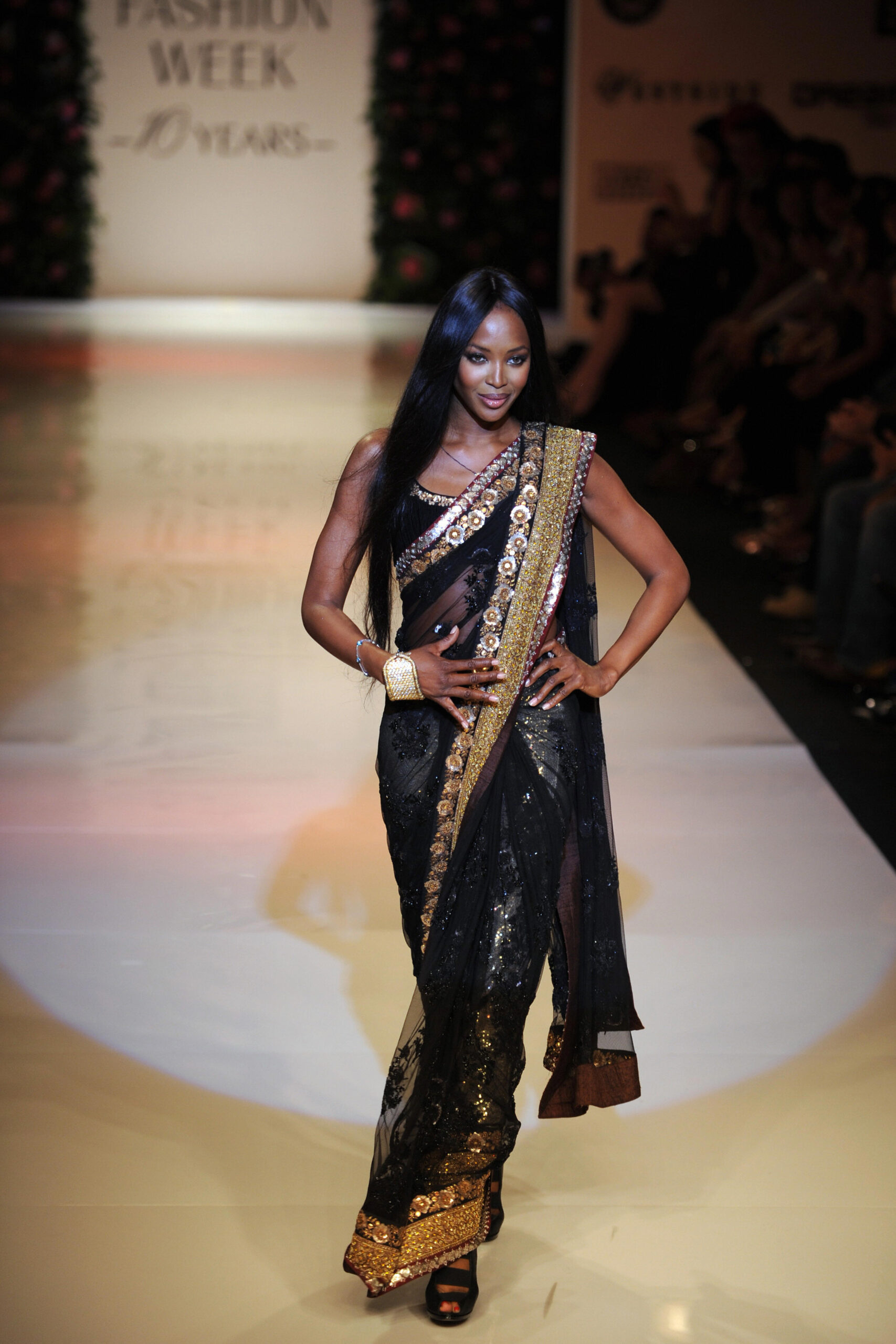 - International model Naomi Campbell walks the ramp for ‘Mai Mumbai’ – My Mumbai – a charity show at the Lakme Fashion Week (LFW) in Mumbai on March 28, 2009. Campbell, along with other Bollywood celebrities walked the ramp to pay tribute to the last year’s 26/11 terror attack victims in Mumbai. Some 65 designers are unveilling their fall/winter collections during the five-day long fashion week in the western Indian city which continues until March 31. AFP PHOTO/ Pal PILLAI (Photo credit should read PAL PILLAI/AFP via Getty Images)