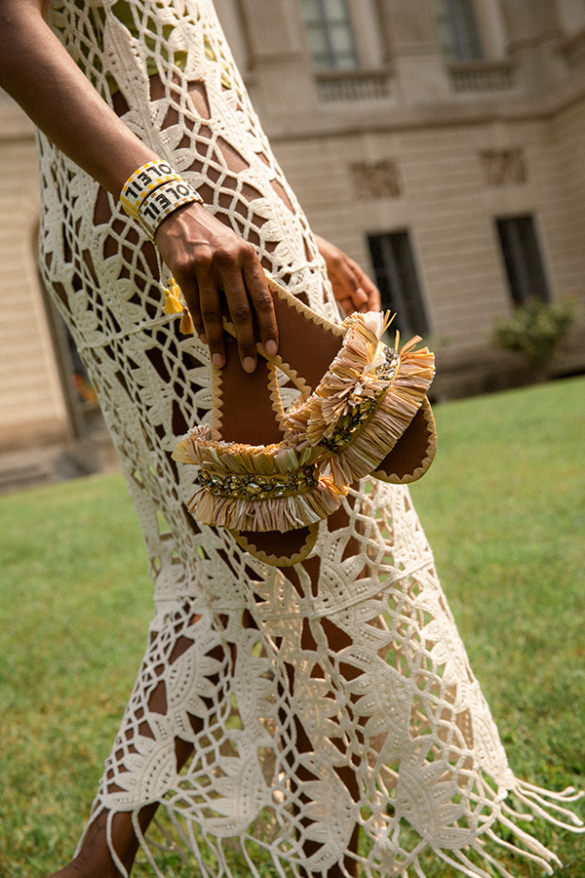 Ecco che così sulle ciabattine in rafia abbinata ai colori naturali delle serate estive, della sabbia e dei pomeriggi di sole, compaiono conchiglie, cristalli, paillettes e piume in un crescendo creativo carico di tutta l’allegria della stagione più bella. Le borse completano la proposta e sono realizzate in rafia tutta intrecciata a mano con punto crochet con ricami e applicazioni, possono essere indossate coordinando i colori delle ciabattine o scegliendo differenti nuance per un irresistibile turbine di colore.