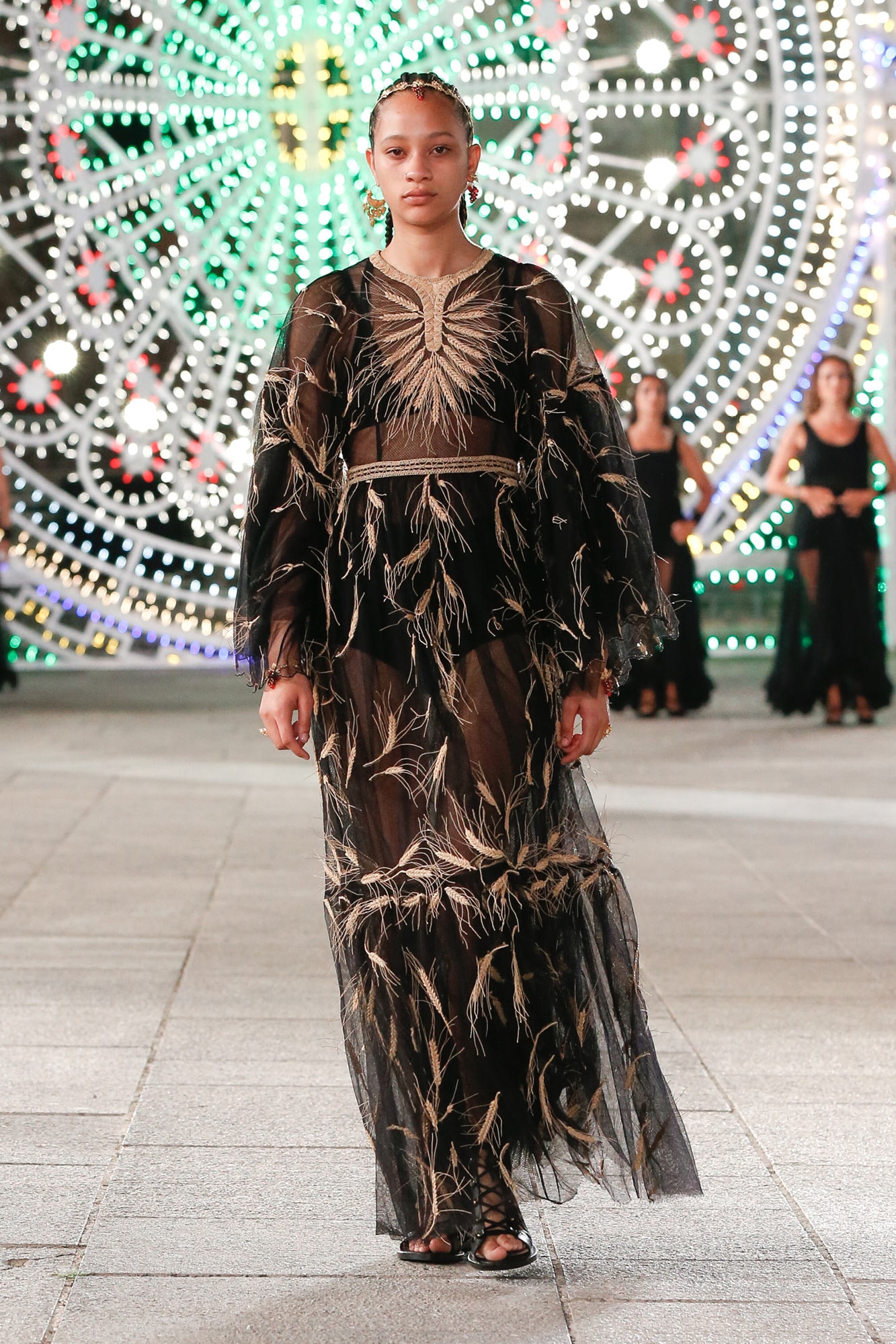 È proprio a loro che vorremmo dedicare il nostro omaggio: a Le Costantine, maestre del ricamo del pizzo tombolo, che ha decorato meravigliosamente i look di sfilata portando al mondo una tradizione tessile fatta di tecniche ancestrali custodite, come un segreto, nelle sapienti mani delle donne del sud Italia; alle luminarie dei Fratelli Parisi, così iconiche e inimitabili, che hanno donato un po’ della loro tradizione pugliese al servizio della moda per far scendere in Piazza del Duomo un arcobaleno che non si può ammirare altrove; alle ceramiche dipinte a mano da Agostino Branca e a tutti coloro che hanno reso questo evento indimenticabile.